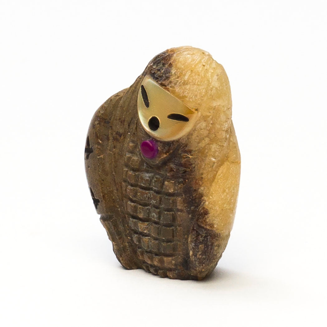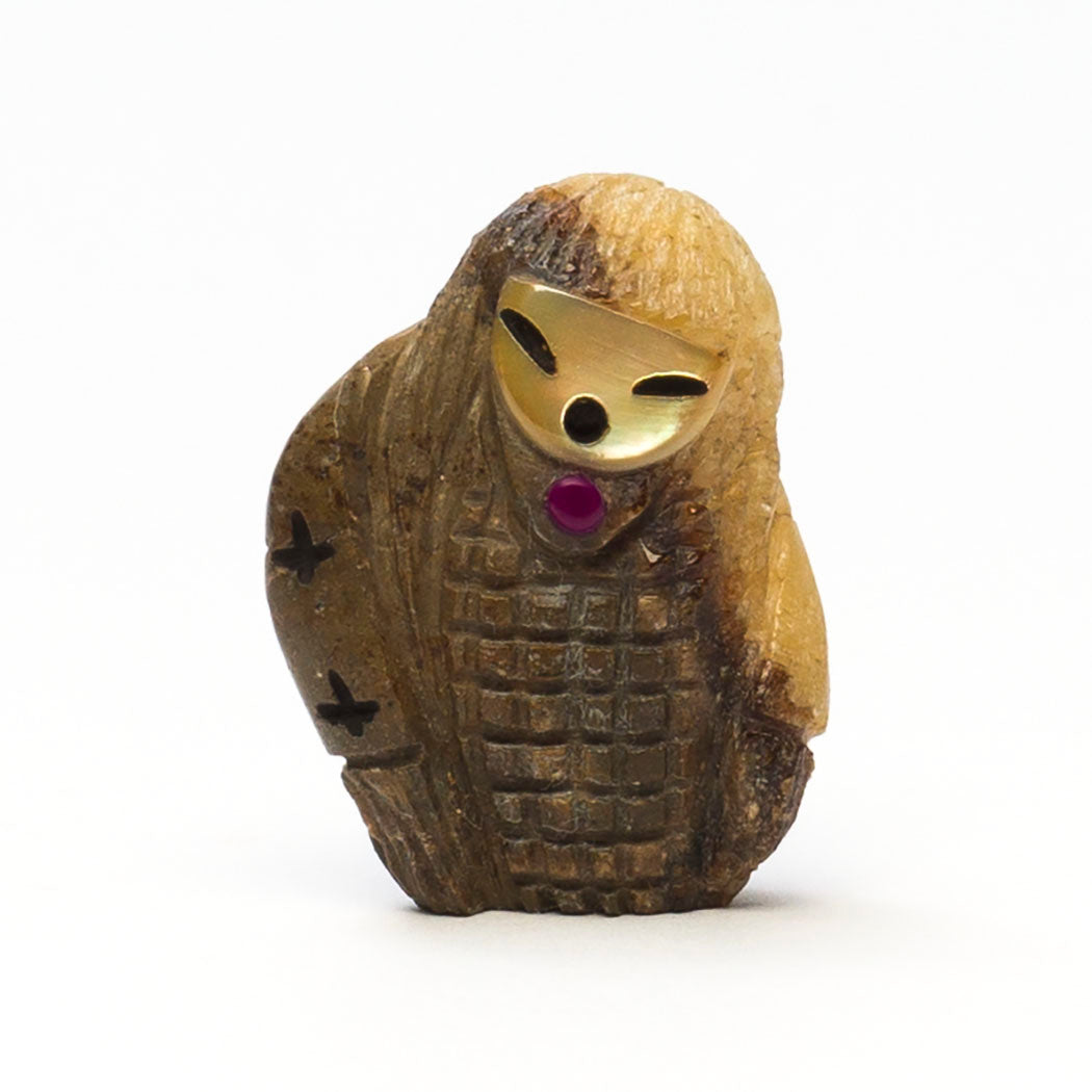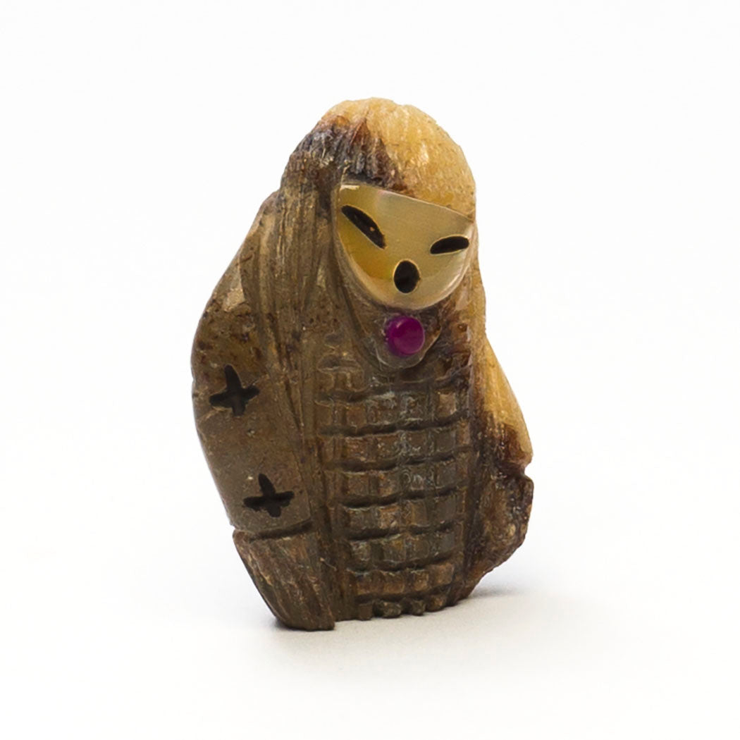 Kateri Quandelacy Sanchez's lovely Corn-Maiden is carved from a wonderful septarian nodule specimen to a dimension of approximately 1 1/2" tall, 1 1/8" wide and 1/2" deep. Facial features are from etched gold lip shell filled with jet paste. An alunite inlay compliments the rock in an attractive manner.