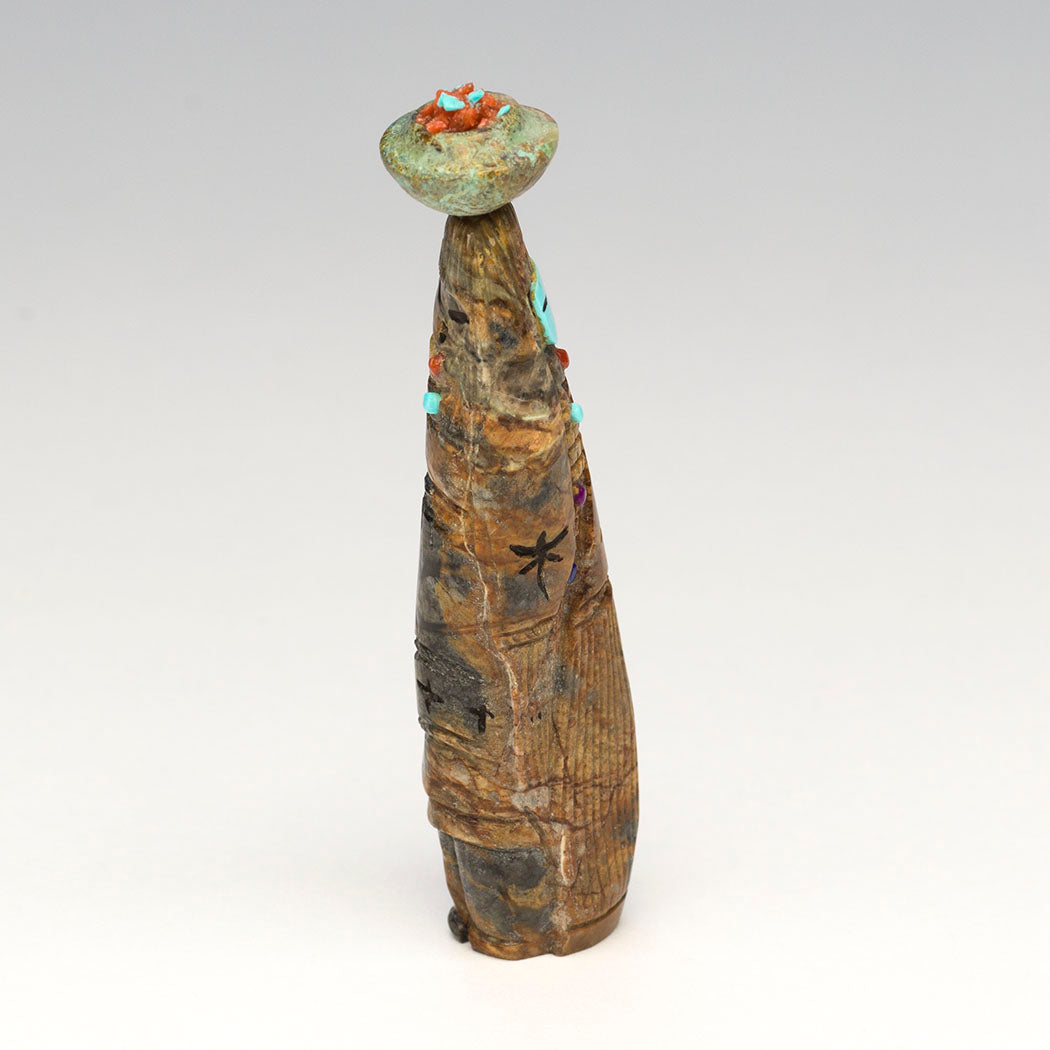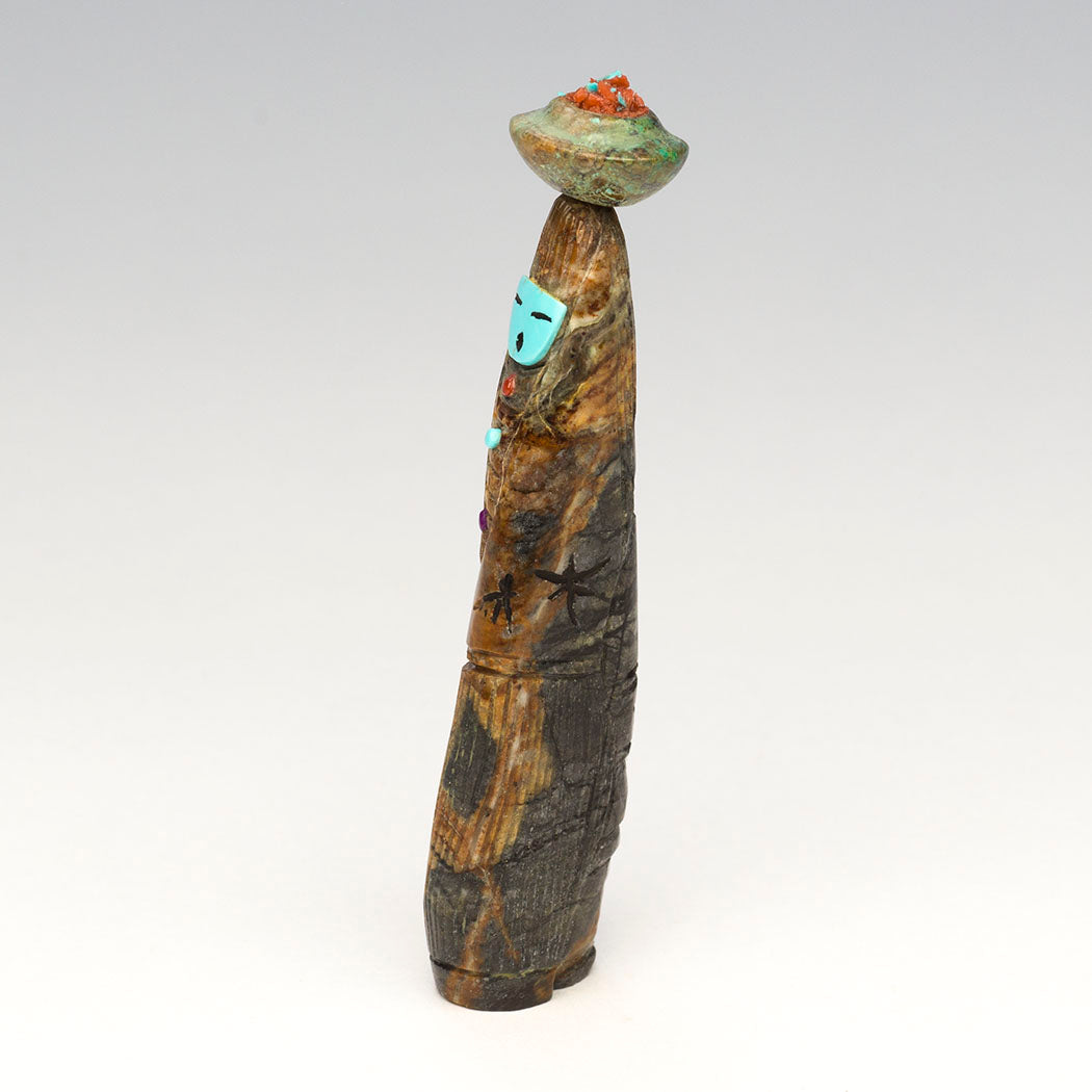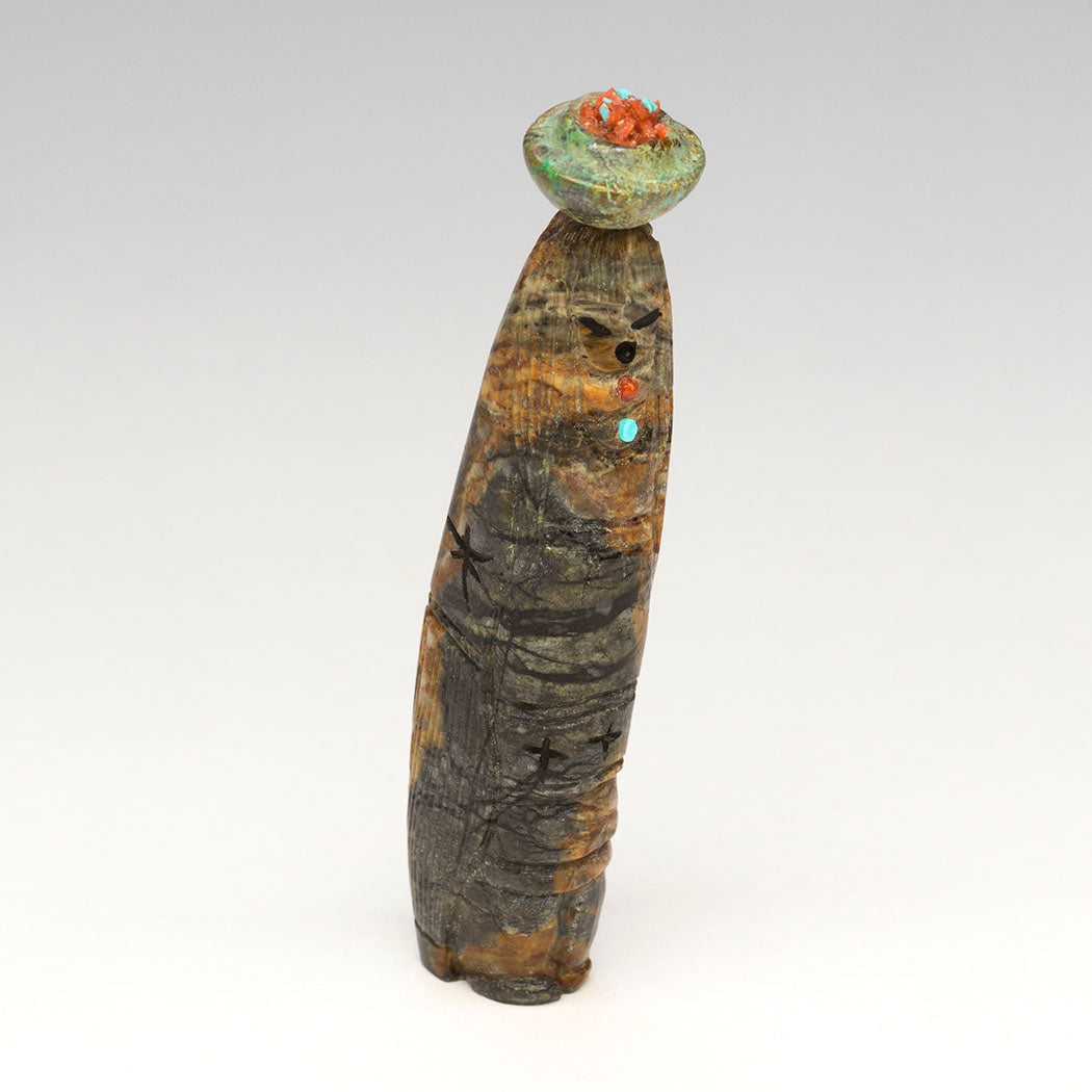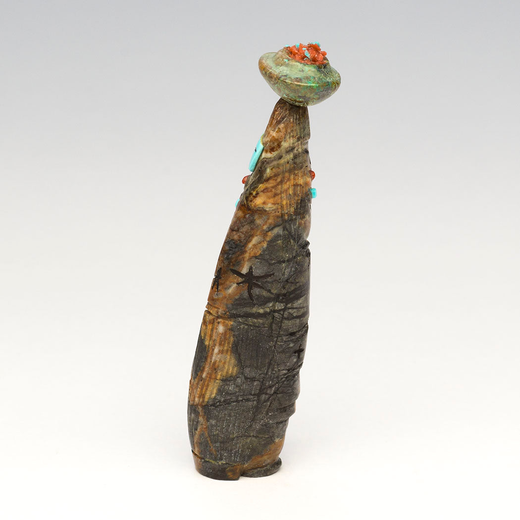 In the old days Zuni women retrieved and carried water for daily needs by filling large beautiful pottery jars called ollas and gracefully balancing them on their heads. Here Corn-Maiden and Grandmother share the workload. A sculpted olla jar from turquoise holds crushed turquoise to represent life-giving water. Bits of red coral are present too. Corn Maiden's face is from overlaid turquoise with jet paste. Incised Dragonflies adorn them as do colorful accents from red coral, turquoise, alunite and lapis lazuli. A lovely reversible Picasso marble carving by Sandra Quandelacy that measures about 3 1/8" tall, 1/2" wide and 7/8" deep.