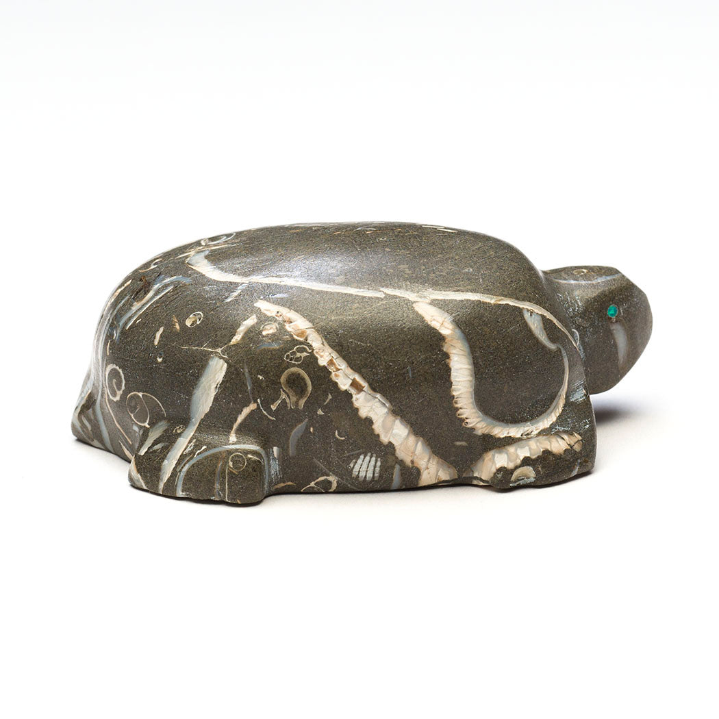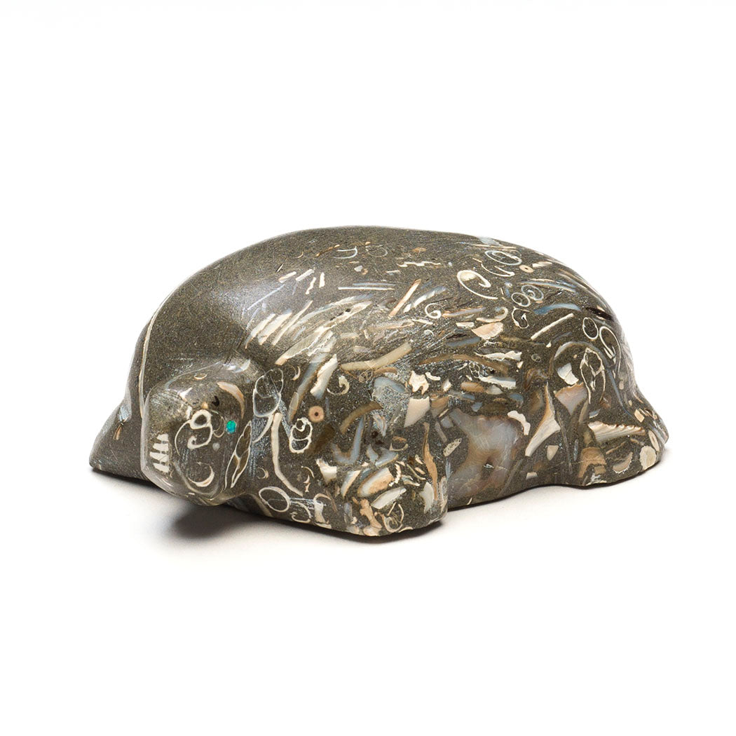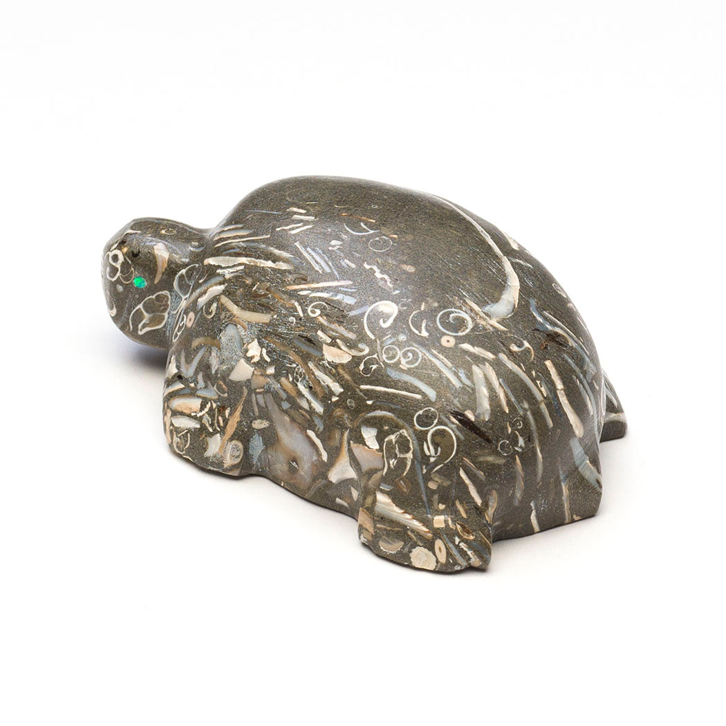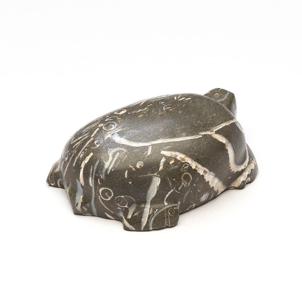 Carved from Purisima fossil stone, this gorgeous Turtle by Daryl Shack, Sr., is covered in the remains of mollusks, gastropods, bivalves and other marine life from ages long past. Fossils communicate and share secrets from Mother Earth's history helping us understand the secrets of our own time. The fossil stone comes from the Purisima Formation in California and contains fossilized evidence of the ocean floor from the late Miocene to the late Pliocene epochs. When cut into and carved by talented Zuni artists like Daryl, the edges of those fossils begin to look like the scribblings of an ancient language. The cultured opal-eyed reptile is covered in beautiful fragments. By examining these fossils we see familiar shapes reminding us that the past is not as far away as it feels. About 2 7/8" long, 2" wide and 1 1/8" tall.