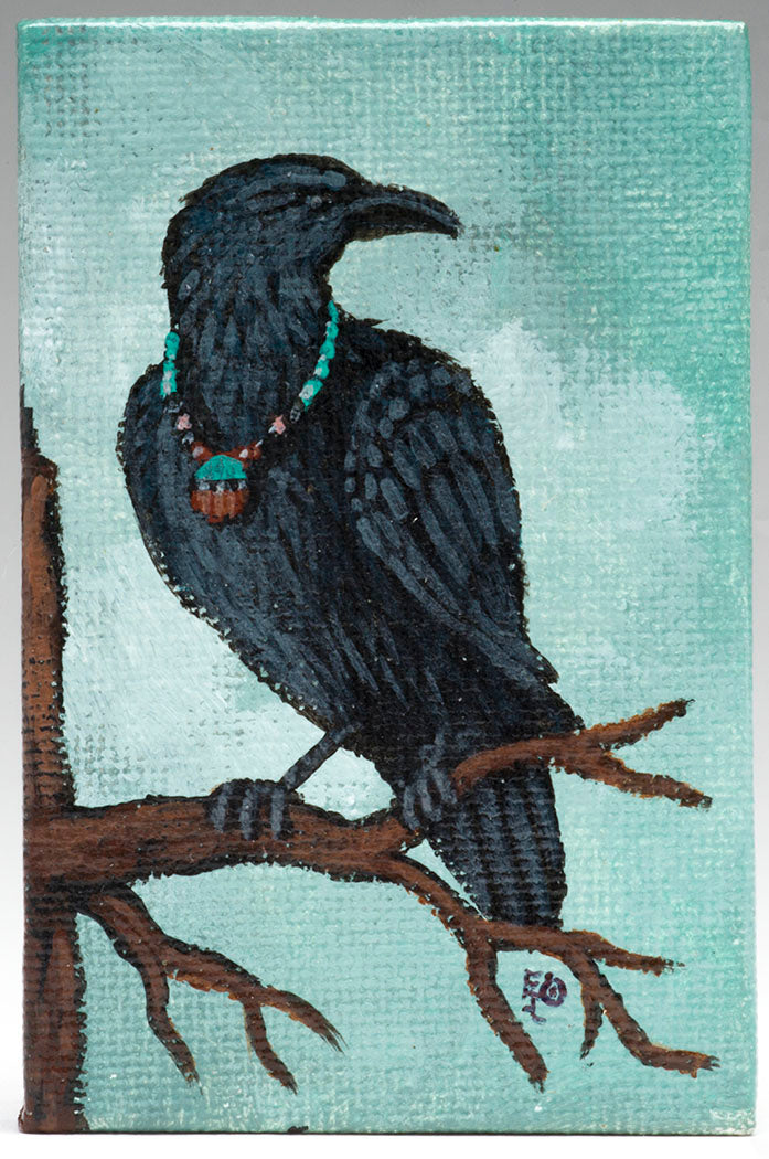Discerning and assured, Edward Lewis' Raven (or crow) perches on a trusty branch wearing a treasured necklace. This miniature and portable acrylic work is easy to display just about anywhere. We love how Edward painted the sides of this approximate 3" tall, 2" wide and 1/2" deep stretched canvas, going from a two-dimensional surface into an awesome three-dimensional one. Signed by the artist. The small wooden easel is conveniently included.