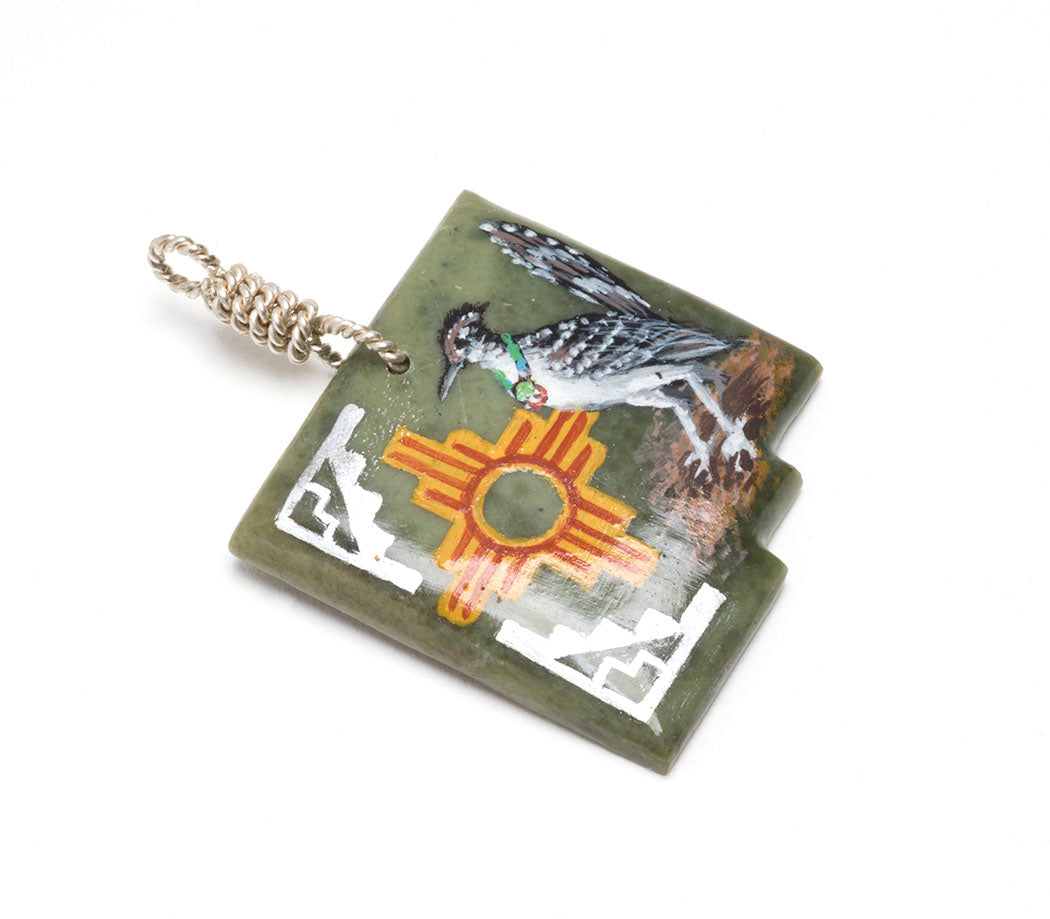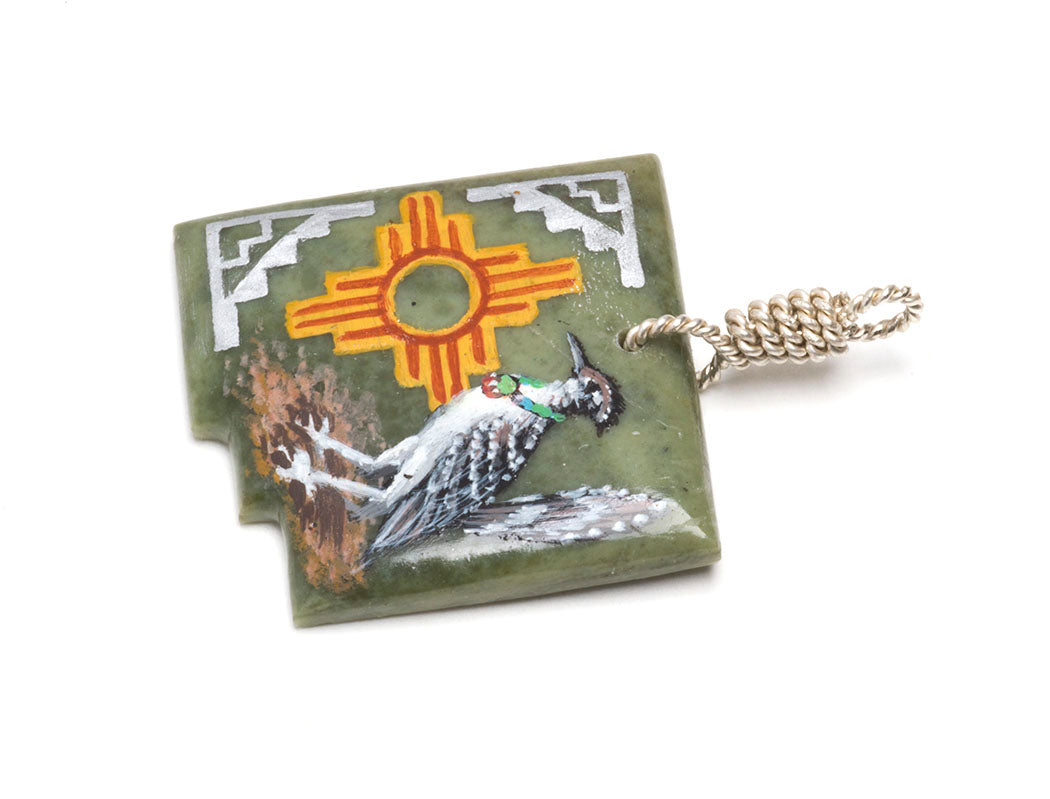 The Roadrunner is the official state bird of the Land of Enchantment. The sacred Zia symbol originates at Zia Pueblo and represents the Four Directions in life. It's also on New Mexico's state flag. Zuni Pueblo artist Edward Lewis harmoniously brought together these iconic elements in a carved serpentine pendant in the shape of the state of New Mexico. A feisty and quick roadrunner along with the Zia design are represented in colorful acrylics painted by Edward. Including the lovely silver twisted bale, it's about 2 1/4" long and 1 1/2" wide. Signed by the artist. The silver snake chain is not included but is available and sold separately here.