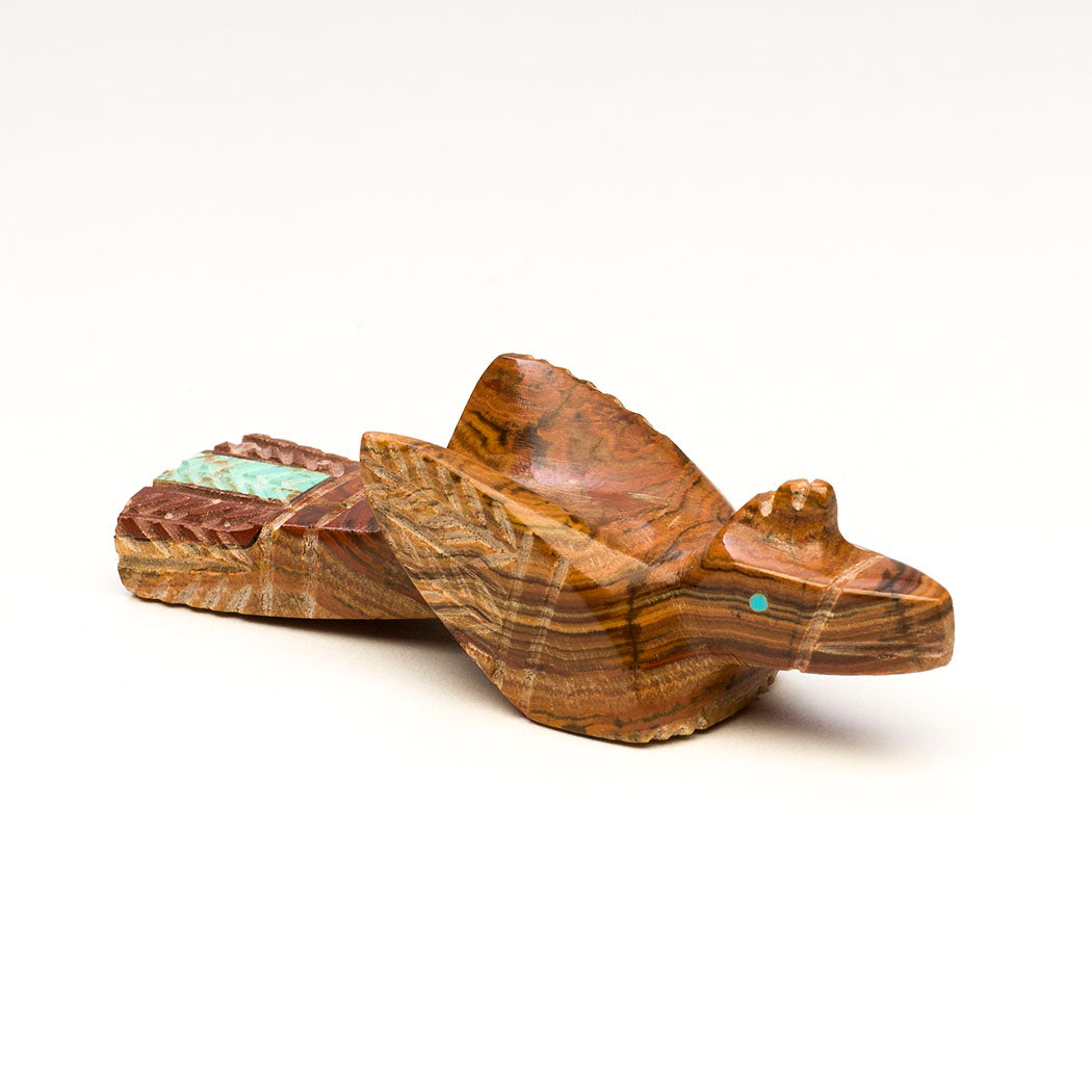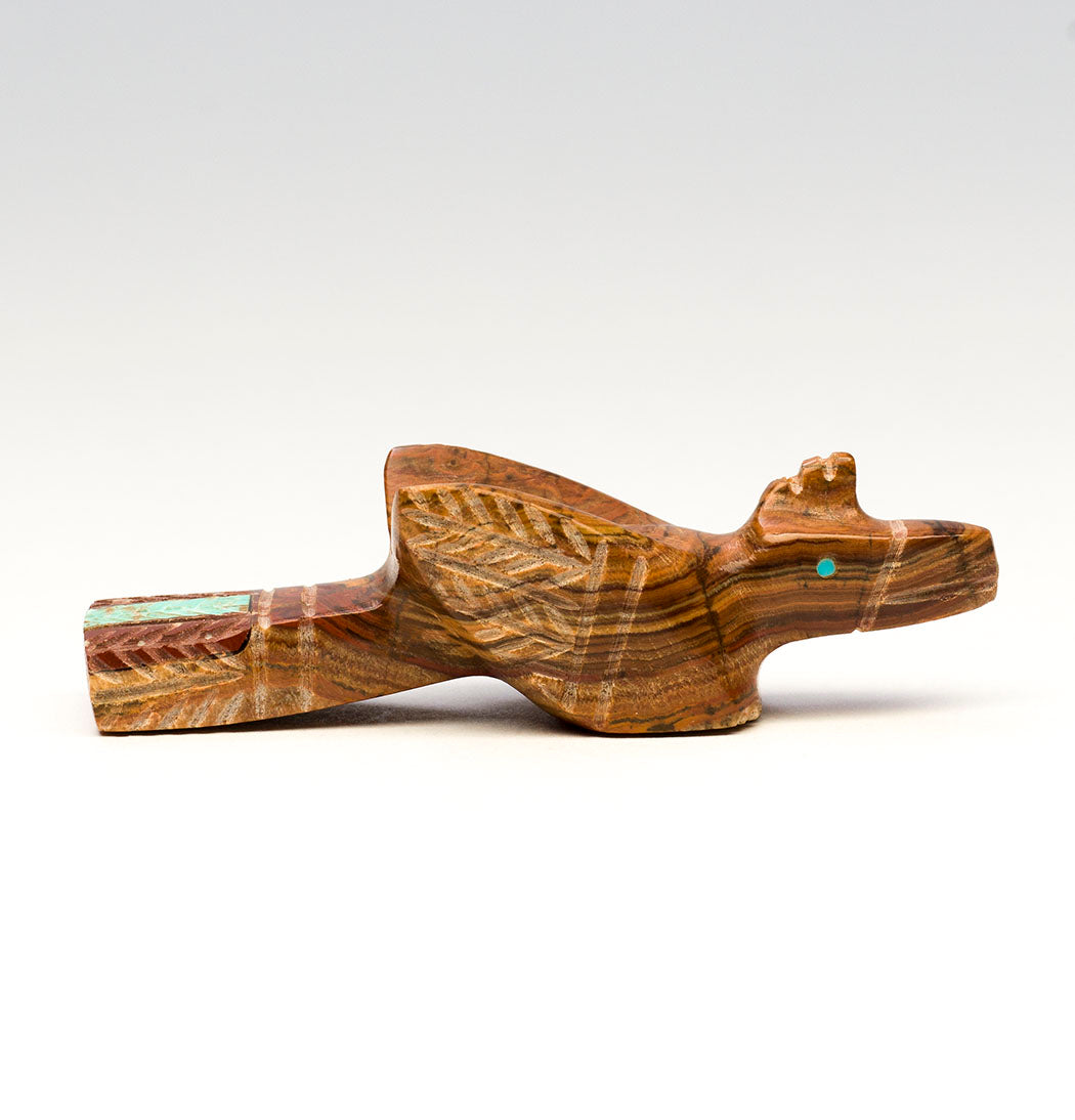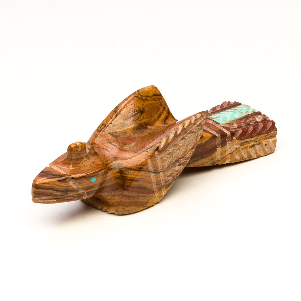 Hummingbirds migrate for the winter. Perhaps when we hear the word migrate, we think of a flock of birds traveling together. But the tough little hummingbird makes this journey solo, quite an amazing feat. In a bittersweet farewell, we look forward to their enchanted return in the warm season to open our hearts. Carved from onyx, inlaid with turquoise eyes and an iridescent mother-of-pearl beak, Brandon Phillips' mighty bird is approximately 2 1/2" tall, 1/2" wide and 1 3/8" deep. Plumage is trimmed with little etching marks.
