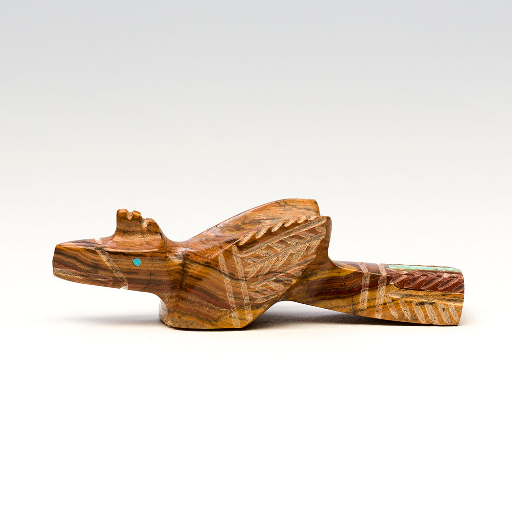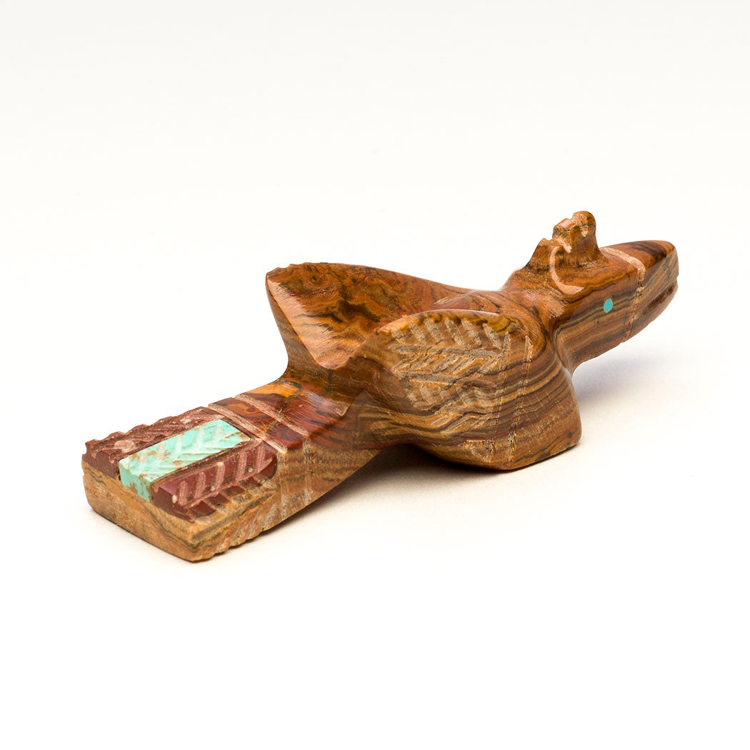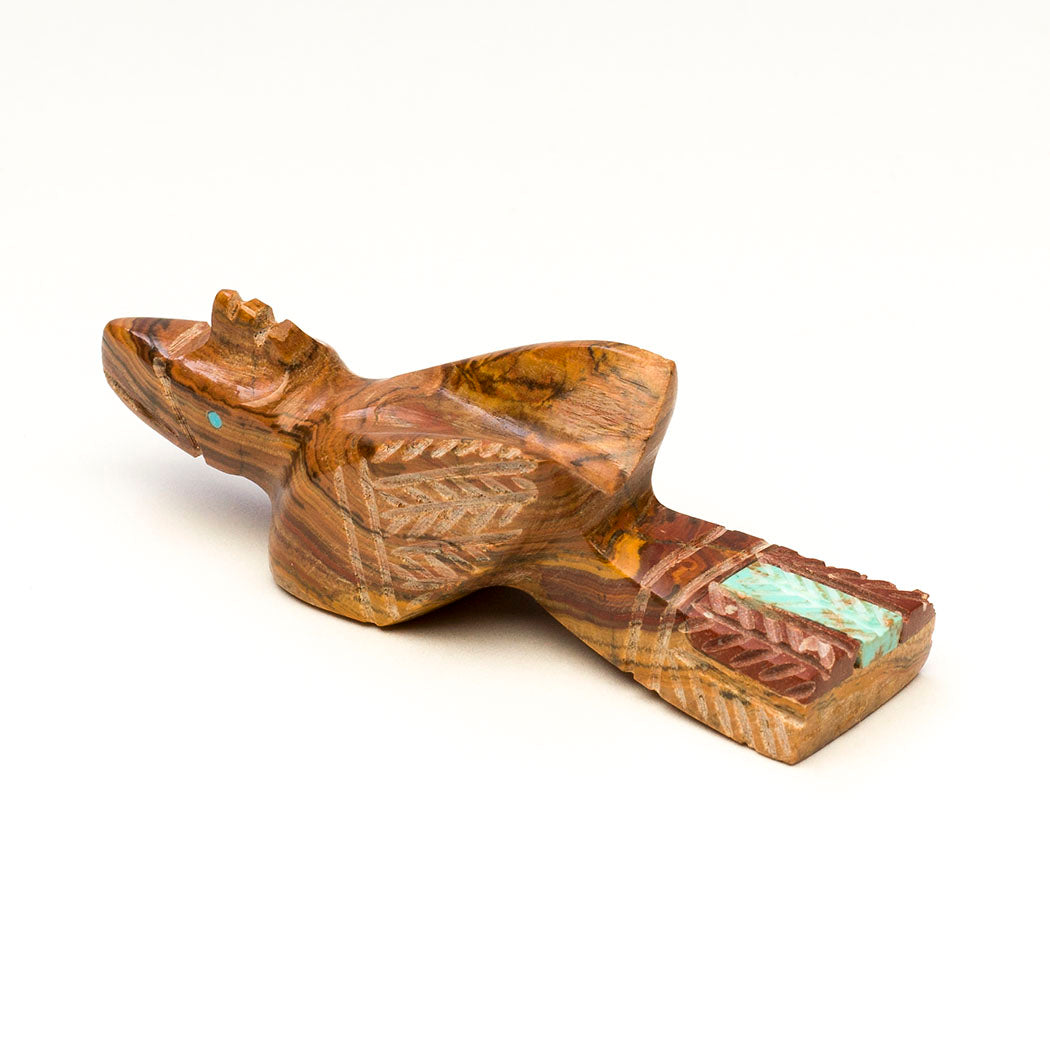 Hummingbirds migrate for the winter. Perhaps when we hear the word migrate, we think of a flock of birds traveling together. But the tough little hummingbird makes this journey solo, quite an amazing feat. In a bittersweet farewell, we look forward to their enchanted return in the warm season to open our hearts. Carved from onyx, inlaid with turquoise eyes and an iridescent mother-of-pearl beak, Brandon Phillips' mighty bird is approximately 2 1/2" tall, 1/2" wide and 1 3/8" deep. Plumage is trimmed with little etching marks.