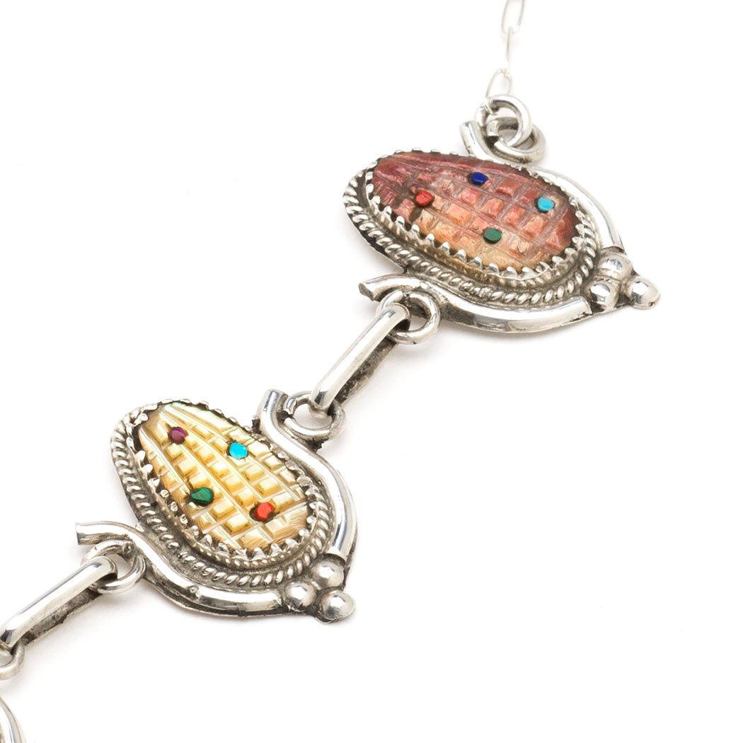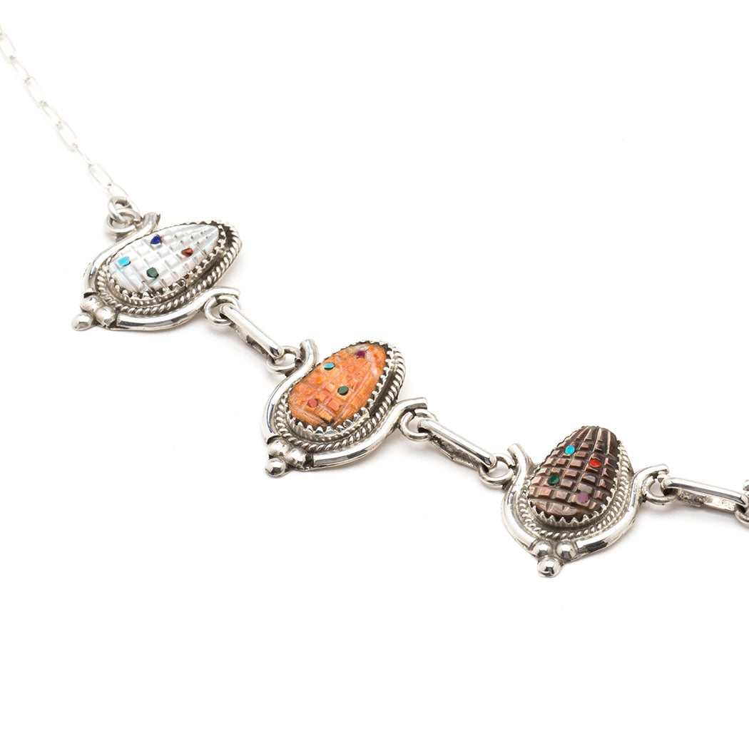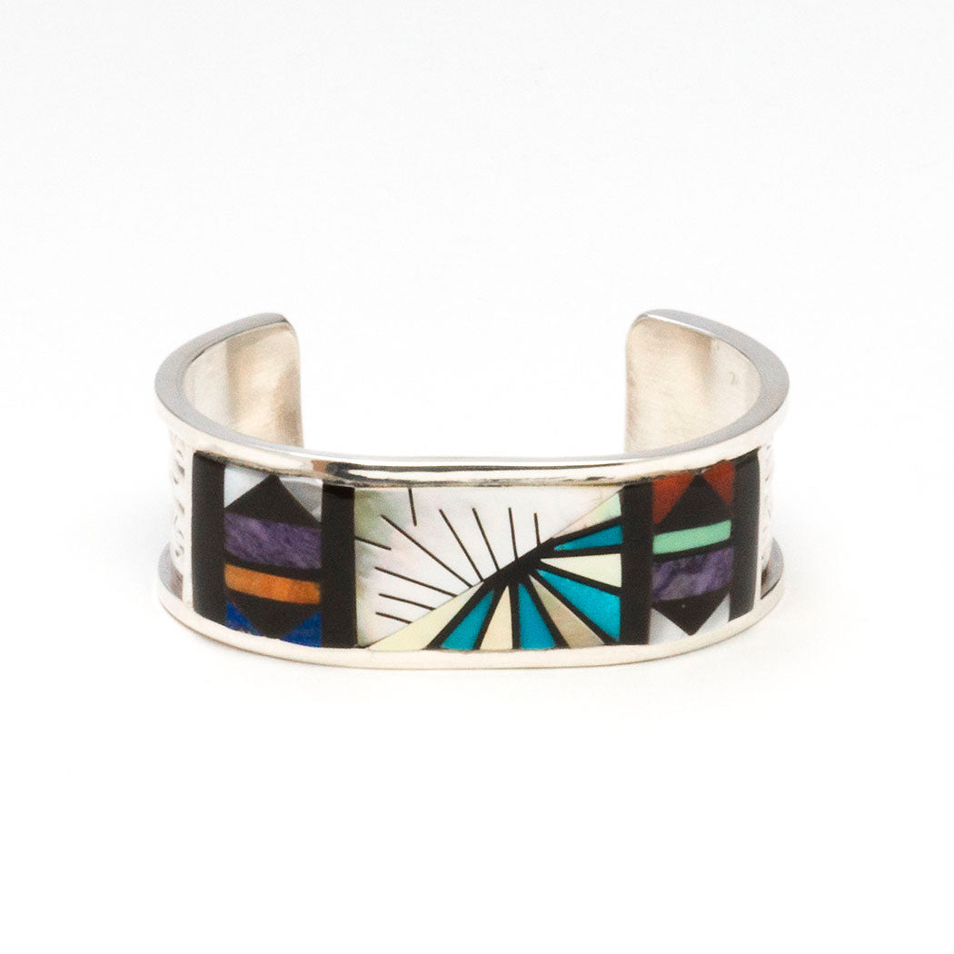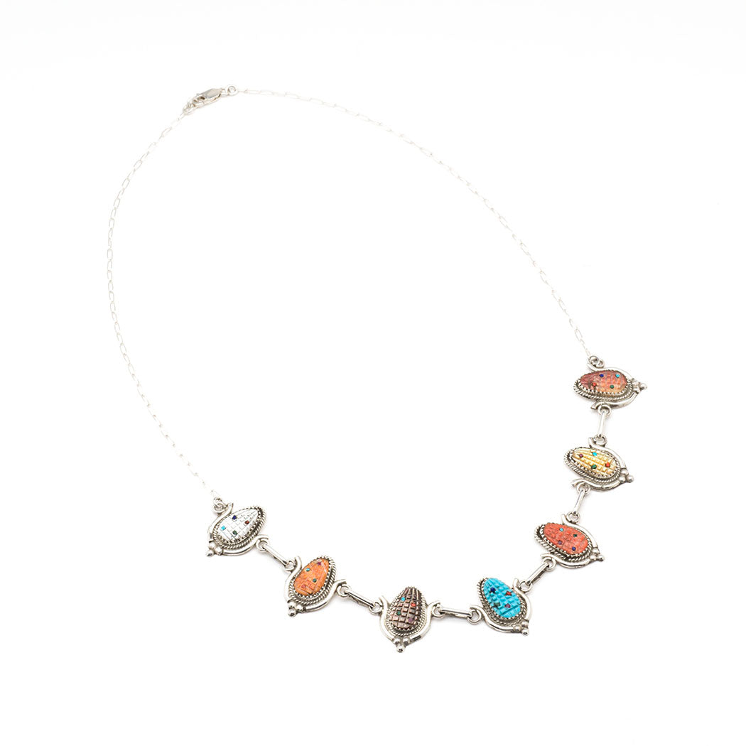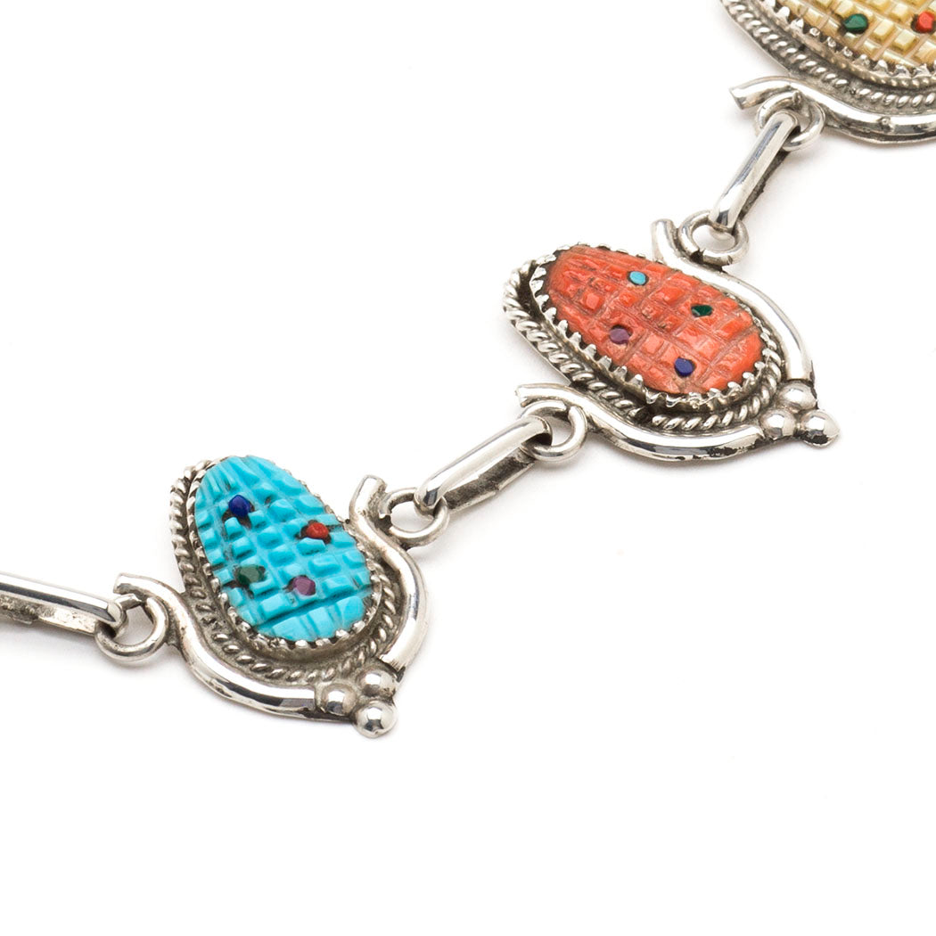 The Zunis are famous for a particular type of stonework called inlay. Here stones are worked and then fit together, sometimes side by side, called stone-to-stone, or with silver channels in between, known as channel inlay. Zuni silversmiths generally do not cast the silver. Each piece is meticulously fabricated. The predominant colors and stones used in traditional Zuni inlay are turquoise, red coral, black jet, and white mother of pearl. Symbolically, red represents Mother Earth and turquoise Father Sky. The black and white of the other stones is a further representation of dualities. Other stones that may be used in Zuni jewelry are pink coral, abalone, green snail shell, orange or purple spiny oyster, melon shell, and fossilized ivory. Currently, most materials used in Zuni fetishes and jewelry are not indigenous to Zuni Pueblo.
