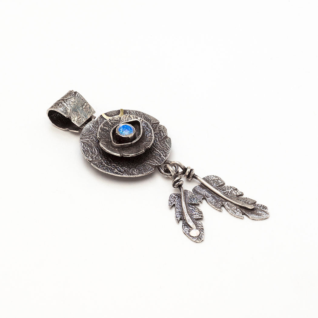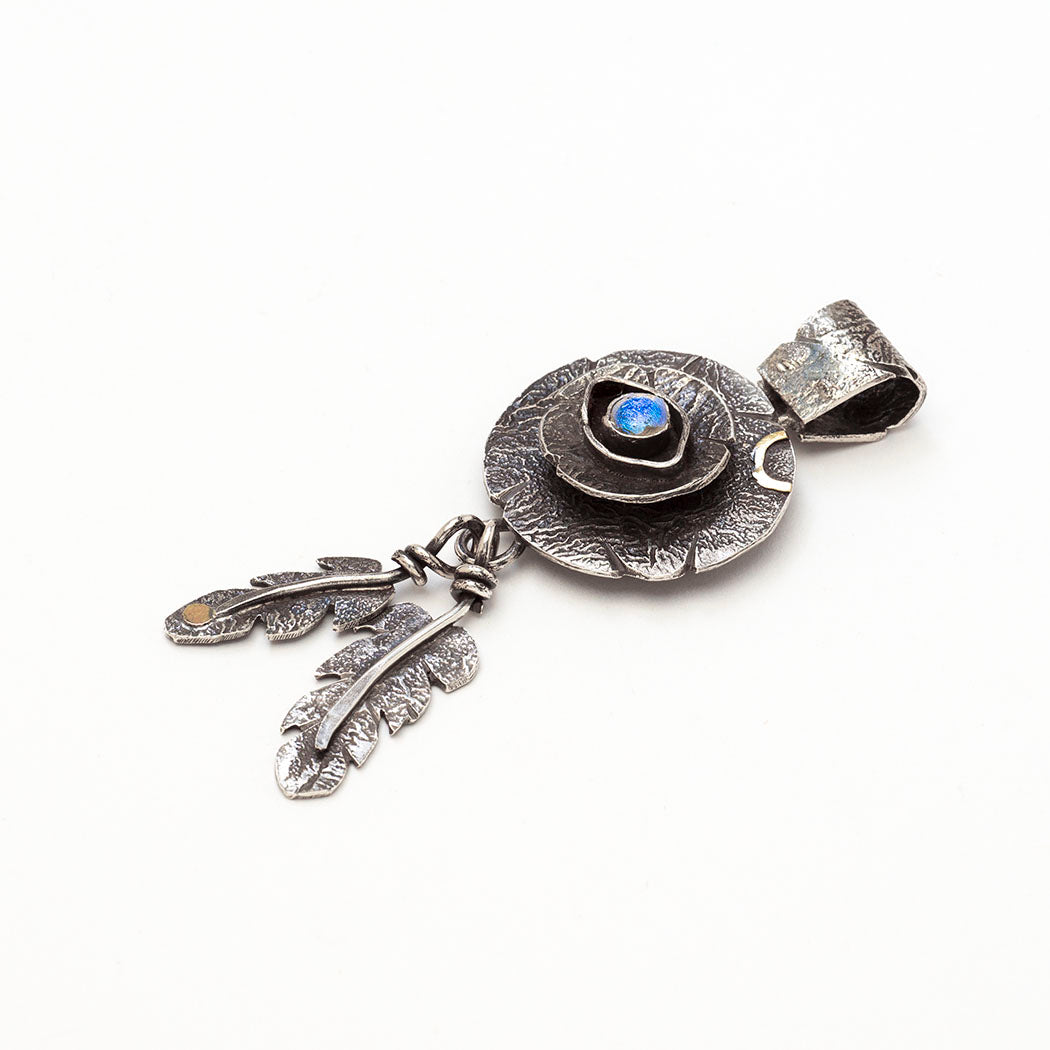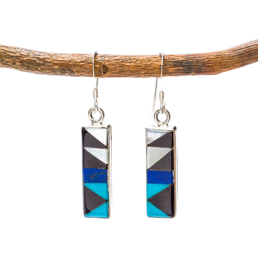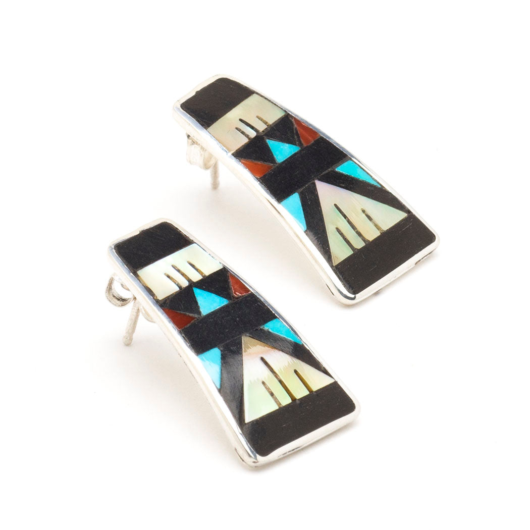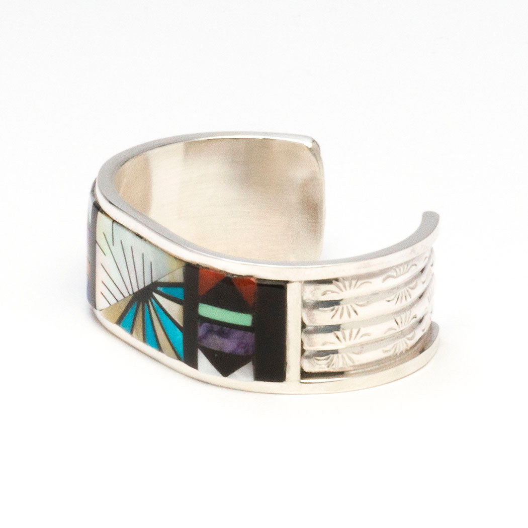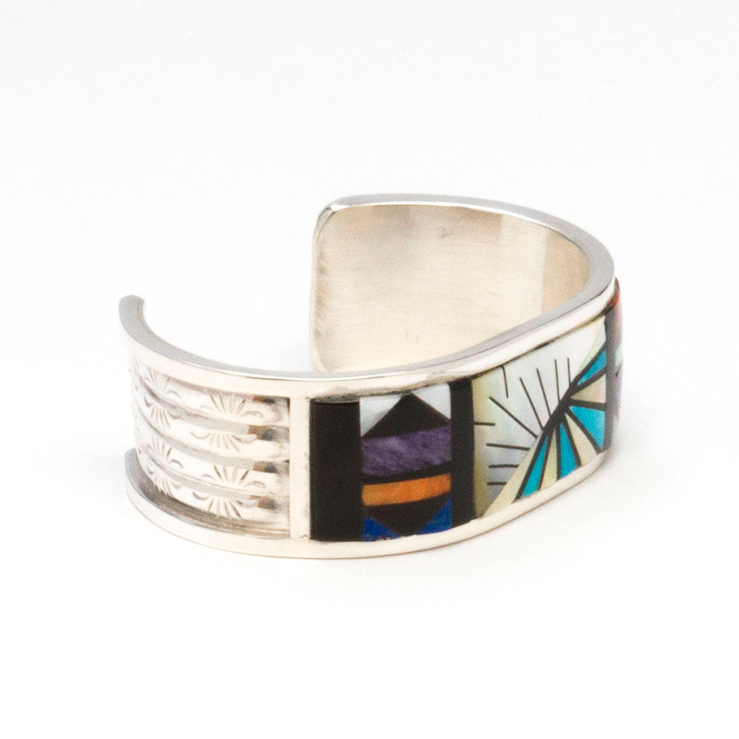 The Zunis are famous for a particular type of stonework called inlay. Here stones are worked and then fit together, sometimes side by side, called stone-to-stone, or with silver channels in between, known as channel inlay. Zuni silversmiths generally do not cast the silver. Each piece is meticulously fabricated. The predominant colors and stones used in traditional Zuni inlay are turquoise, red coral, black jet, and white mother of pearl. Symbolically, red represents Mother Earth and turquoise Father Sky. The black and white of the other stones is a further representation of dualities. Other stones that may be used in Zuni jewelry are pink coral, abalone, green snail shell, orange or purple spiny oyster, melon shell, and fossilized ivory. Currently, most materials used in Zuni fetishes and jewelry are not indigenous to Zuni Pueblo.