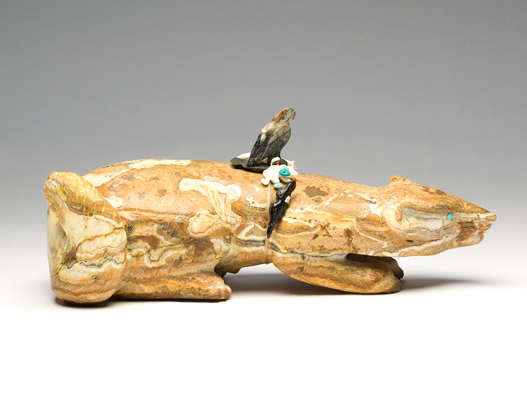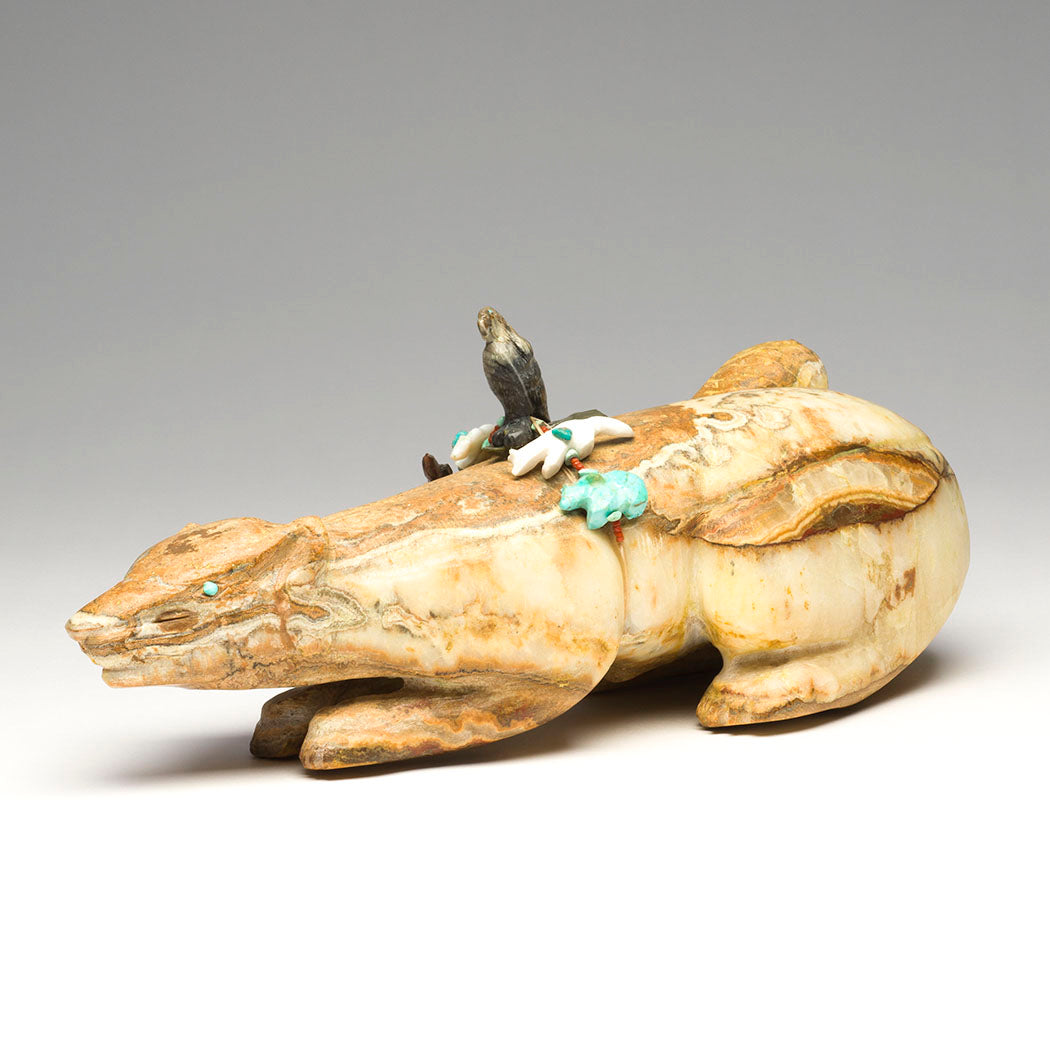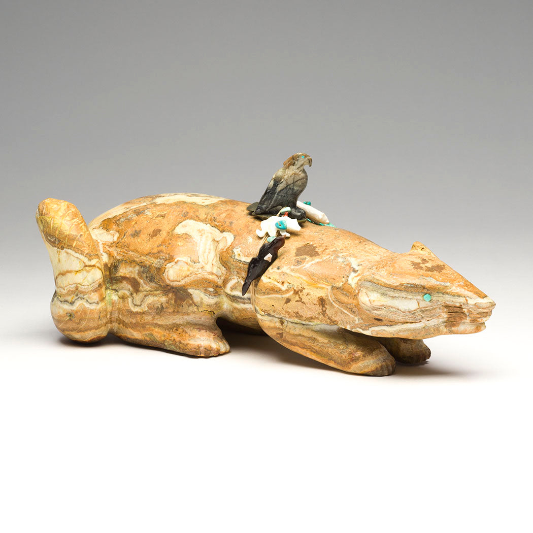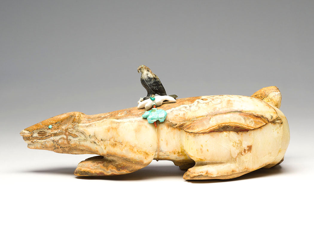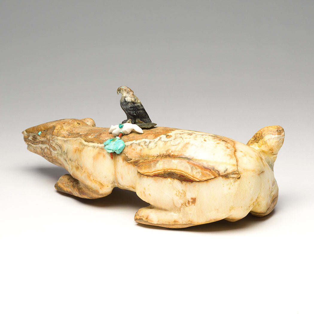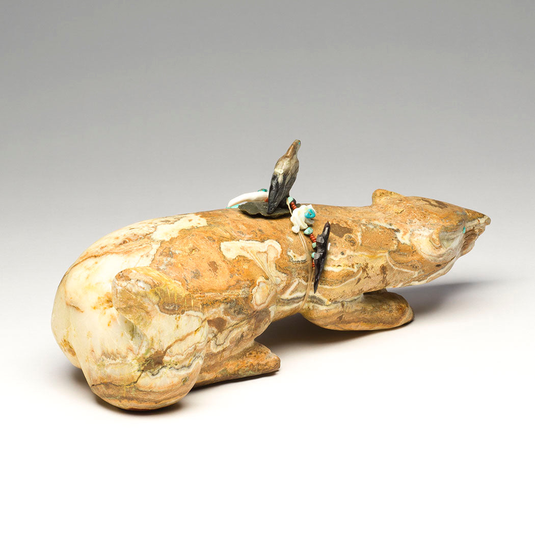 Clive Hustito began carving at the tender age of 8. Today he sculpts animals with much spirit as seen in a spectacular onyx honey Badger sculpture that represents the Six-Directions with a specific color and animal associated with each one. Long ago the Father of Medicine Societies, Po-shai-an-kia established predatory animals as Guardians of the Six Directions, who are healing and protective. The tenacious badger with turquoise eyes is one of the Six Directional animals including a pen shell Mole, a marble Wolf, a Picasso marble Eagle, a turquoise Bear and a shell Mountain-lion. This magnificent work is nicely sized atapproximately 10 1/2" long, 4 3/4" wide and 4 1/4" tall.