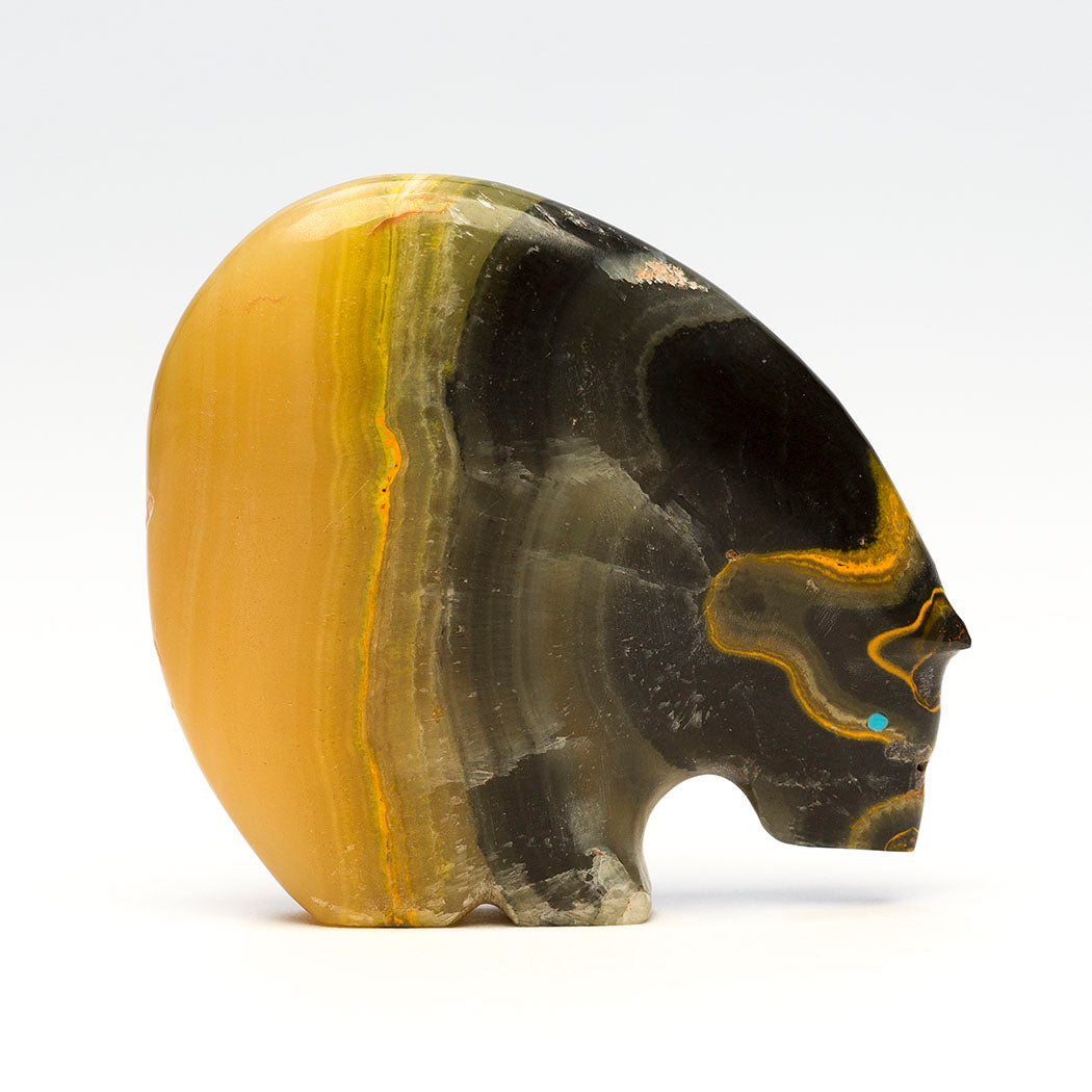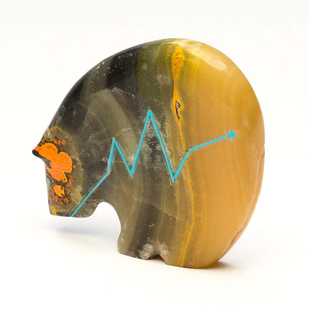 Carved from stunning bumblebee jasper, Stewart Quandelacy and Priscilla Lasiloo Quandelacy's Medicine Bear is inspirational because its natural vibrant colors evoke abundance. Ages ago, this fabulous stone was forged in fire with the help of volcanic heat. The yellow color comes from sulfur-rich areas and gives the piece a very faint smell of matches. An orange inclusion underneath one of the turquoise eyes resembles a tiny swimming fish. An alternating heartline or breath path are from turquoise inlays. About 2 1/2" long, 1/2" wide and 2 1/4" tall.