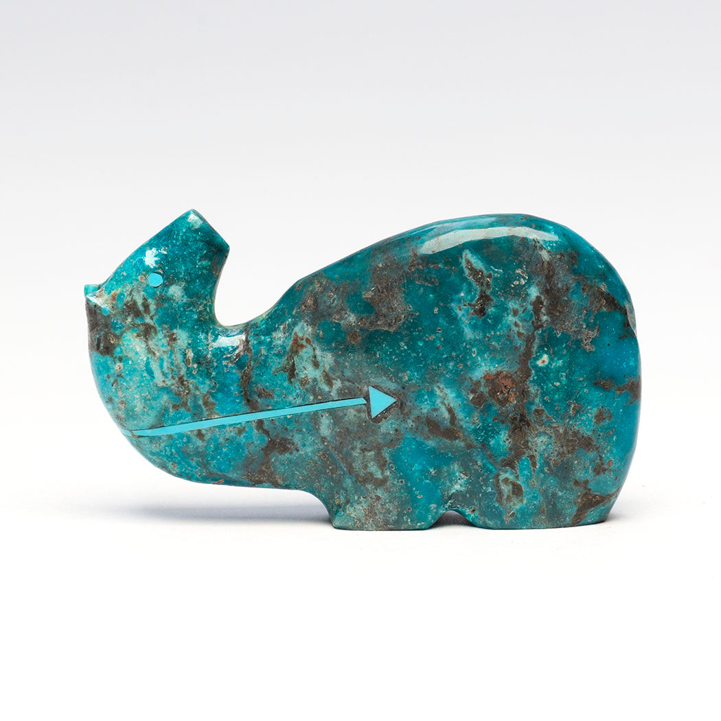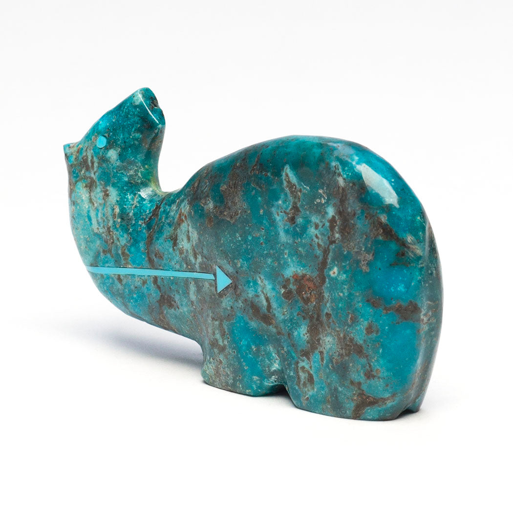 A lovely turquoise Medicine-Bear with a continuous wrap-around turquoise inlaid heartline or breath path is in deep thought. Stewart Quandelacy along with his wife Priscilla Lasiloo Quandelacy purposely sculpted this turquoise-eyed Bear looking back because its animal medicine is encouraging us to look out and take care of ourselves. About 2 1/4" long, 1/2" wide and 1 1/4" tall.