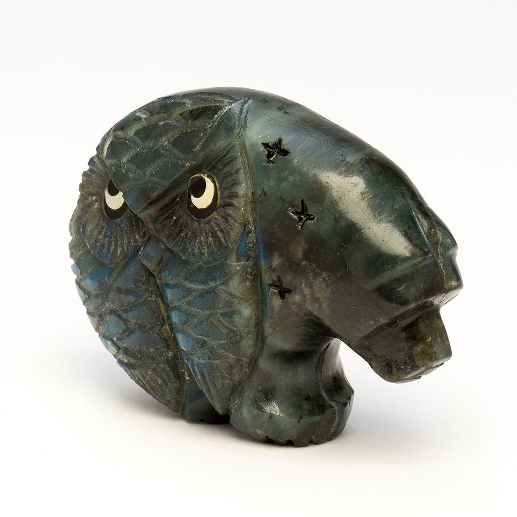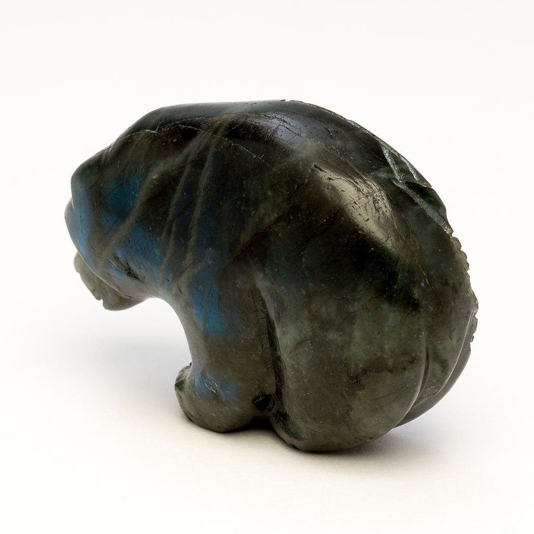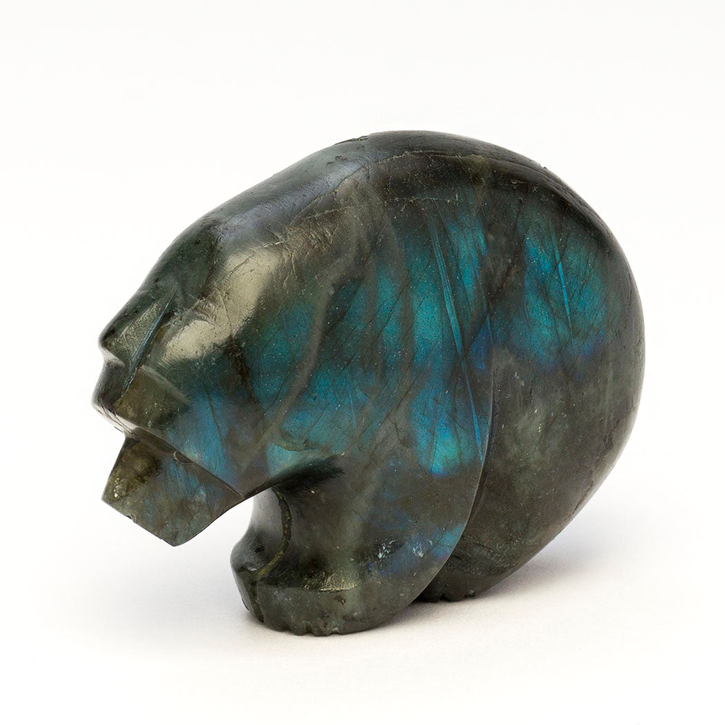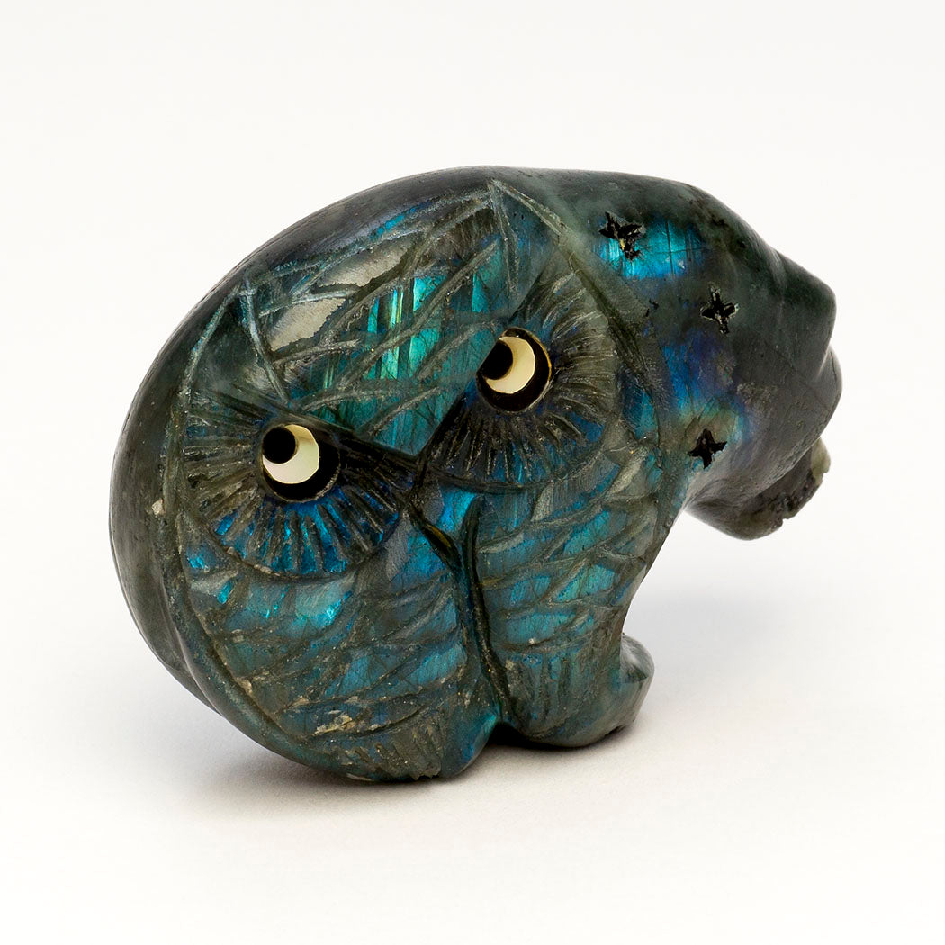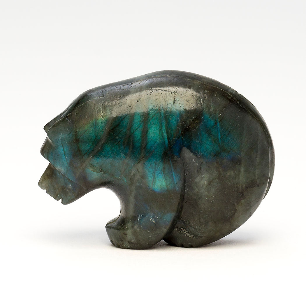 Owl companion carved right into the labradorite specimen. Scalloped plumage comes to life because of the fiery blue and green hues. The raptor's crescent moon shaped eyes are set with gold lip shell and jet. The gentle bear's eyes are from jet. Dimensions of this magical carving are approximately 2 1/2" long, 1 1/8" wide and 1 7/8" tall.
