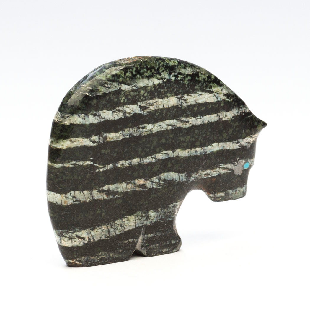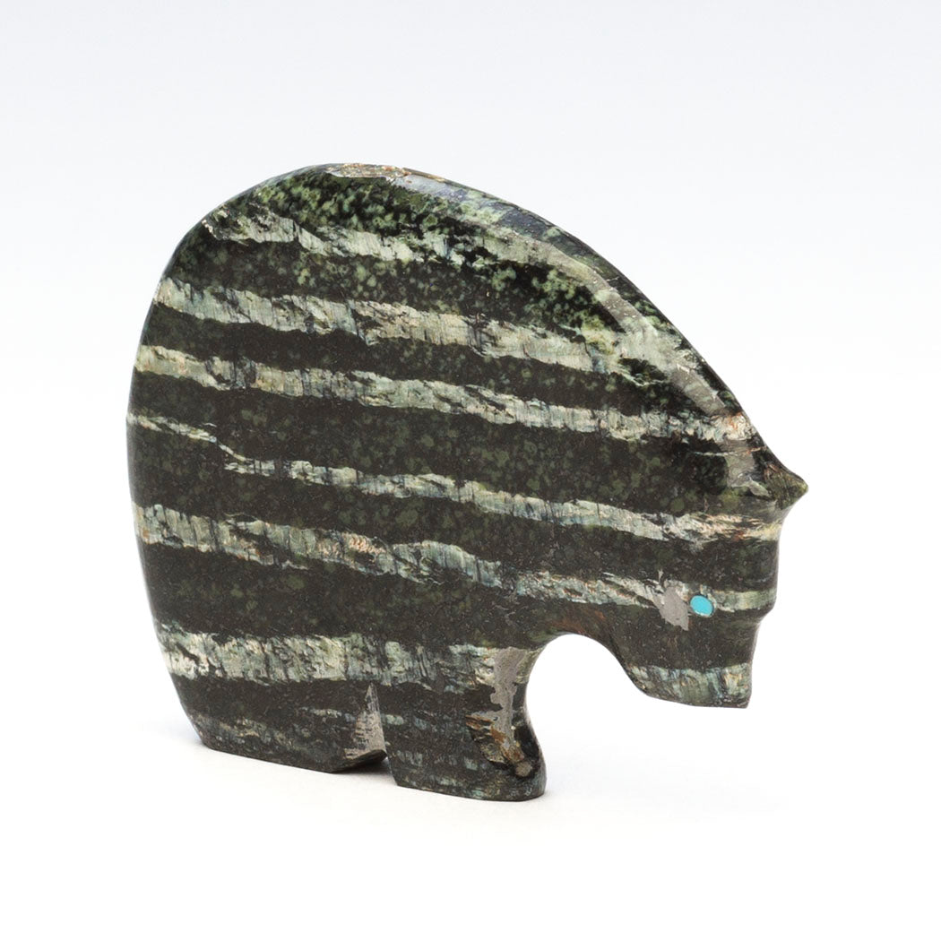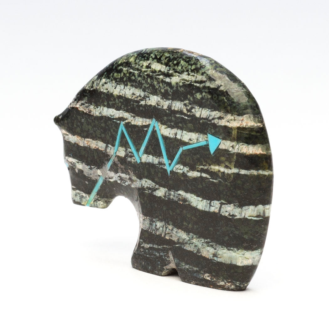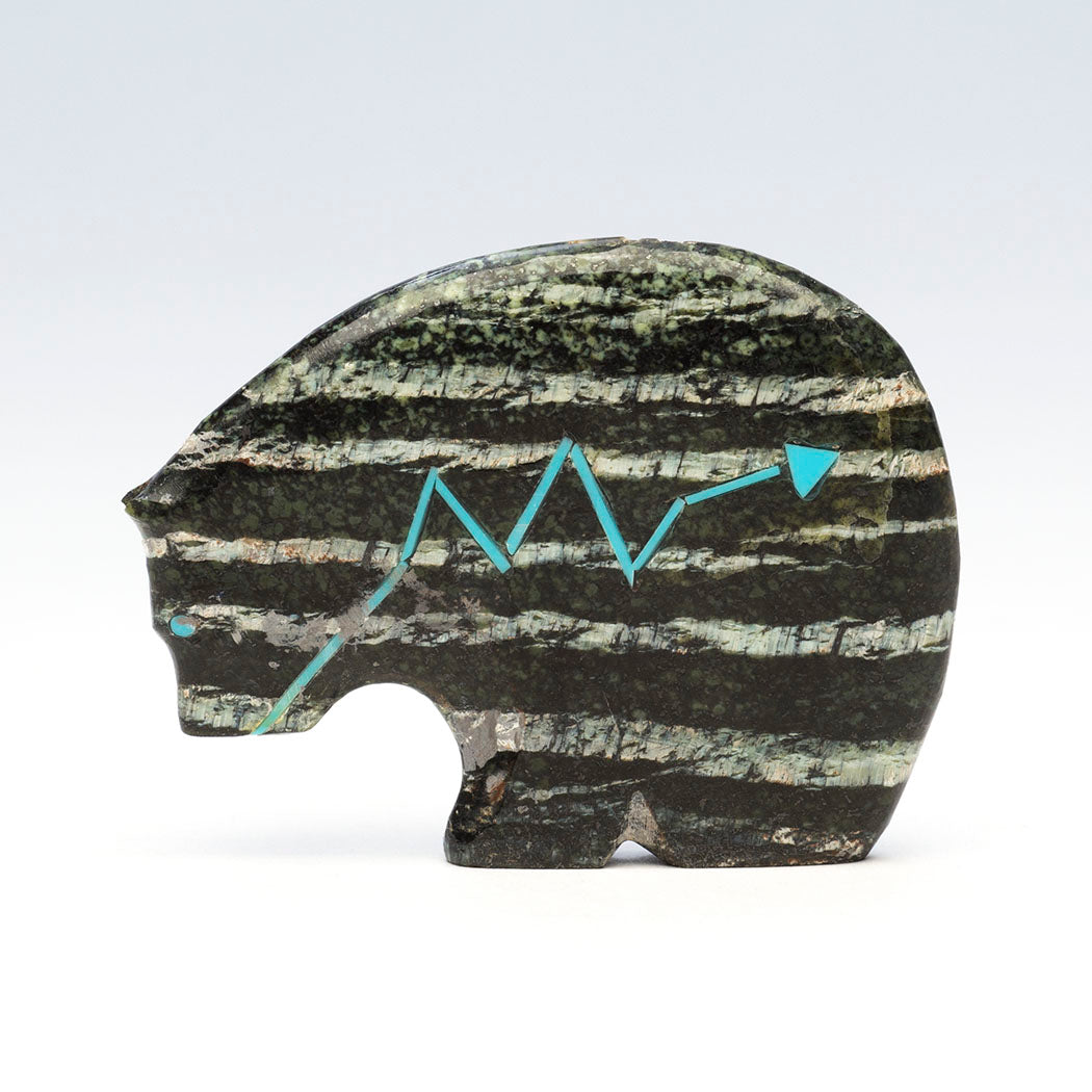 Medicine-Bear has been sculpted from Swiss opal to a size of approximately 2" long, 1/4" wide and roughly 1 1/2" tall. The gorgeous horizontal features in the mineral are woken up by the colorful alternating heartline or breath path inlaid from sky blue turquoise.