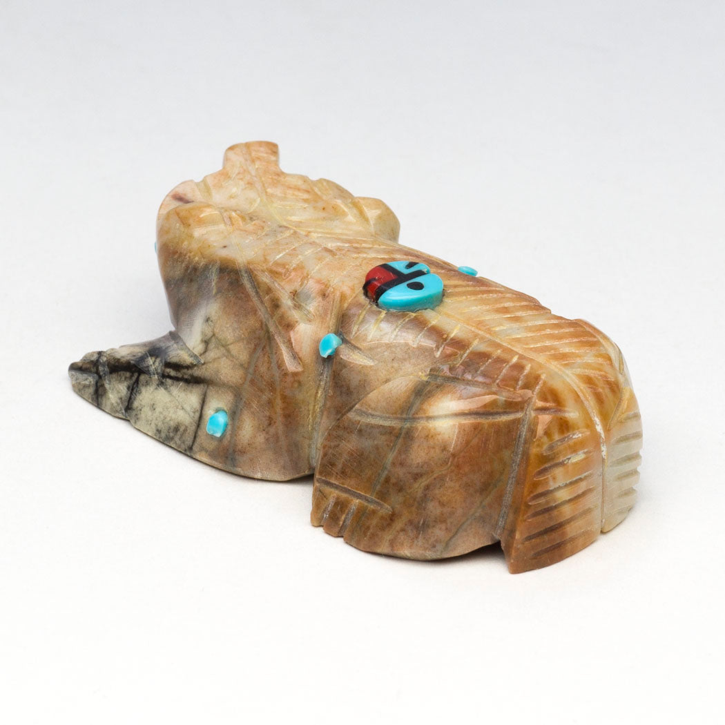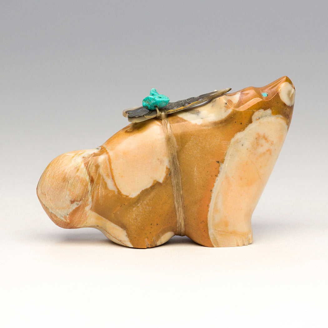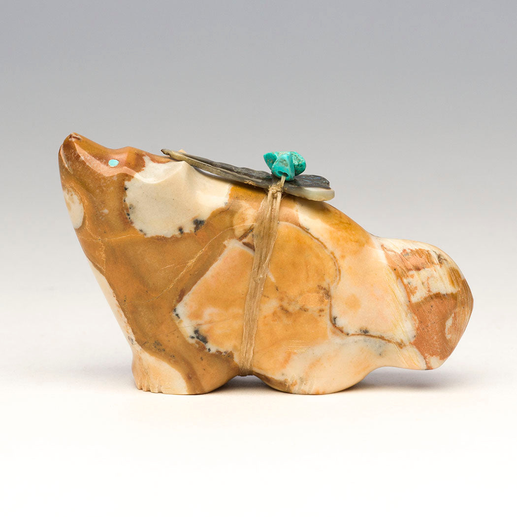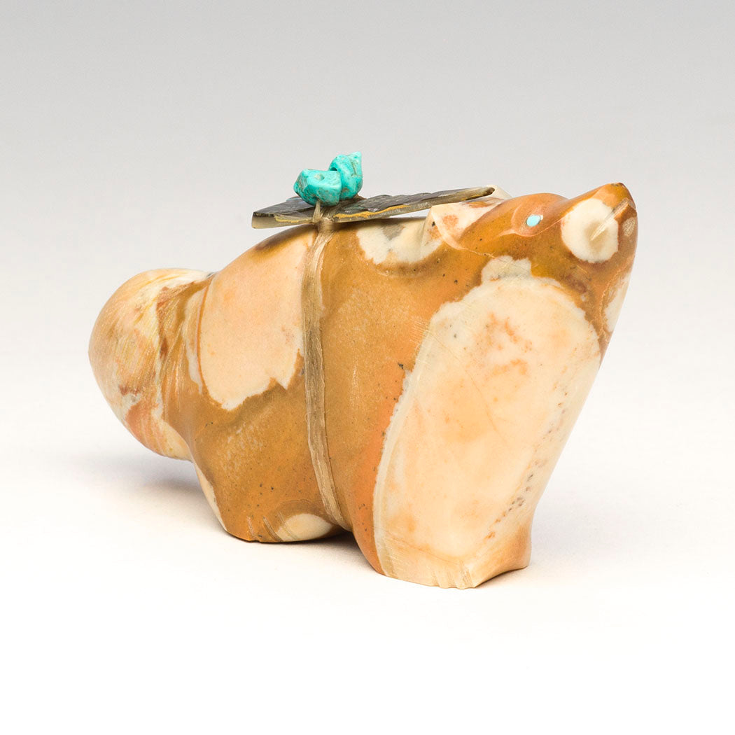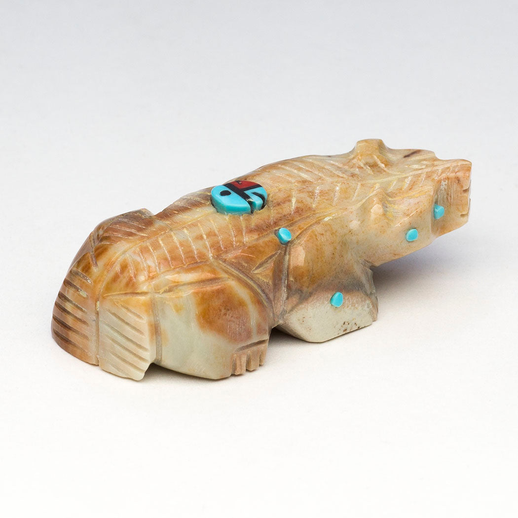 Felinae. With about 33 species, this group includes bobcats, cheetahs, ocelots, cougars and our beloved domestic house cats. Melvin Sandoval's poised wildcat as bobcats are sometimes called, is presented in an onyx with rustic colors blessing it with hunting camouflage. Fur changes color depending on the season too. Thankful for the wildcat's independent ways, Melvin secured a lovely offering bundle from a gorgeous serpentine point, bright turquoise and heishe beads. Approximately 2" long, 5/8" wide and 1 3/8" tall.