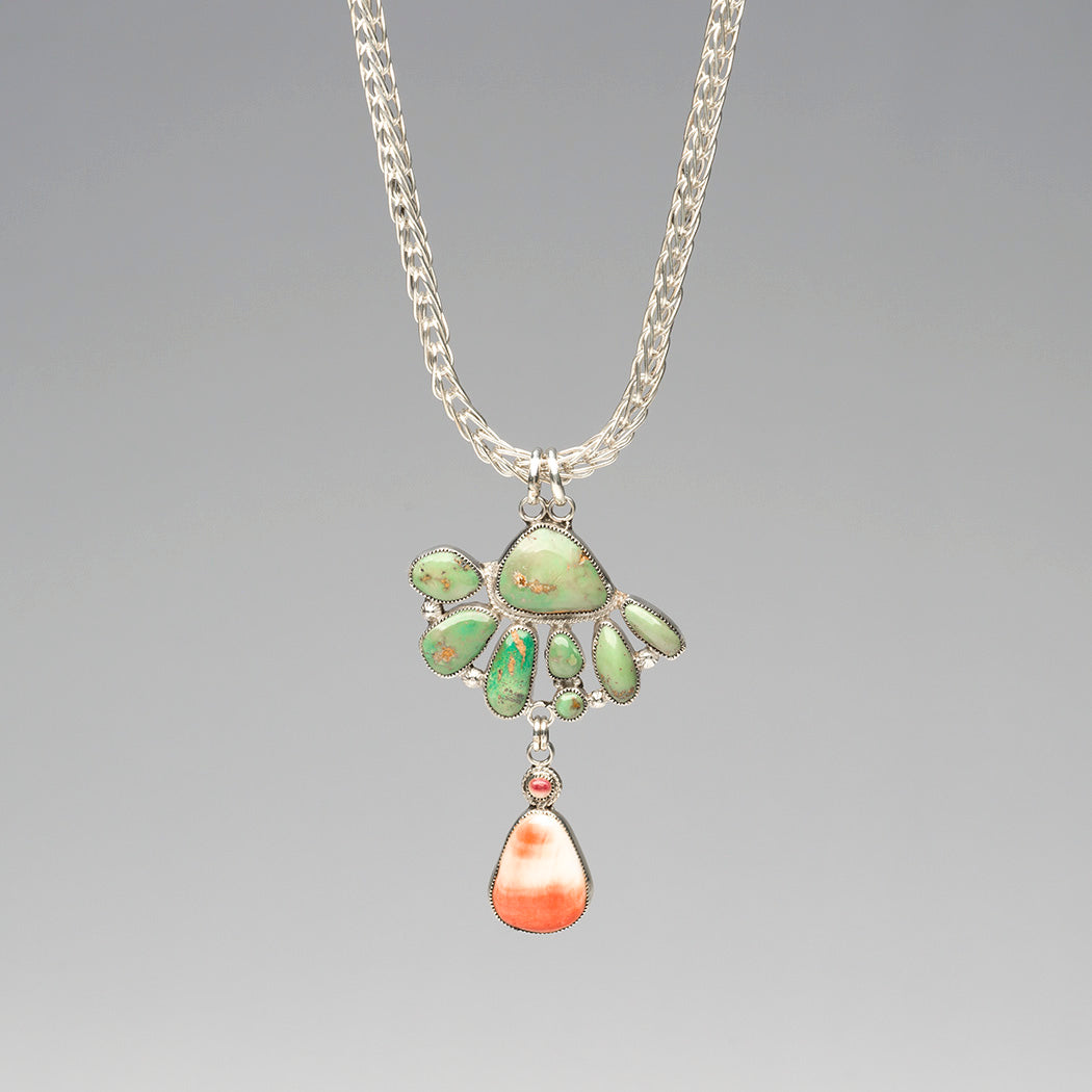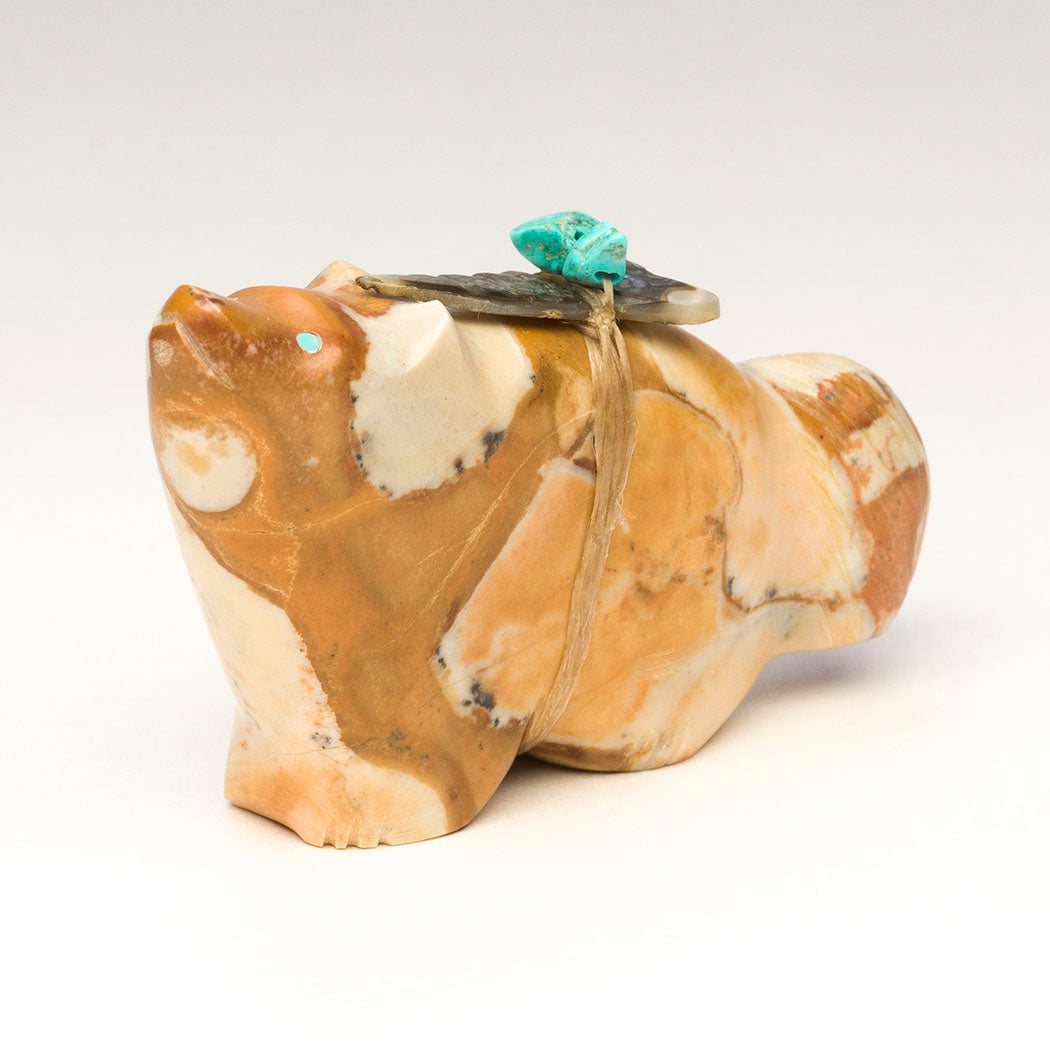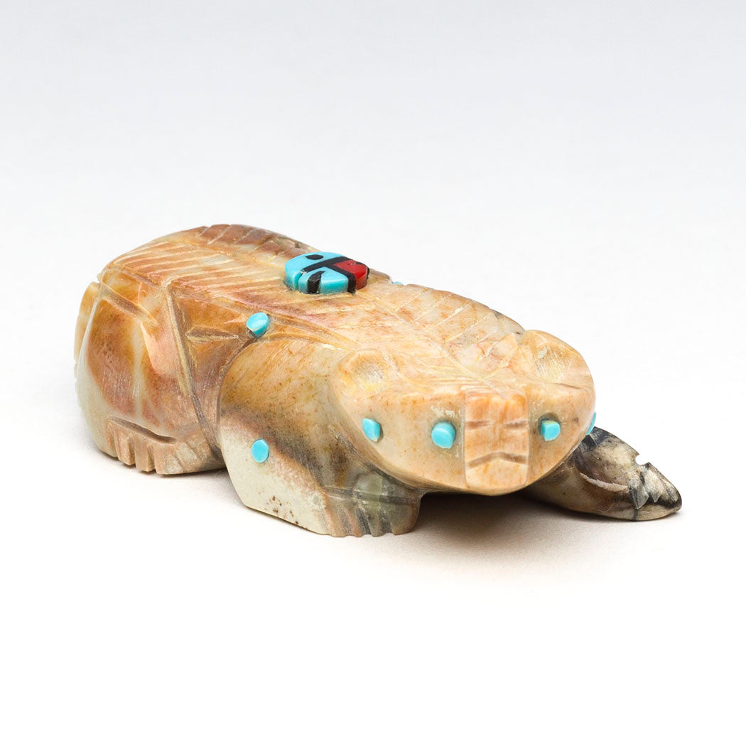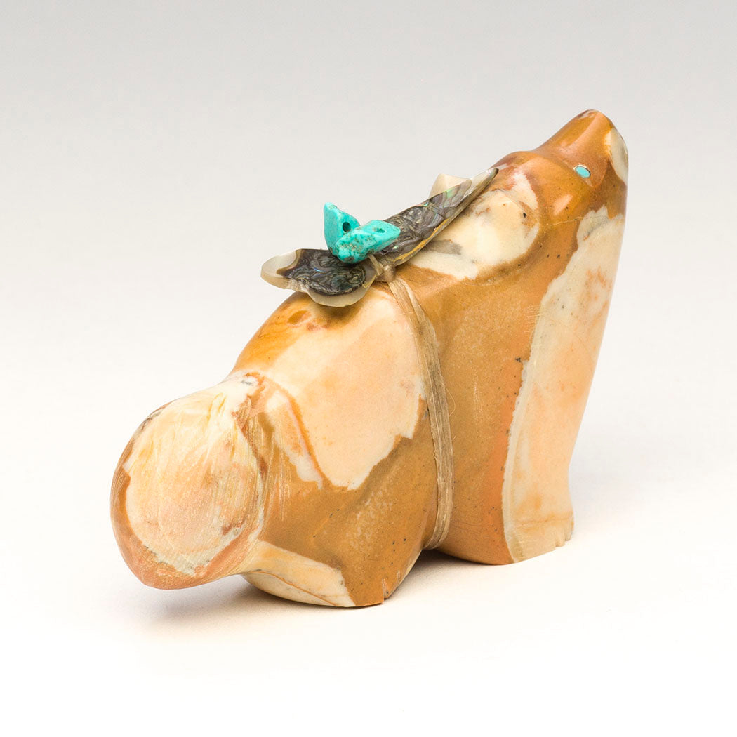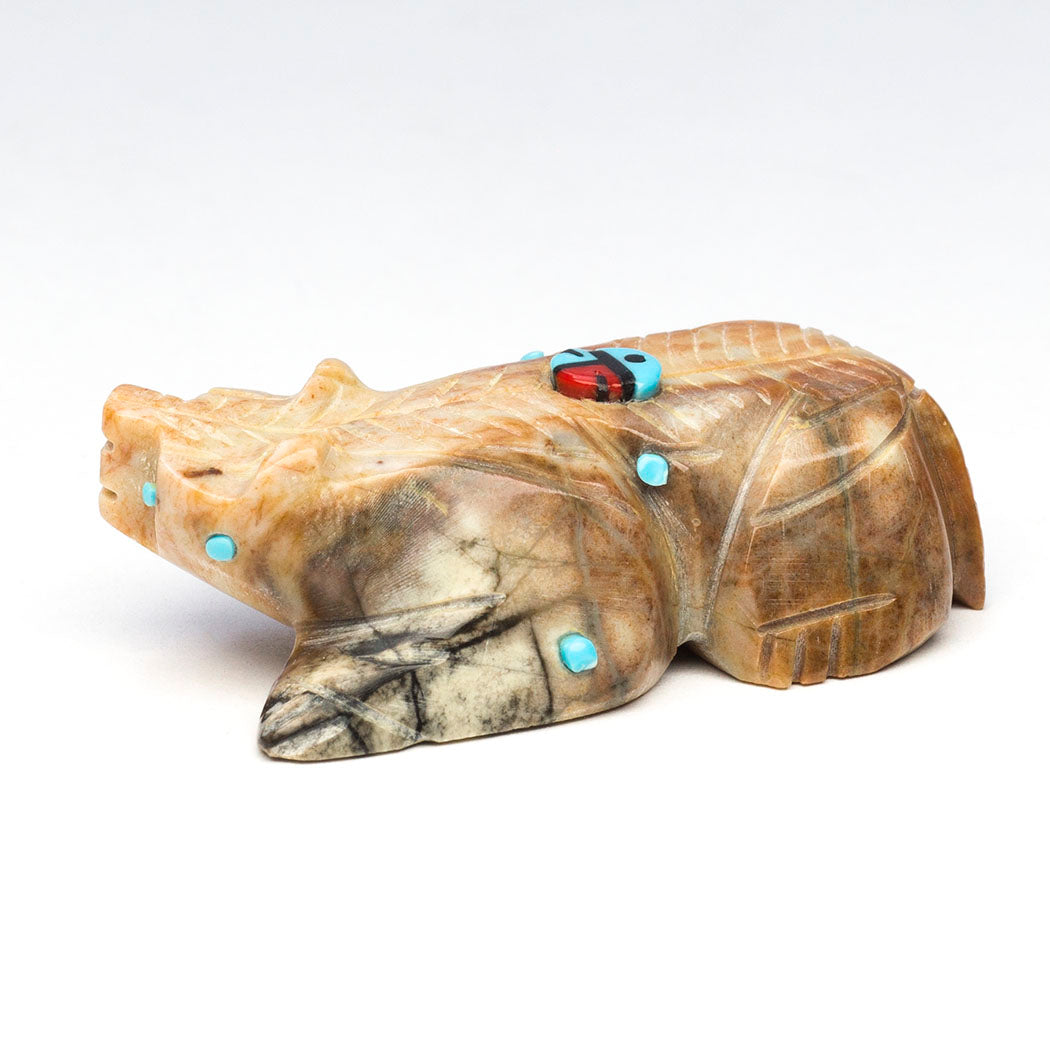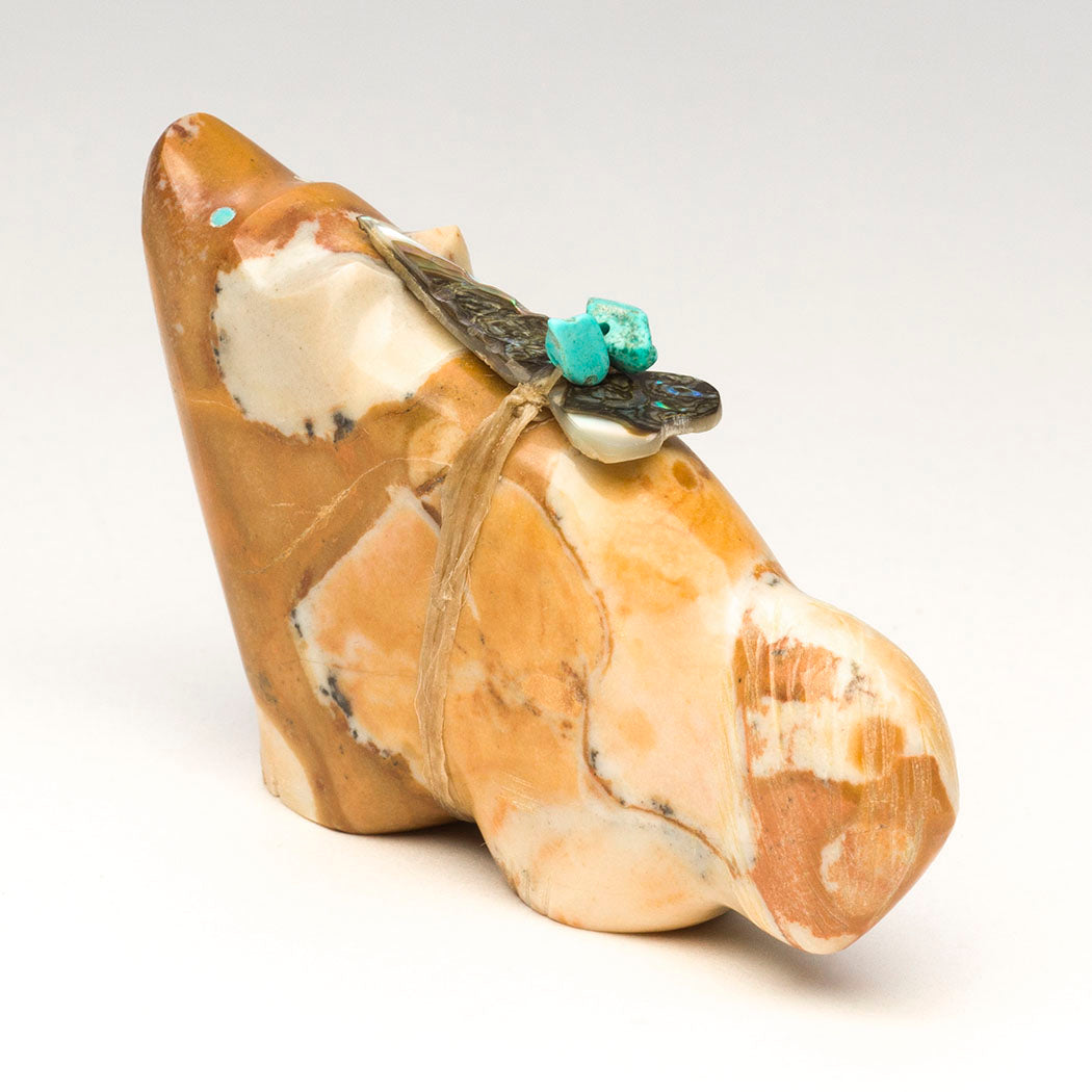 Felinae. With about 33 species, this group includes bobcats, cheetahs, ocelots, cougars and our beloved domestic house cats. Melvin Sandoval's poised wildcat as bobcats are sometimes called, is presented in an onyx with rustic colors blessing it with hunting camouflage. Fur changes color depending on the season too. Thankful for the wildcat's independent ways, Melvin secured a lovely offering bundle from a gorgeous serpentine point, bright turquoise and heishe beads. Approximately 2" long, 5/8" wide and 1 3/8" tall.