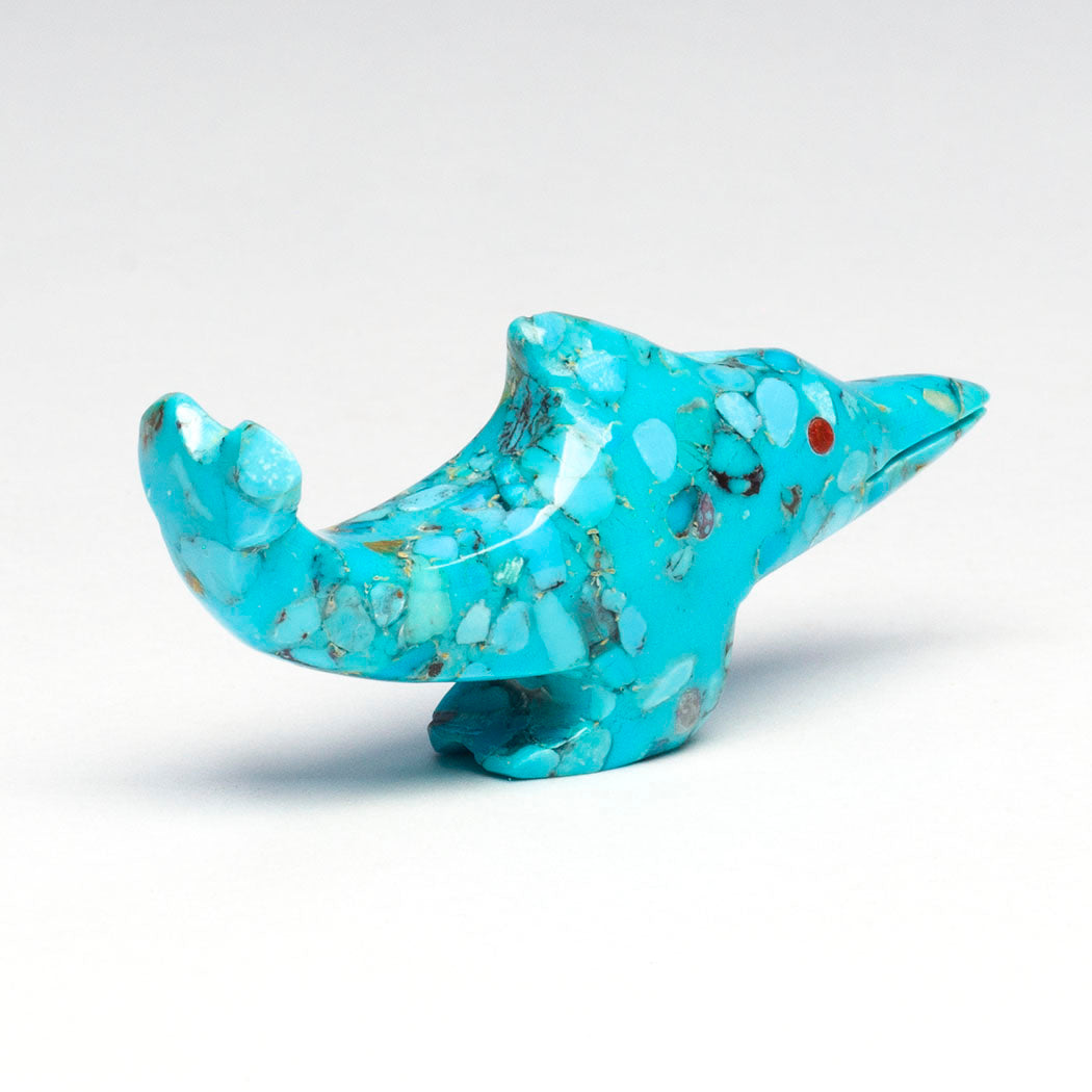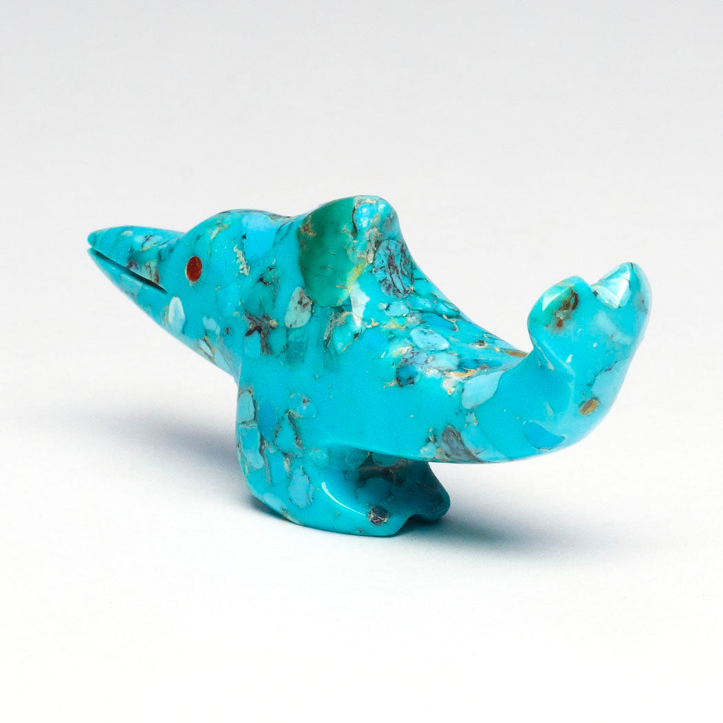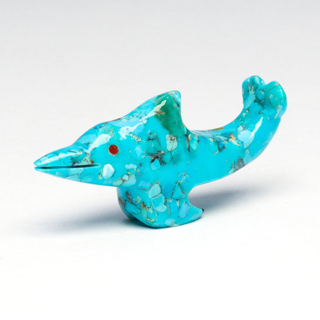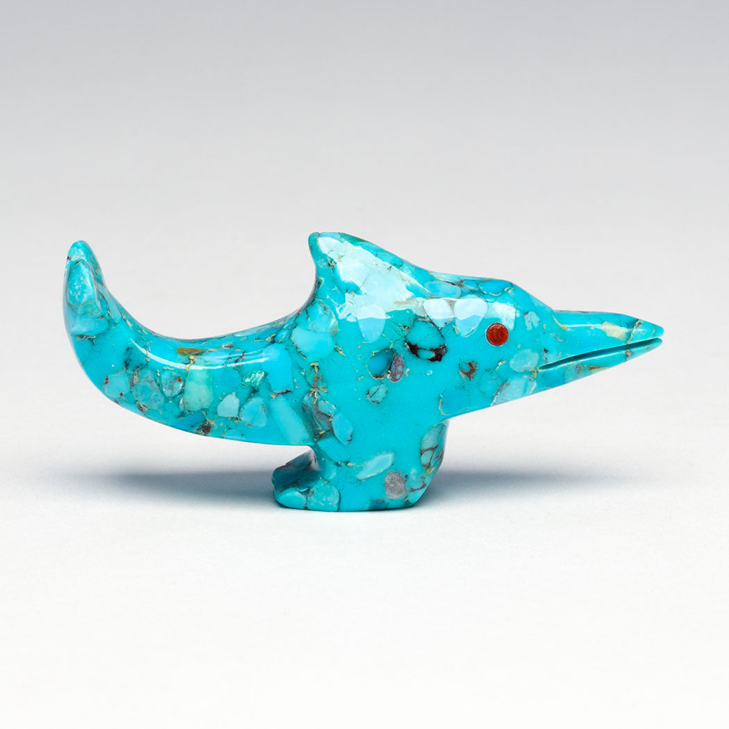 Klamath Basin Indigenous Tribes have fought for years to remove four dams to restore the Klamath River watershed, now free for the first time in over a century. In a historic decision honoring Tribal treaties, the largest dam-removal project in the world was completed in 2024 with ongoing restoration work, transforming reservoirs back into the Klamath river. The benefits of a healthy and happy Klamath River go all the way to the ocean and the Chinook salmon-dependent orcas who live there. Calvert Bowannie's happy orca has been carved from black marble and iridescent mother-of-pearl. Eyes full of emotion are from turquoise inlays. About 2 1/4" long, 1 1/4" wide and 7/8" tall.