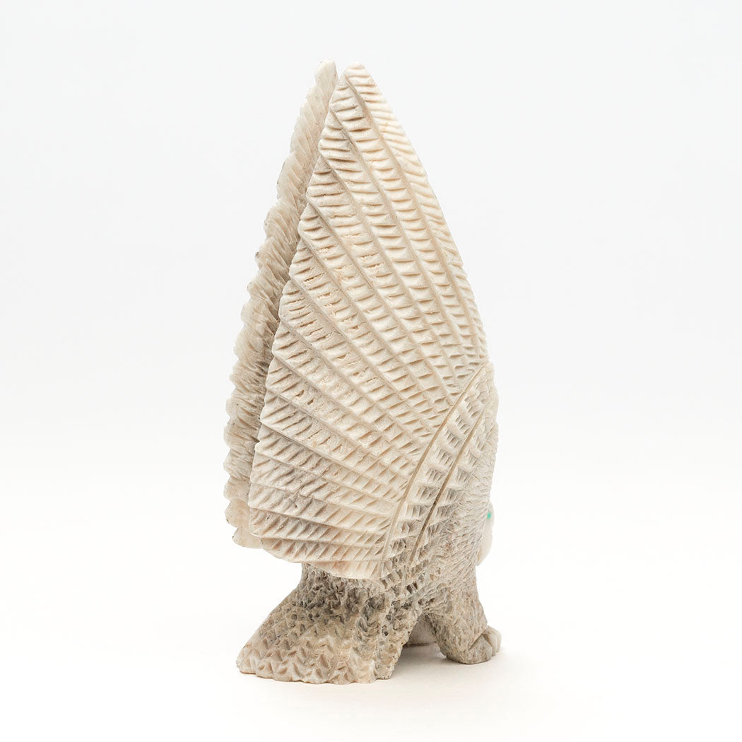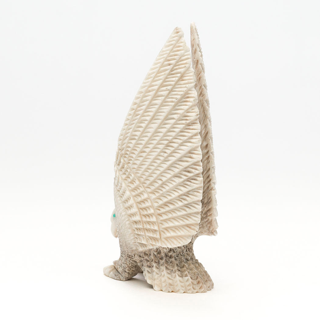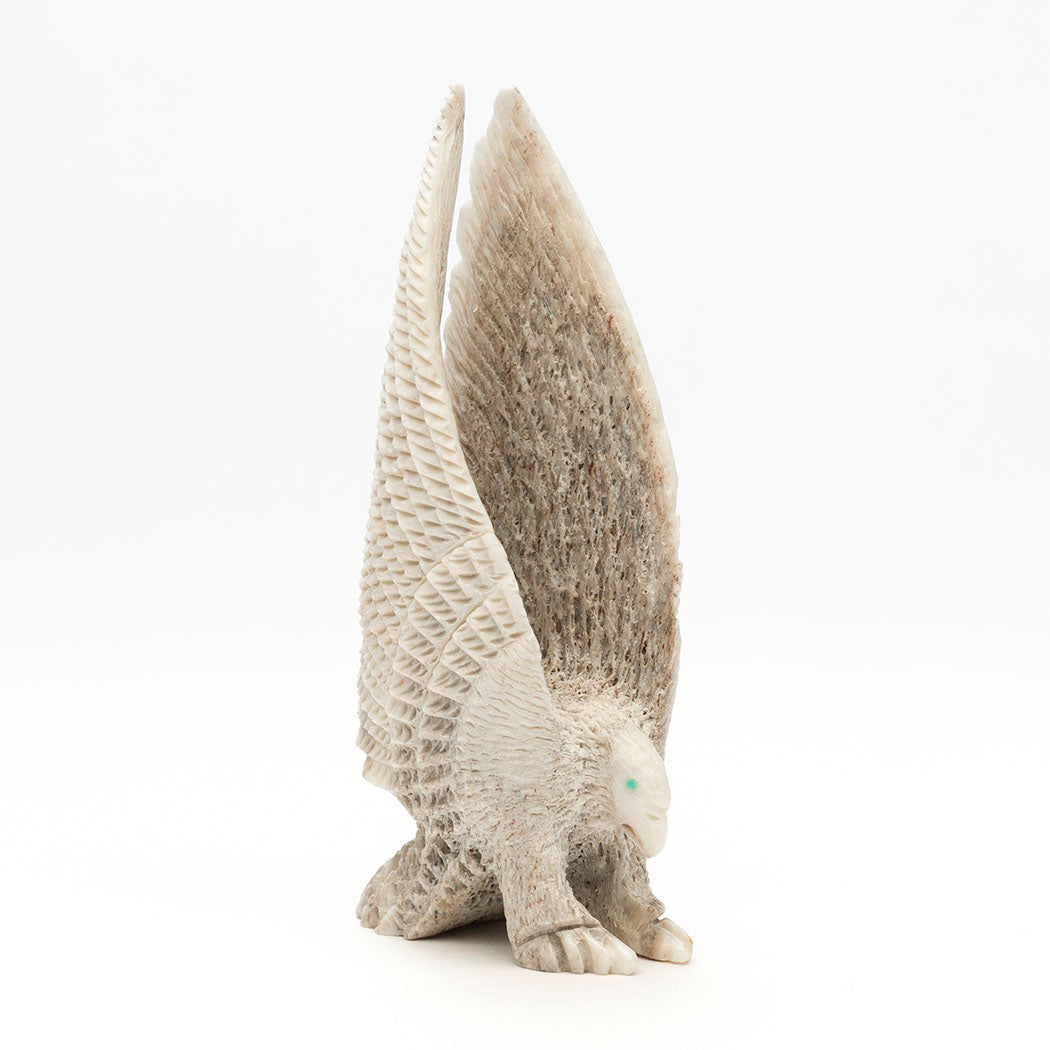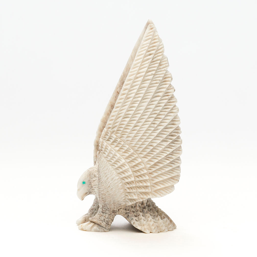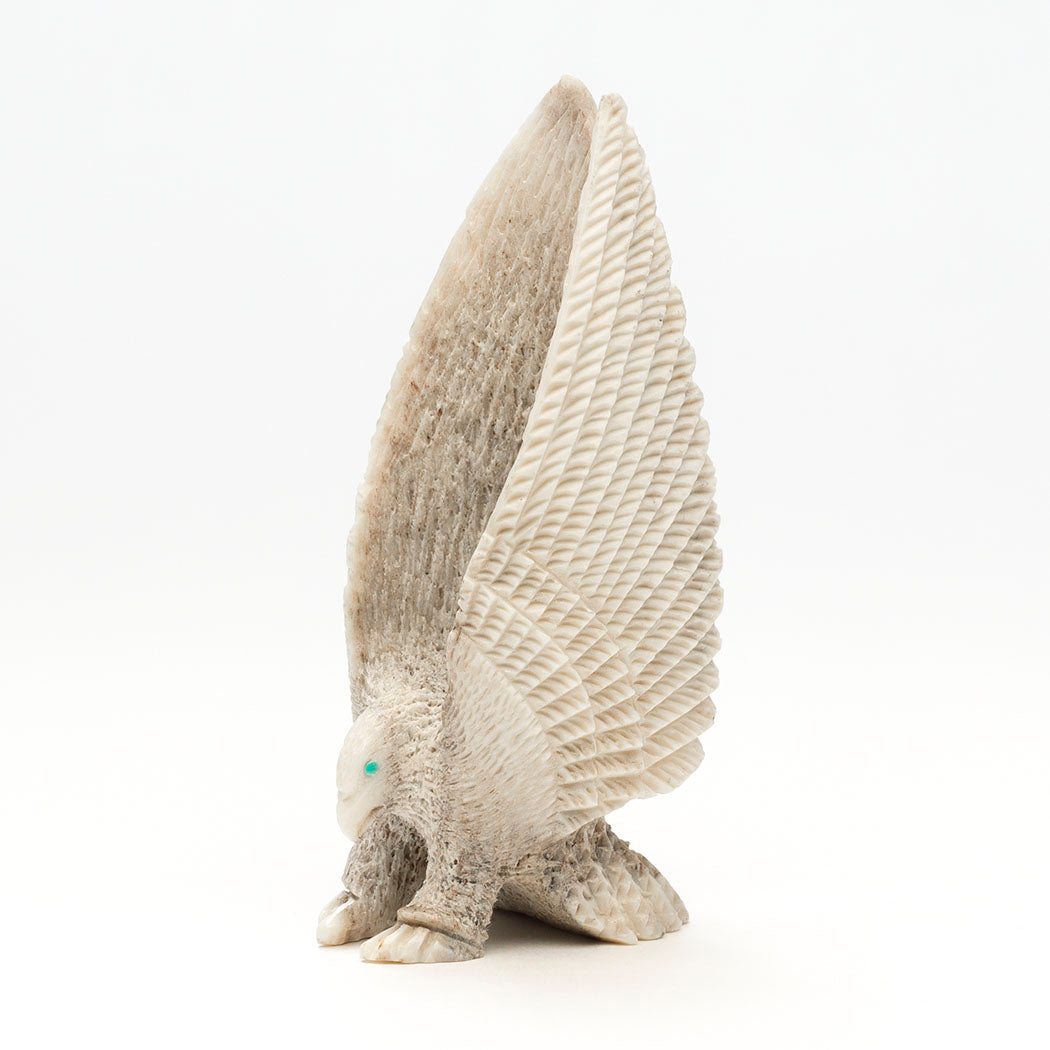 Eagles teach us many things including being grateful for what we have. Being thankful helps shift our mindset from focusing on what we may lack to a more positive perspective on the abundance already around us. In nature, eagles love eating fish yet are flexible and opportunistic hunters setting an example to cultivate gratitude for what is available. Andres Lementino's antler carving depicts a mighty raptor with focused eyes from turquoise inlays, who has swooped down on a jet-eyed Rabbit with its powerful talons. A Zuni Sunface element, which represents the elements in balance and harmony, is meticulously inlaid from iridescent gold lip shell, turquoise, lapis lazuli, pen shell, shimmering mother-of-pearl and apple coral. Dimensions are approximately 6 1/4" tall, 1 7/8" wide and 2 3/4" deep.