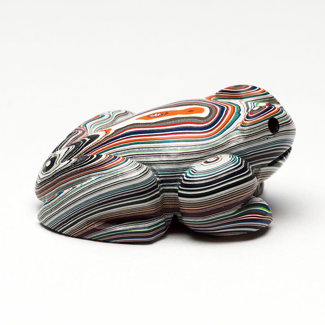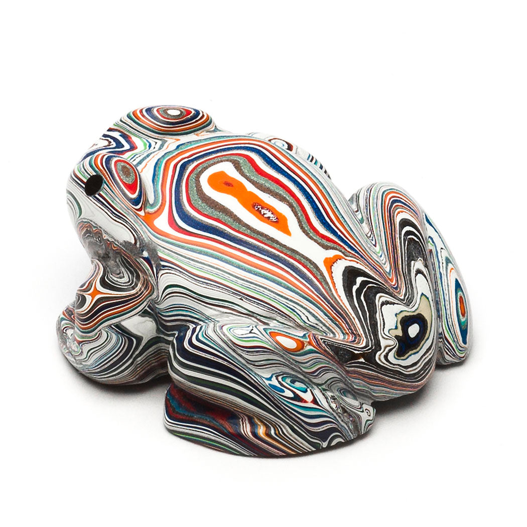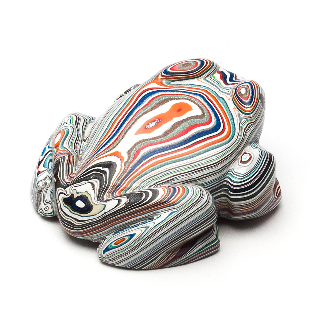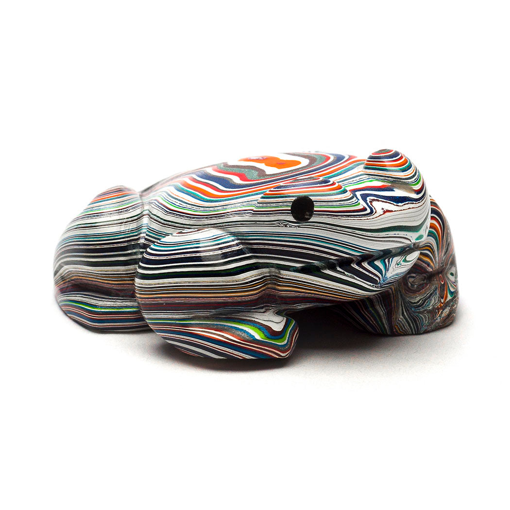 Frog or toad has wonderful webbed feet and a slightly opened mouth. Incised circles compliment the natural beauty of the Picasso marble specimen. The varying earth-toned hues and inclusions are splendid. Frogs spend more time in water than a related toad. Eggs, tadpoles and adult frogs are a critical component of many ecological communities. Other animals rely on them as a food source. A great desktop companion at about 6" long, 3 5/8" wide and 2 3/8" tall.