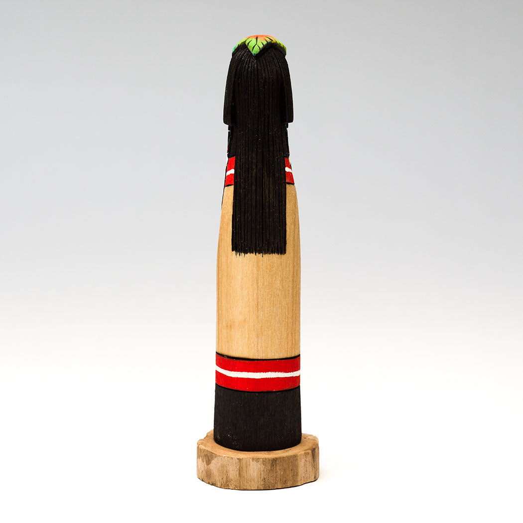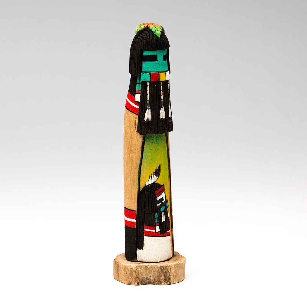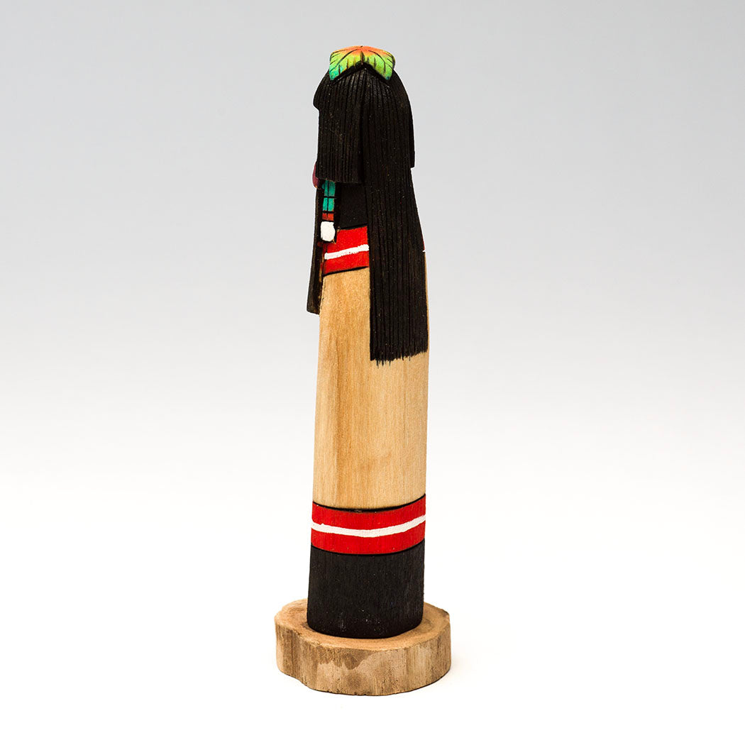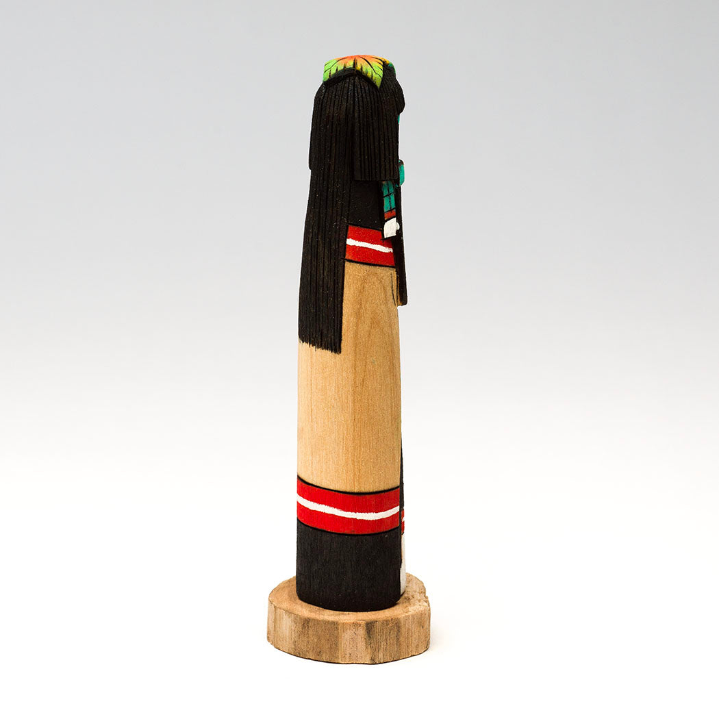 corn cobs and wheat stalks of plant fiber and cloth cording. The katsina doll is traditionally dressed wearing a kilt, jewelry and headdress with feathers. At the base sits other gifts such as a red chili ristra, melons, squash, green onions, tomatoes and pumpkin. All this bounty is a result of the amazing seeds that transform themselves into life-giving food. Fred Bowannie Jr.'s extraordinary hand-carved and painted, cottonwood and acrylic paints "Bringer Of Seeds" katsina doll is about 9 1/2" tall, 8 1/2" wide and 4" deep. Signed by the artist.