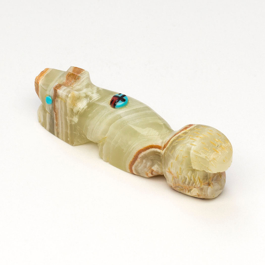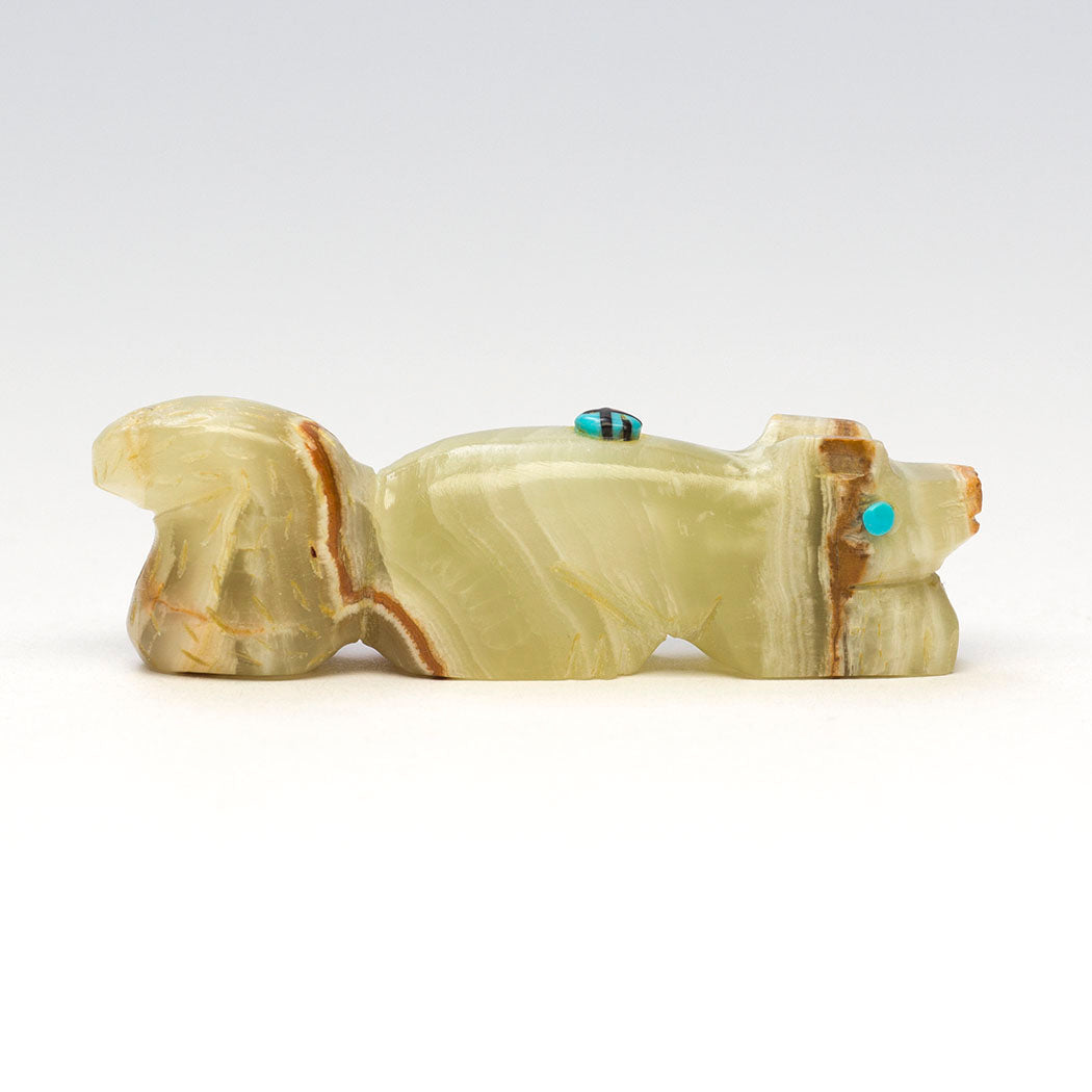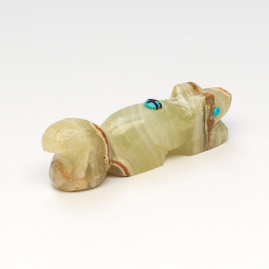 Carved from onyx with a beautifully layered and swirling quality to the colors like a riverbed, Rosella and Loubert Soseeah’s bear companion is 1 ⅝” long, 1 ⅛” wide, and 1 ½” tall. With turquoise eyes and a wide, round face, this little bear gives off a trustworthy air.