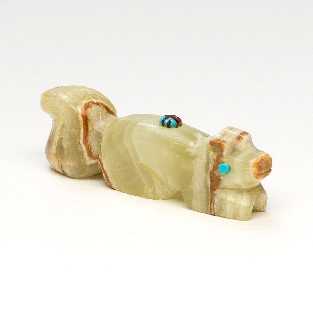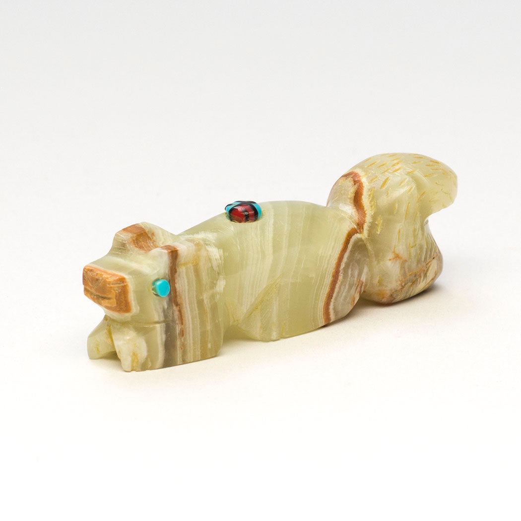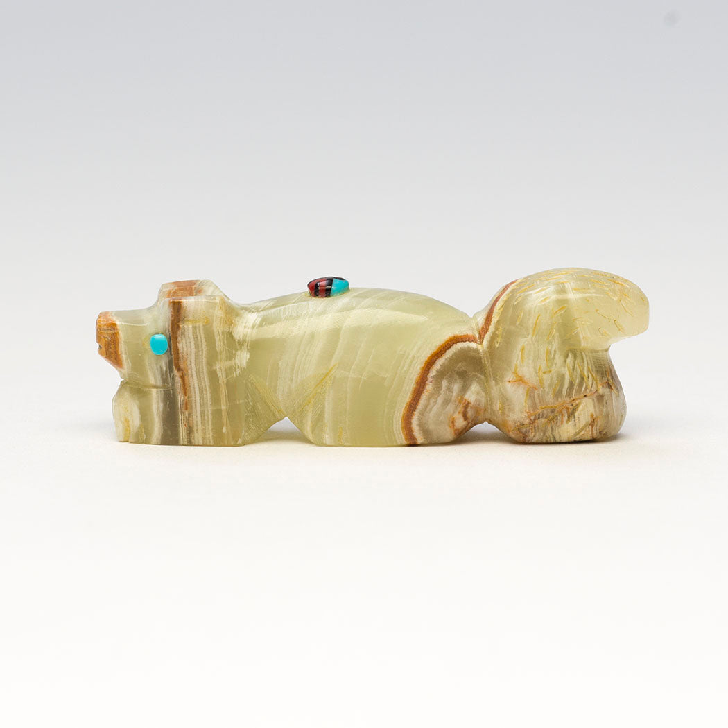 Carved from onyx with a beautifully layered and swirling quality to the colors like a riverbed, Rosella and Loubert Soseeah’s bear companion is 1 ⅝” long, 1 ⅛” wide, and 1 ½” tall. With turquoise eyes and a wide, round face, this little bear gives off a trustworthy air.