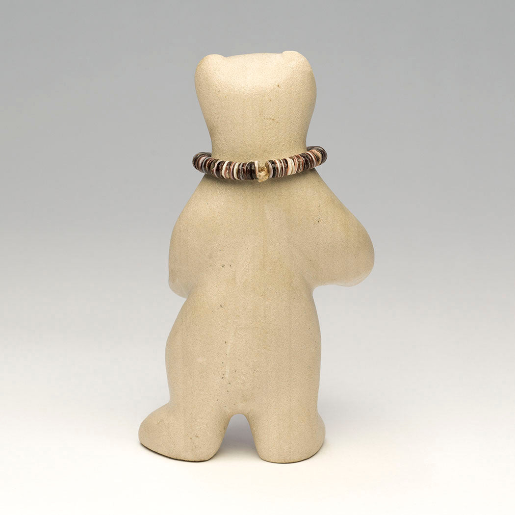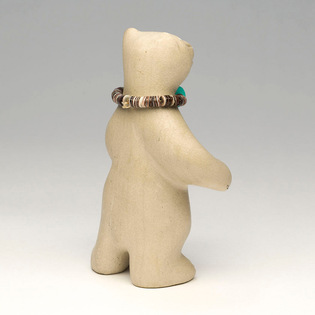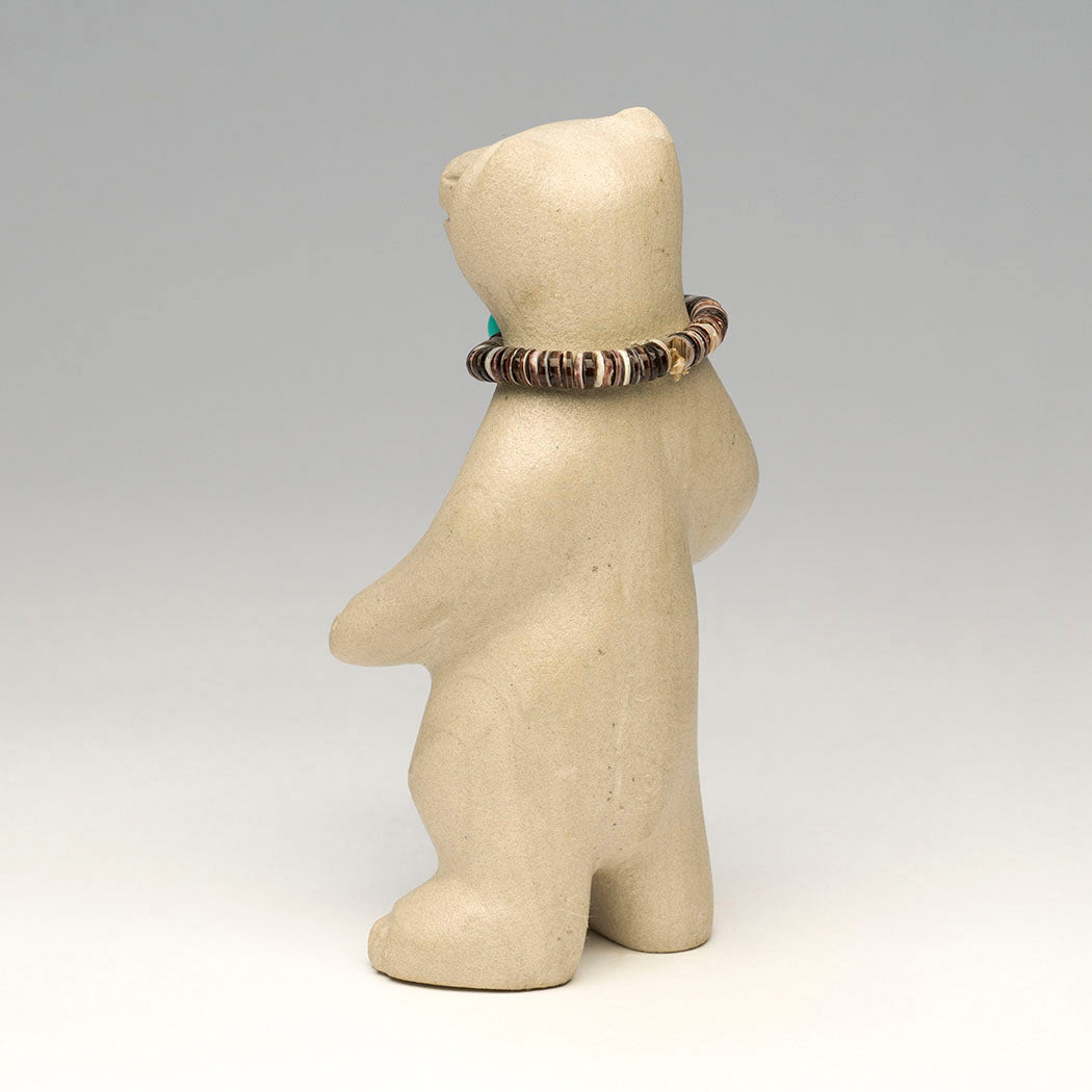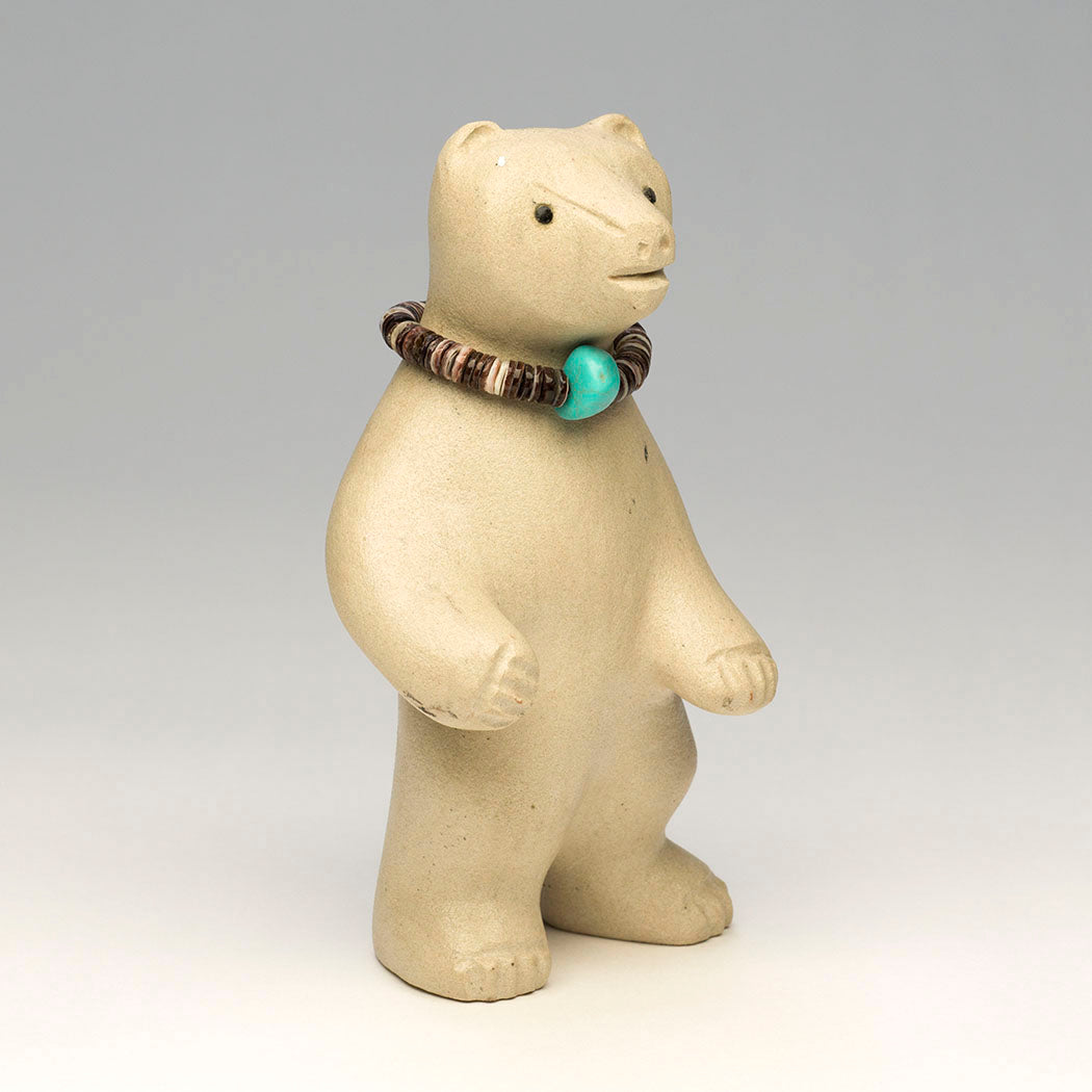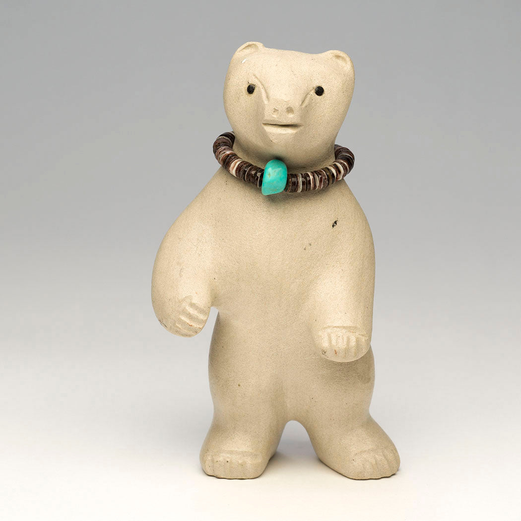 Medicine-bear) permanently presented on a sandstone point base. Using exciting acrylics, Patrick carefully painted a Zuni Sunface element, which appears on either side of this turquoise-eyed sandstone bear carved by Andres. The Sunface symbol represents the elements in balance. Sacred Dowa Yalanne or