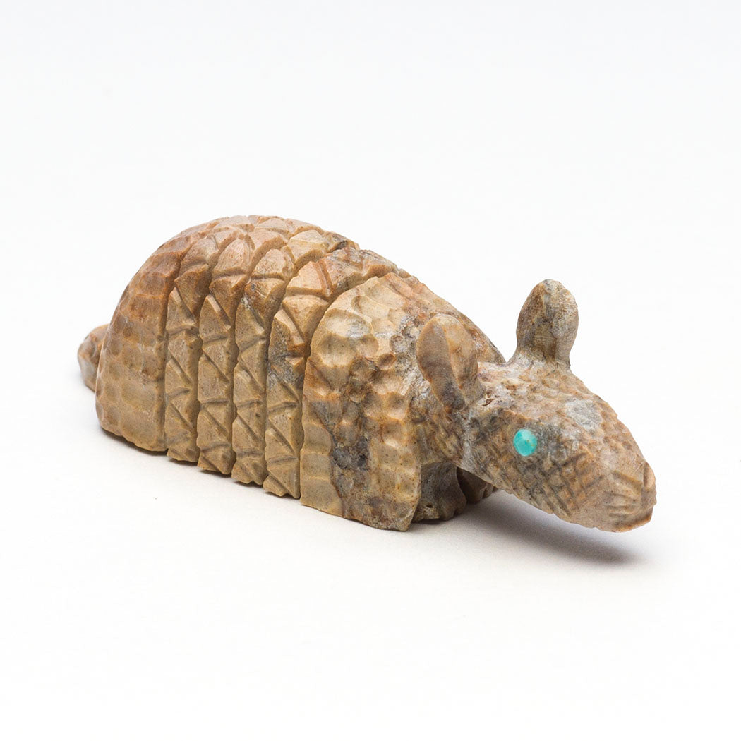 Bernie Laselute's sweet armadillo from Picasso marble has cute eyes from turquoise inlays and cool incised patterns from cross-hatching and drilling. They highlight the mammal's bands and protective plates in a lovely way. An armadillo's armor can teach us to develop our own resilience and fortitude each day. About 2 1/4" long, 5/8" wide and 5/8" tall.