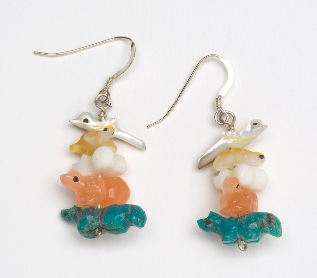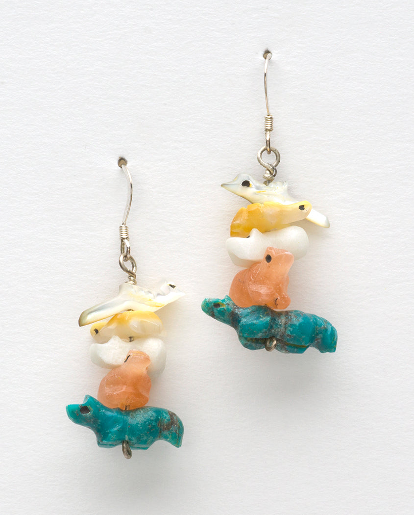 These bird, Turtle, Frog, Bear and bushytail (Coyote, Fox or Wolf) fetish earrings by Reva Halate are so sweet and quite colorful. This gathering of animals showcase pretty specimens of black lip shell, gold lip shell, marble, alabaster and turquoise. Each animal has eyes of drilled and darkened jet. They hang at about 1 1/2" long including earring fixture and are 3/4" at widest part.