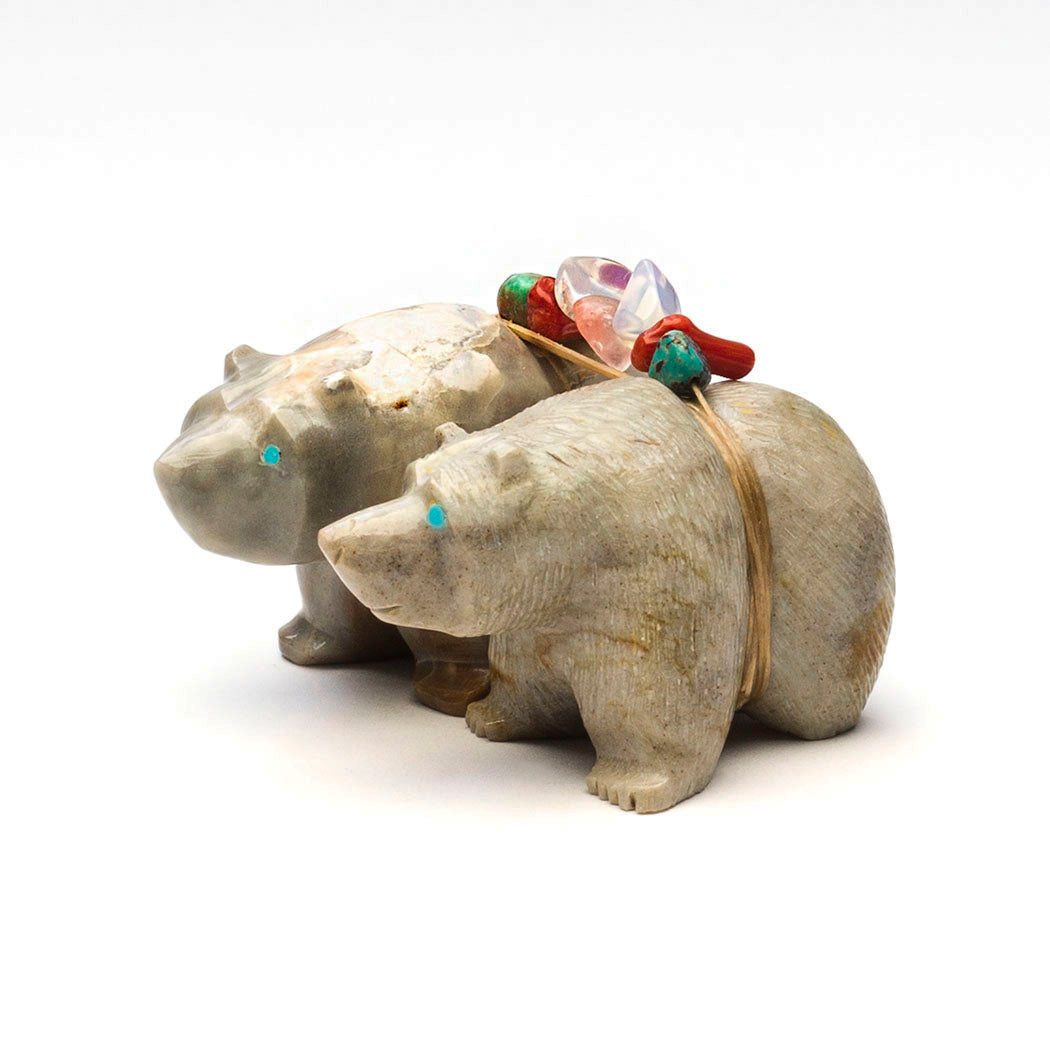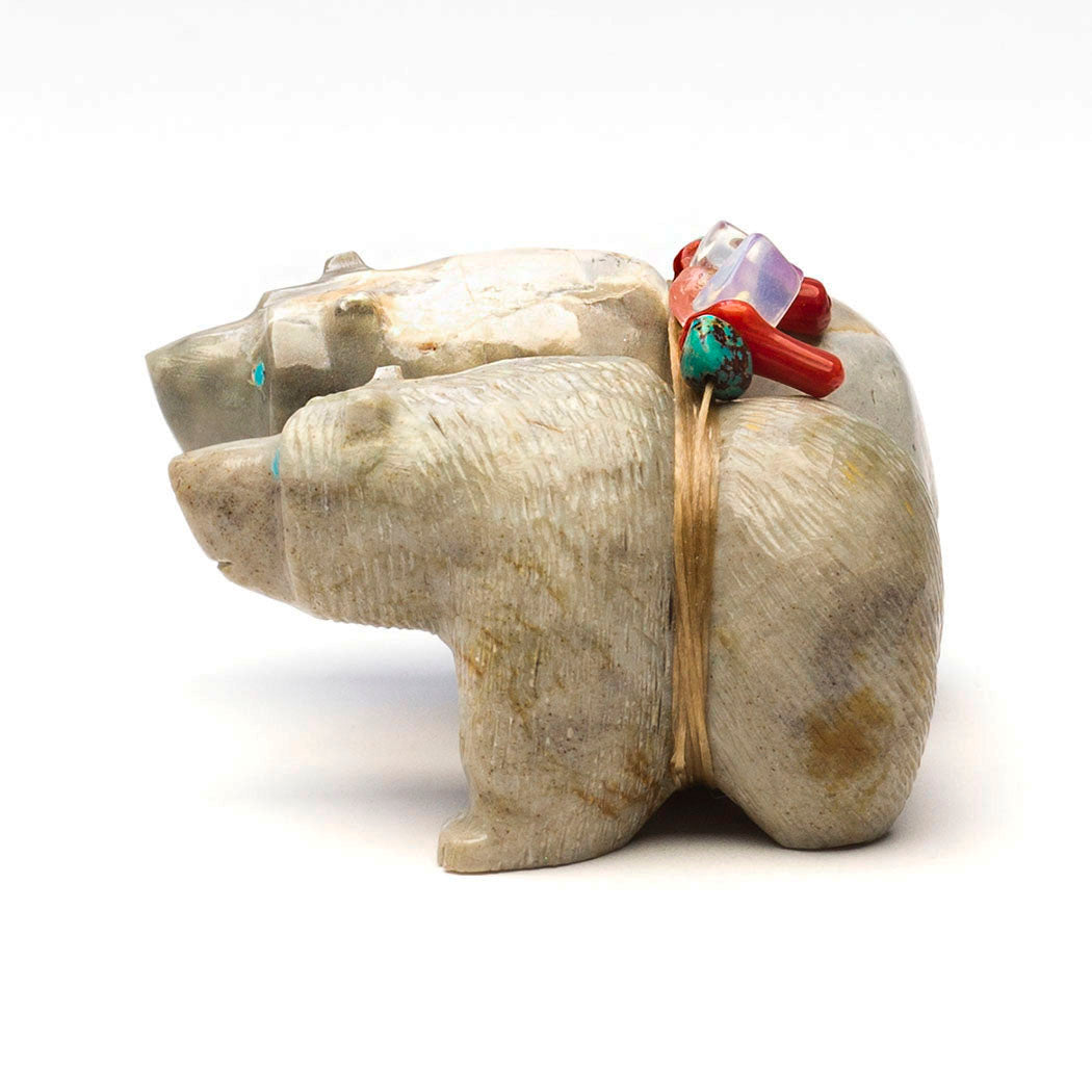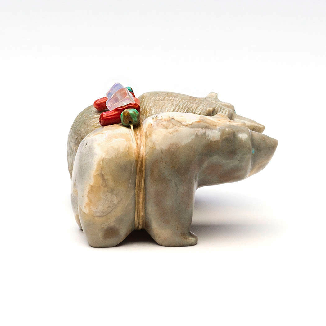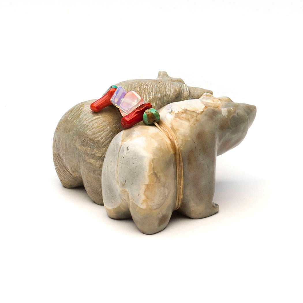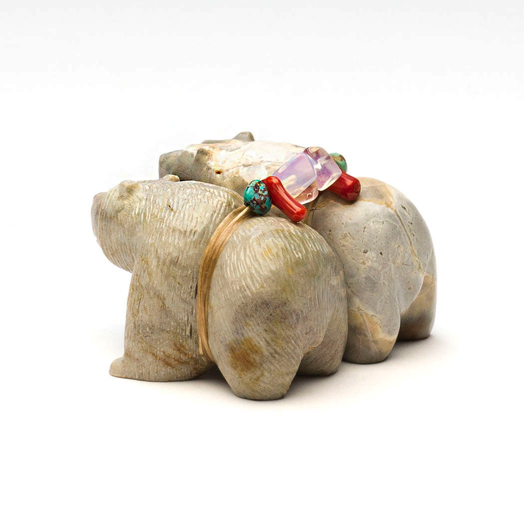 Being connected with others gives good energy because it reminds us we're not alone. Paulette and Farlan Quam's turquoise-eyed Bear pair relays strength as two are better than one. They are bound together with a colorful turquoise, red coral, moonstone and perhaps rose quartz bead offering bundle that can represent the unseen ties that bind us together in universal truths. Measurements are approximately 2" long, 2" wide and 1 3/8" tall, carved from two unique specimens of Picasso marble.