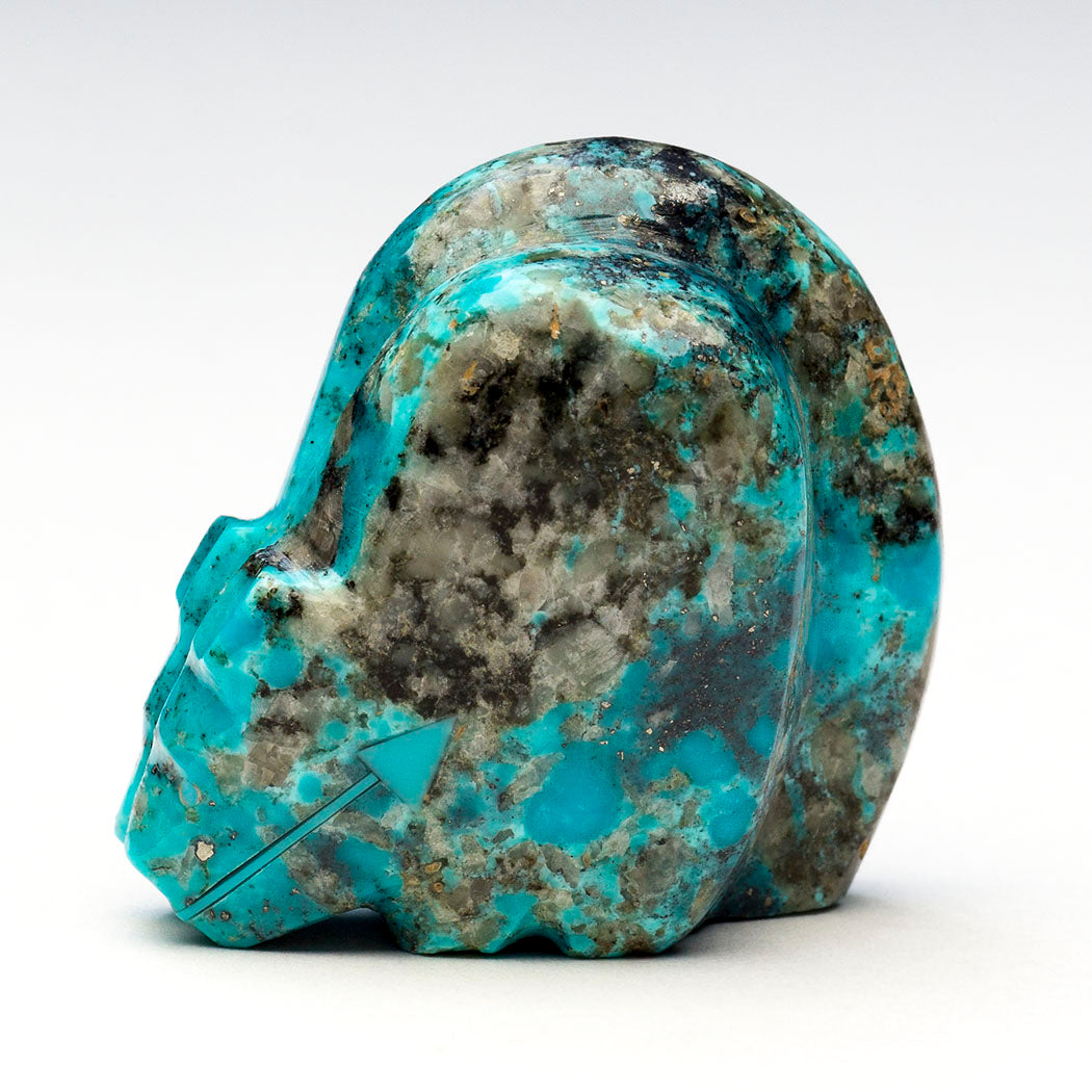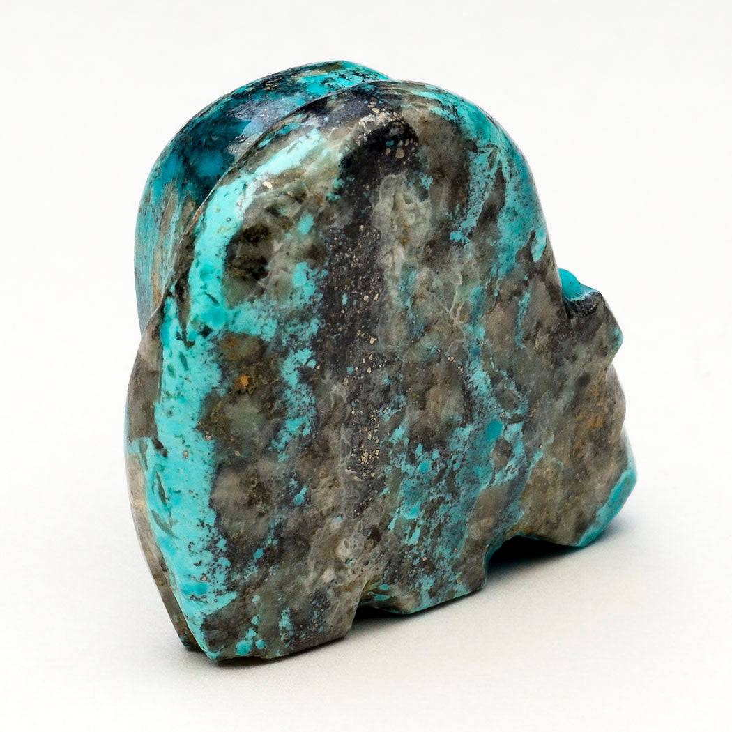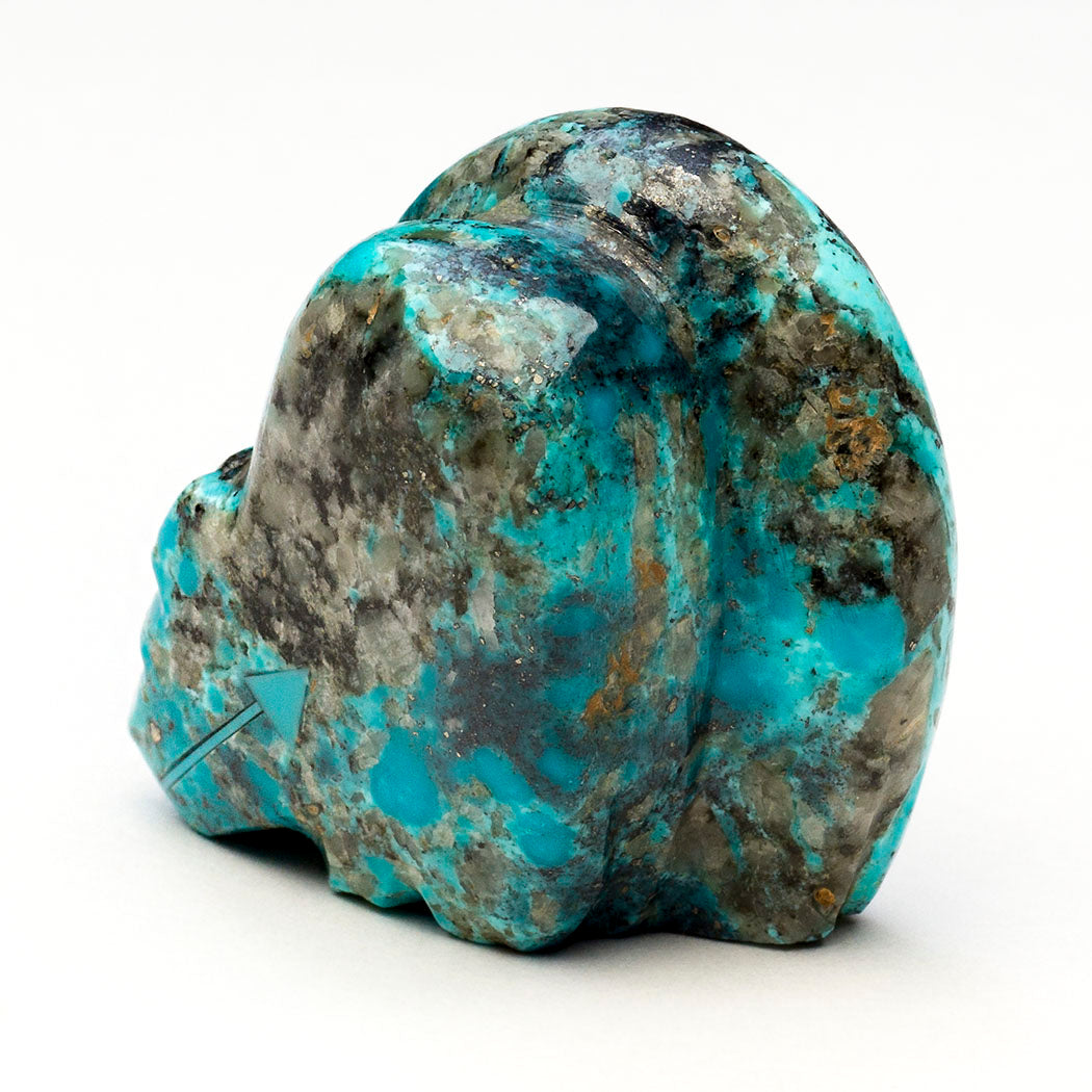 Abby Panteah's Medicine-bears or Bears lean on the other for strength. Many cultures have stories that tell of pairs who were once one whole and are now spilt, and perhaps this paired existence reminds us that we need to seek comfort and support from those that seem to complete us. Sculpted from one portion of matrix-rich turquoise with pyrite inclusions, this lovely duo measures approximately 1 3/8" long, 3/4" wide and 1 1/4" tall. Clayton Panteah expertly inlaid the eyes and heartline or breath path from turquoise.