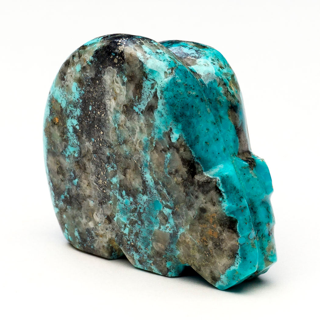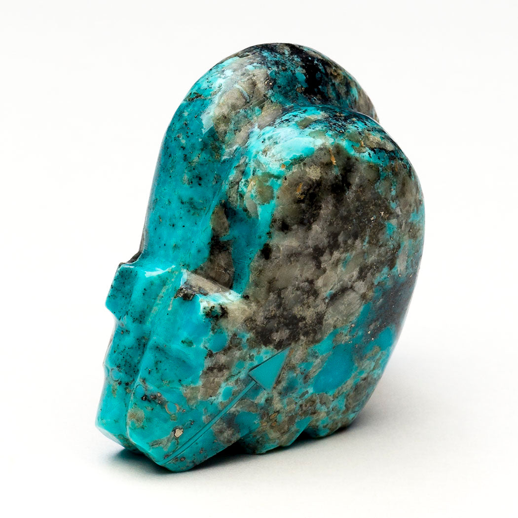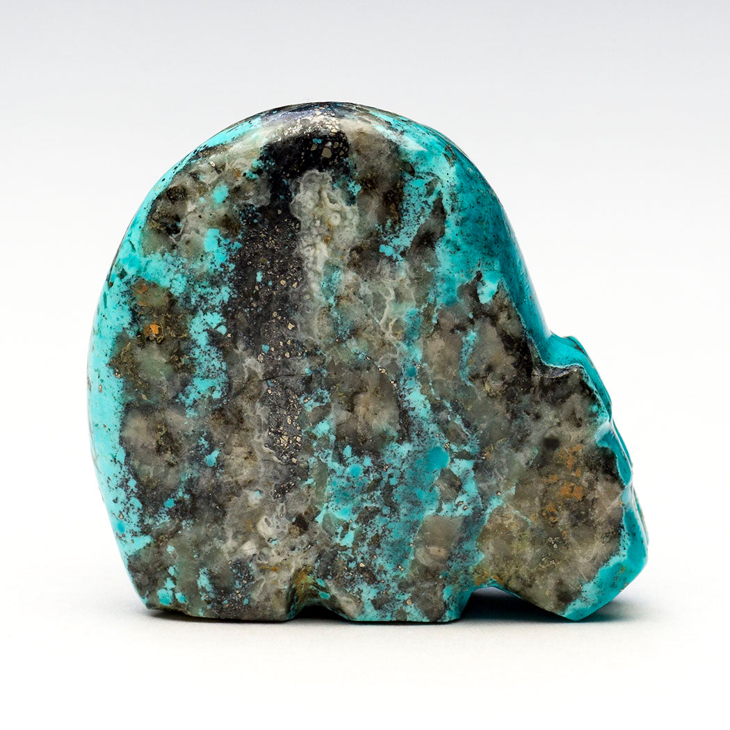 Abby Panteah's Medicine-bears or Bears lean on the other for strength. Many cultures have stories that tell of pairs who were once one whole and are now spilt, and perhaps this paired existence reminds us that we need to seek comfort and support from those that seem to complete us. Sculpted from one portion of matrix-rich turquoise with pyrite inclusions, this lovely duo measures approximately 1 3/8" long, 3/4" wide and 1 1/4" tall. Clayton Panteah expertly inlaid the eyes and heartline or breath path from turquoise.