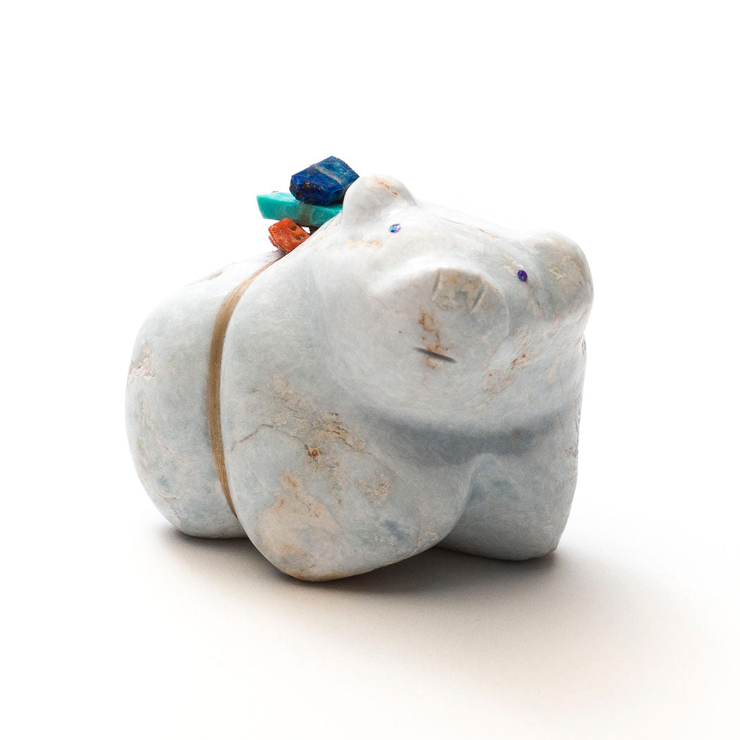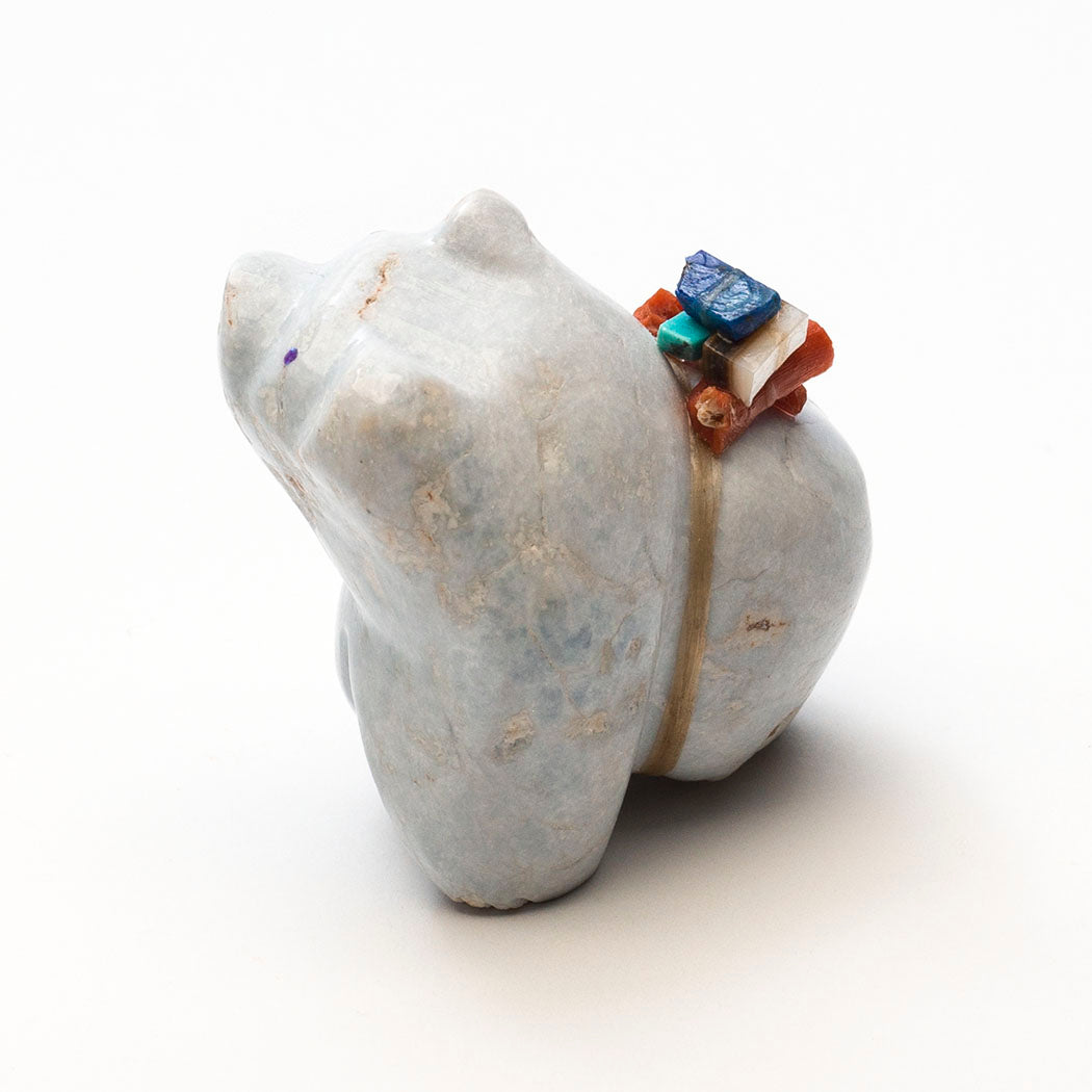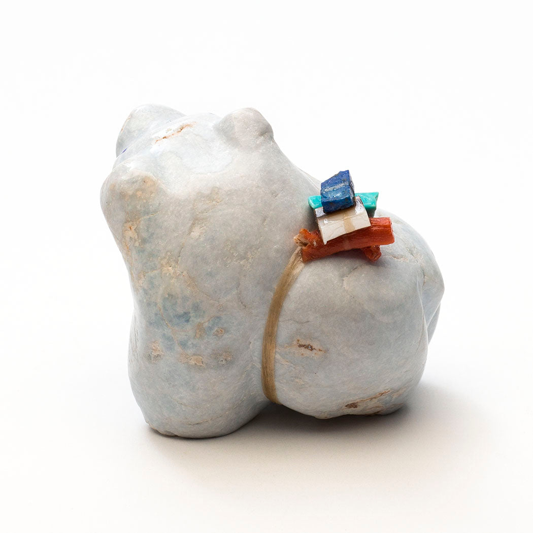 Angelite is a form of gypsum that's visually consoling said to promote compassion, which Daryl Shack, Sr.'s Bear sweetly expresses through a slightly turned head inlaid with complimentary blue and purple cultured opal eyes. He finished this approximately 2 1/4" long, 1 3/8" wide and 2 1/4" tall understanding friend with an offering bundle loaded with branch red coral, lapis and cultured opal pieces. Daryl calls his offering bundles a Shack Stack.