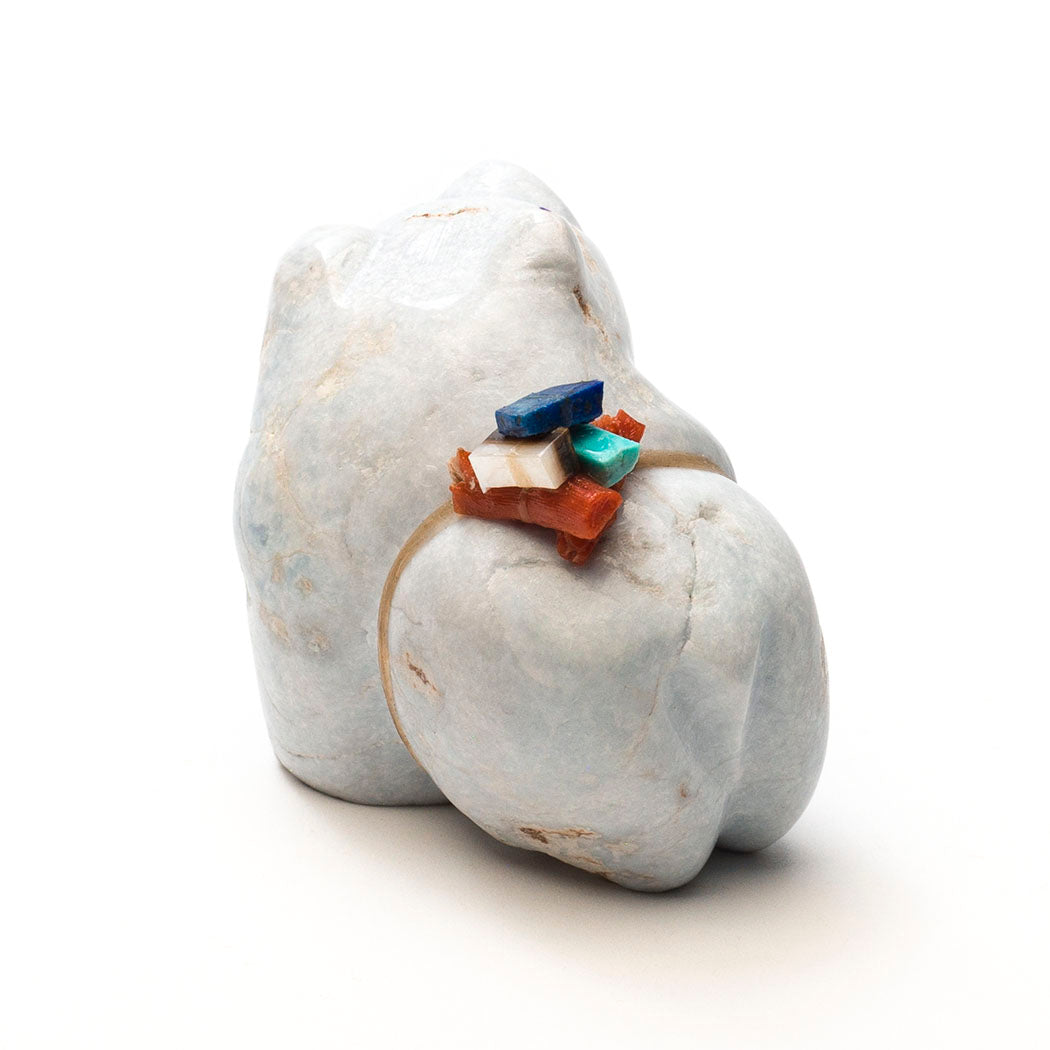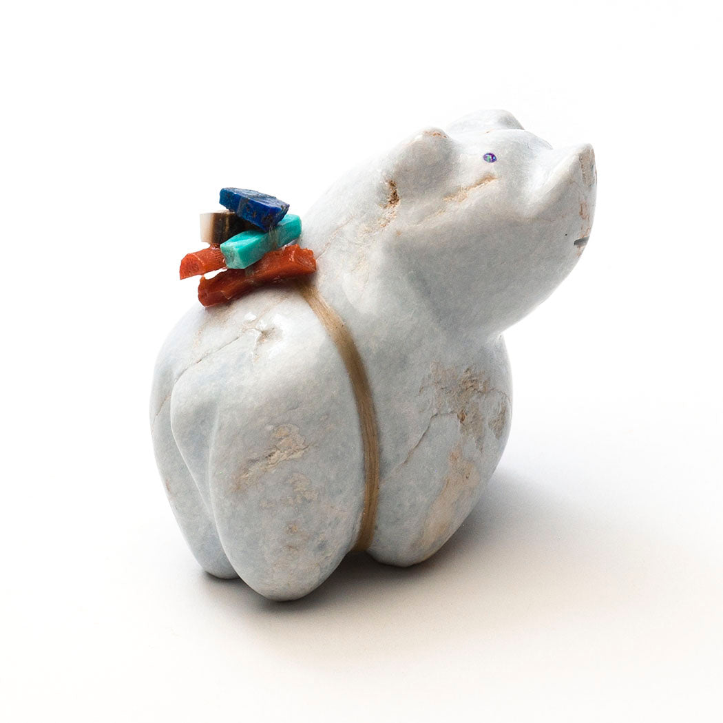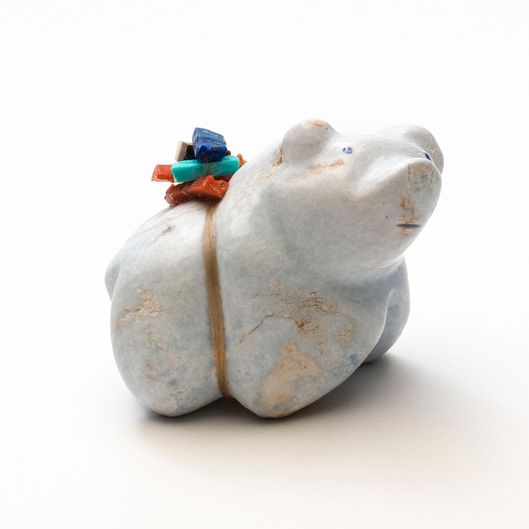 Angelite is a form of gypsum that's visually consoling said to promote compassion, which Daryl Shack, Sr.'s Bear sweetly expresses through a slightly turned head inlaid with complimentary blue and purple cultured opal eyes. He finished this approximately 2 1/4" long, 1 3/8" wide and 2 1/4" tall understanding friend with an offering bundle loaded with branch red coral, lapis and cultured opal pieces. Daryl calls his offering bundles a Shack Stack.