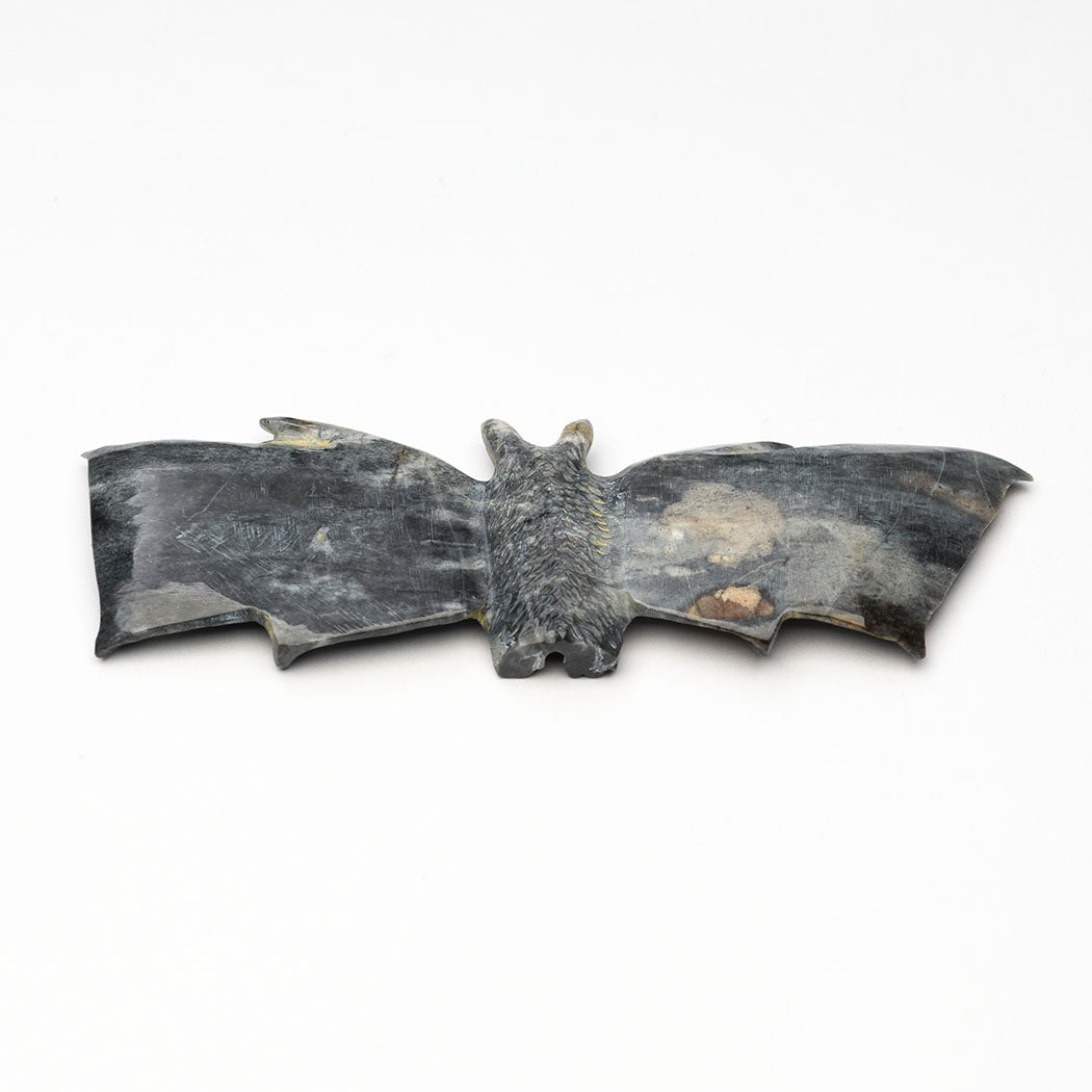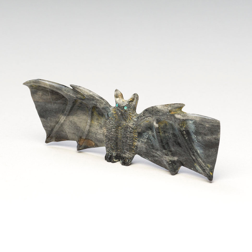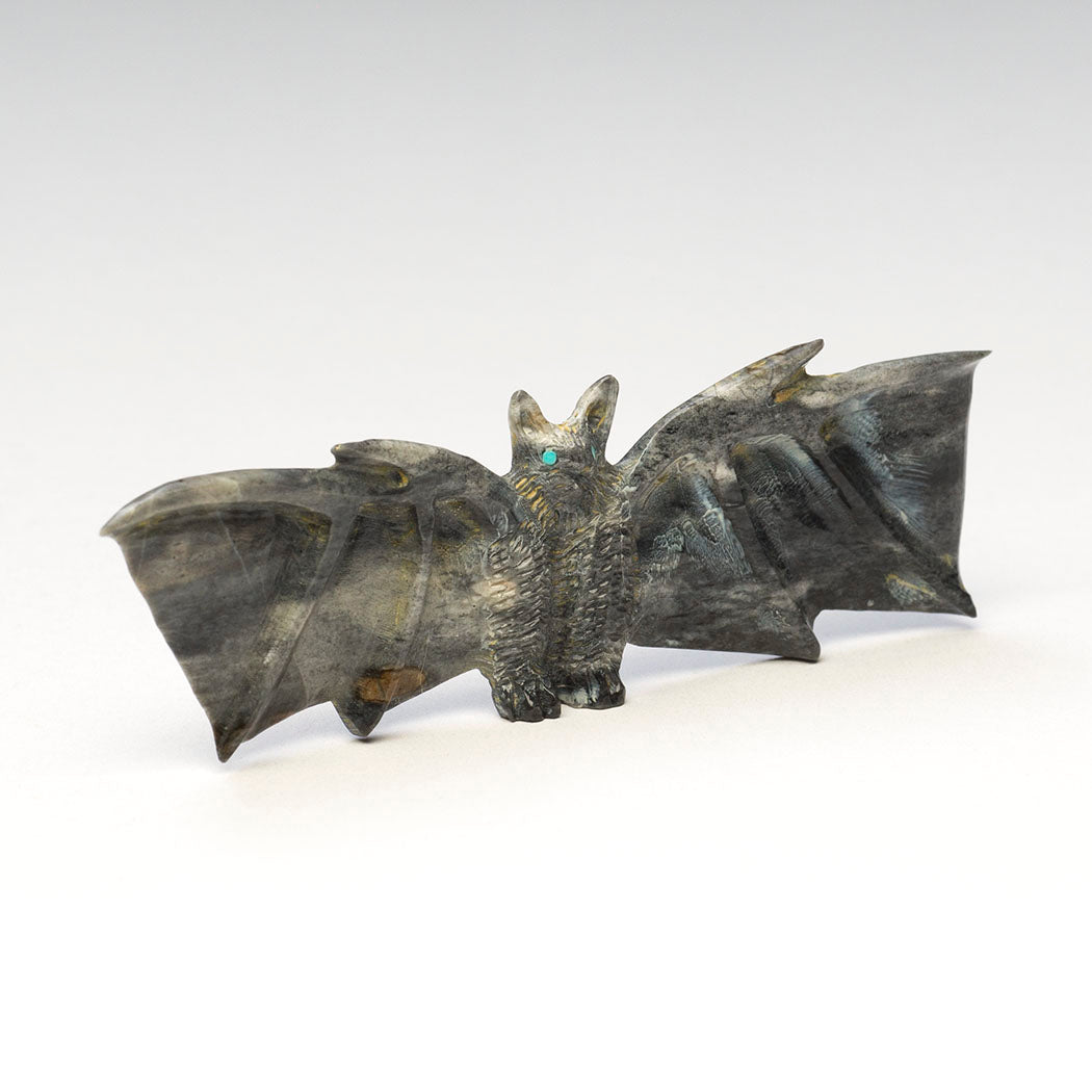Bat to spread silent wings, taking flight into the darkness. Carved from marble, this turquoise-eyed mammal will dine on many juicy insects acting as Mother Earth's natural pest control service. Exquisite forearm, thumb, finger and flight membranes are nicely detailed in this approximately 3 3/4" long, 1/4" wide and 1 1/4" tall beneficial creature of the night.