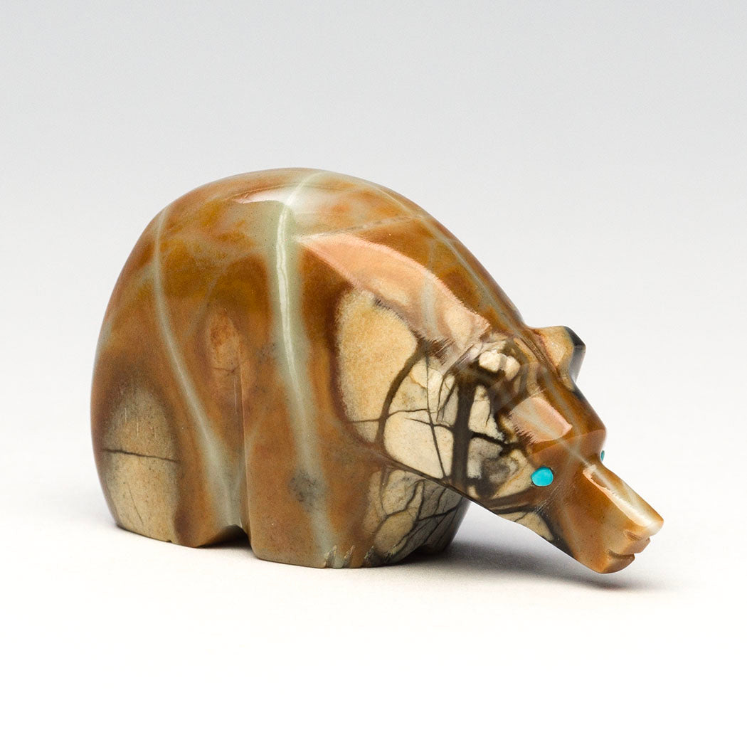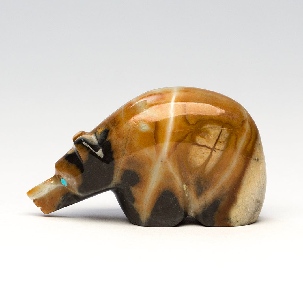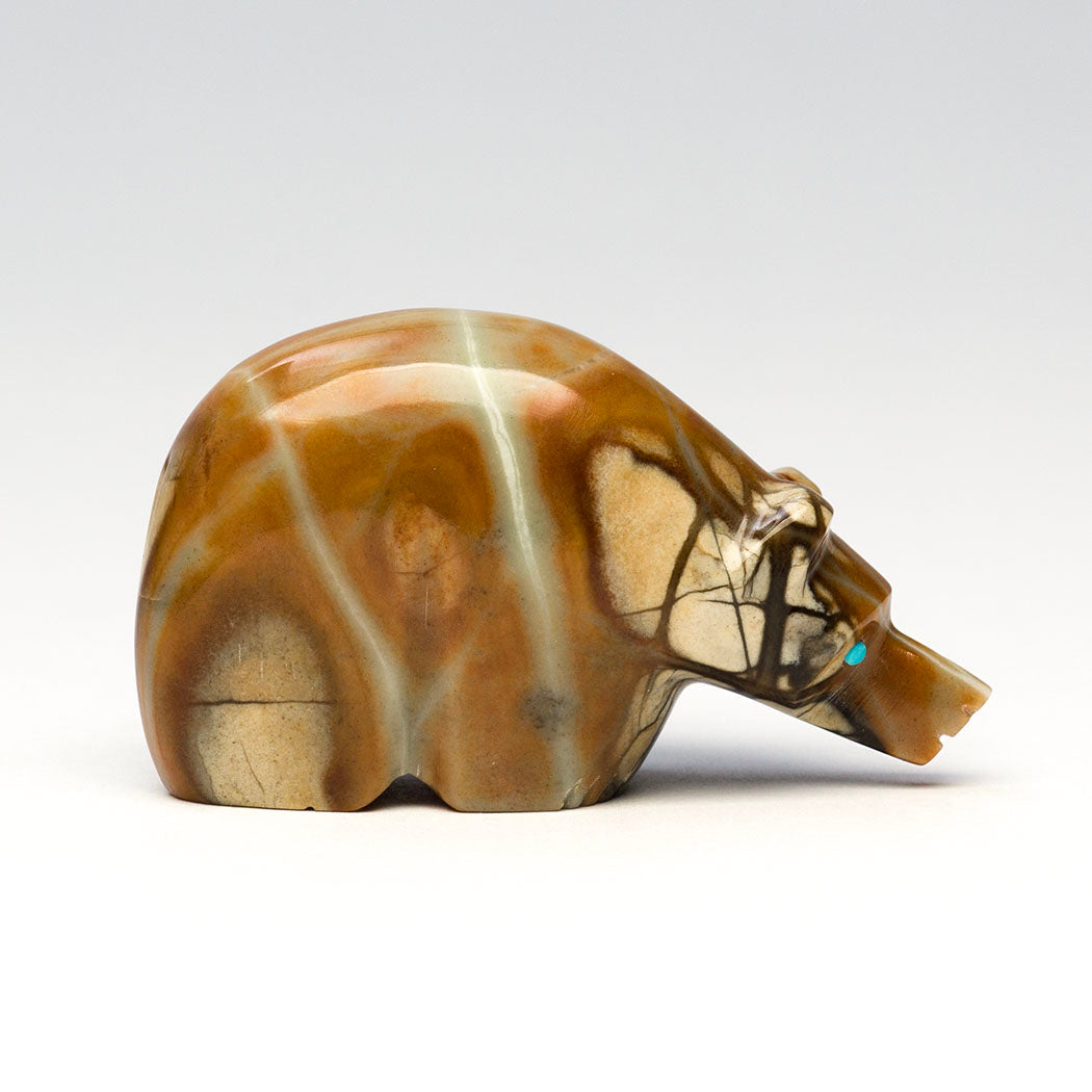 The late Terrence Tsethlikai's gentle Bear is a connection to Mother Earth. The stunning natural inclusions within the Picasso marble specimen are a joy to behold resembling the forest home of bears. Guiding eyes from turquoise inlays convey the mighty bear's powerful spirit, one who is a protector and teacher. About 2" long, 5/8" wide and 1 1/8" tall.