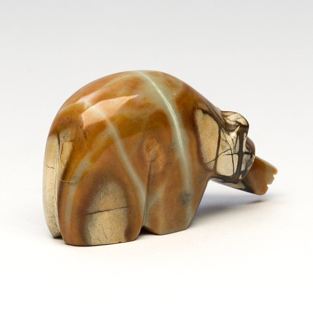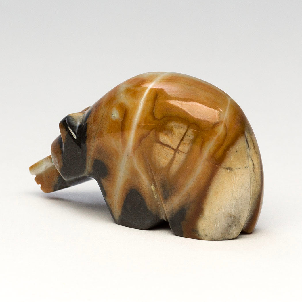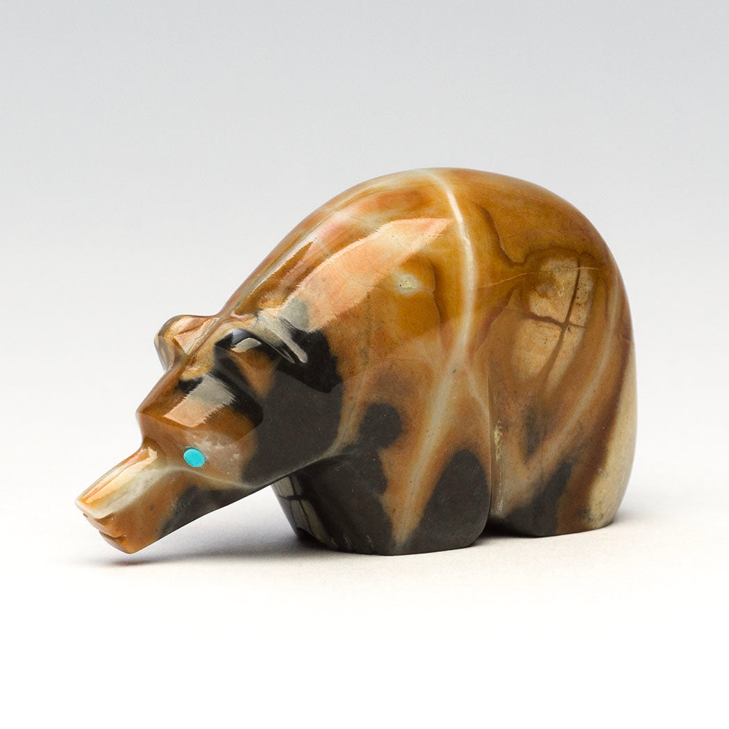 The late Terrence Tsethlikai's gentle Bear is a connection to Mother Earth. The stunning natural inclusions within the Picasso marble specimen are a joy to behold resembling the forest home of bears. Guiding eyes from turquoise inlays convey the mighty bear's powerful spirit, one who is a protector and teacher. About 2" long, 5/8" wide and 1 1/8" tall.