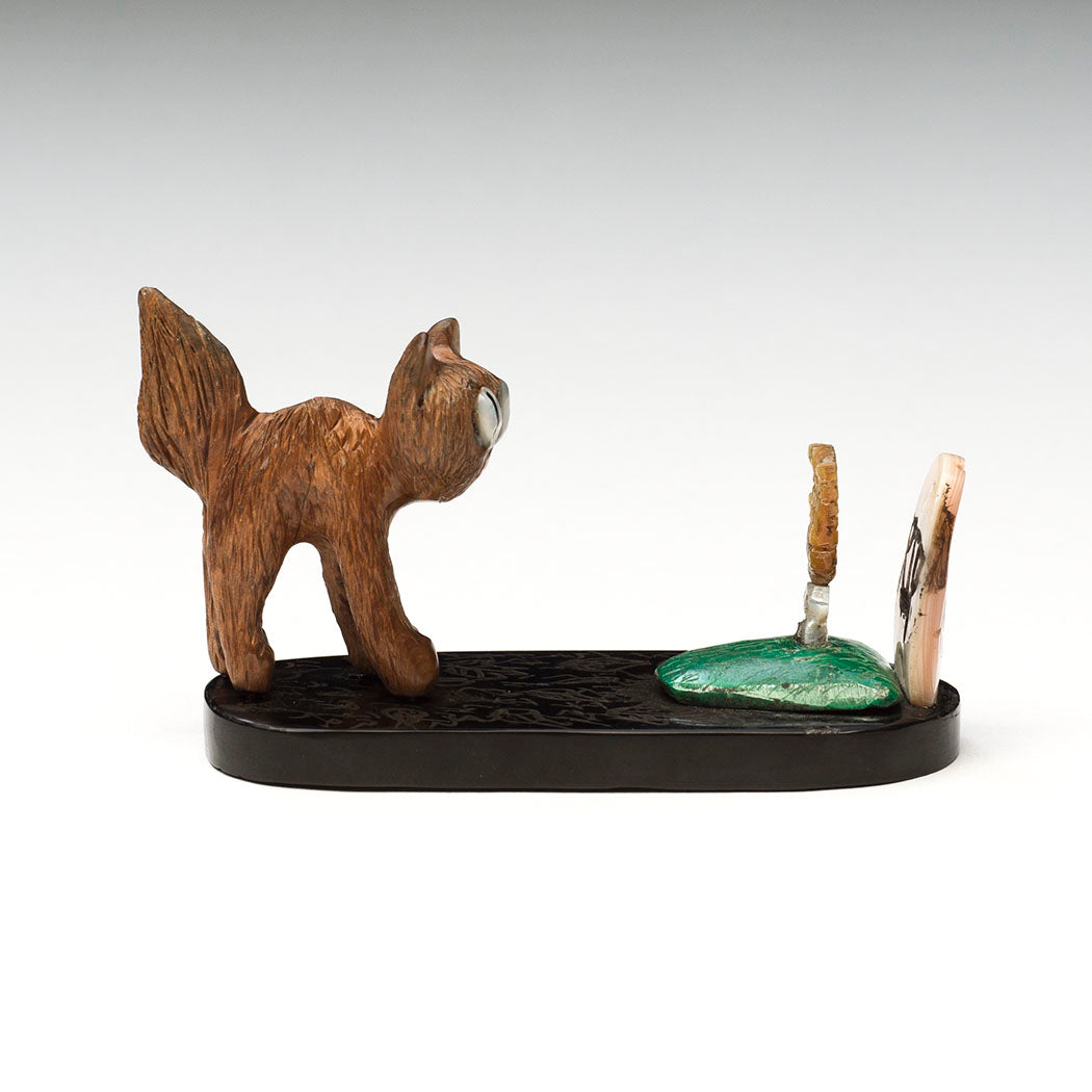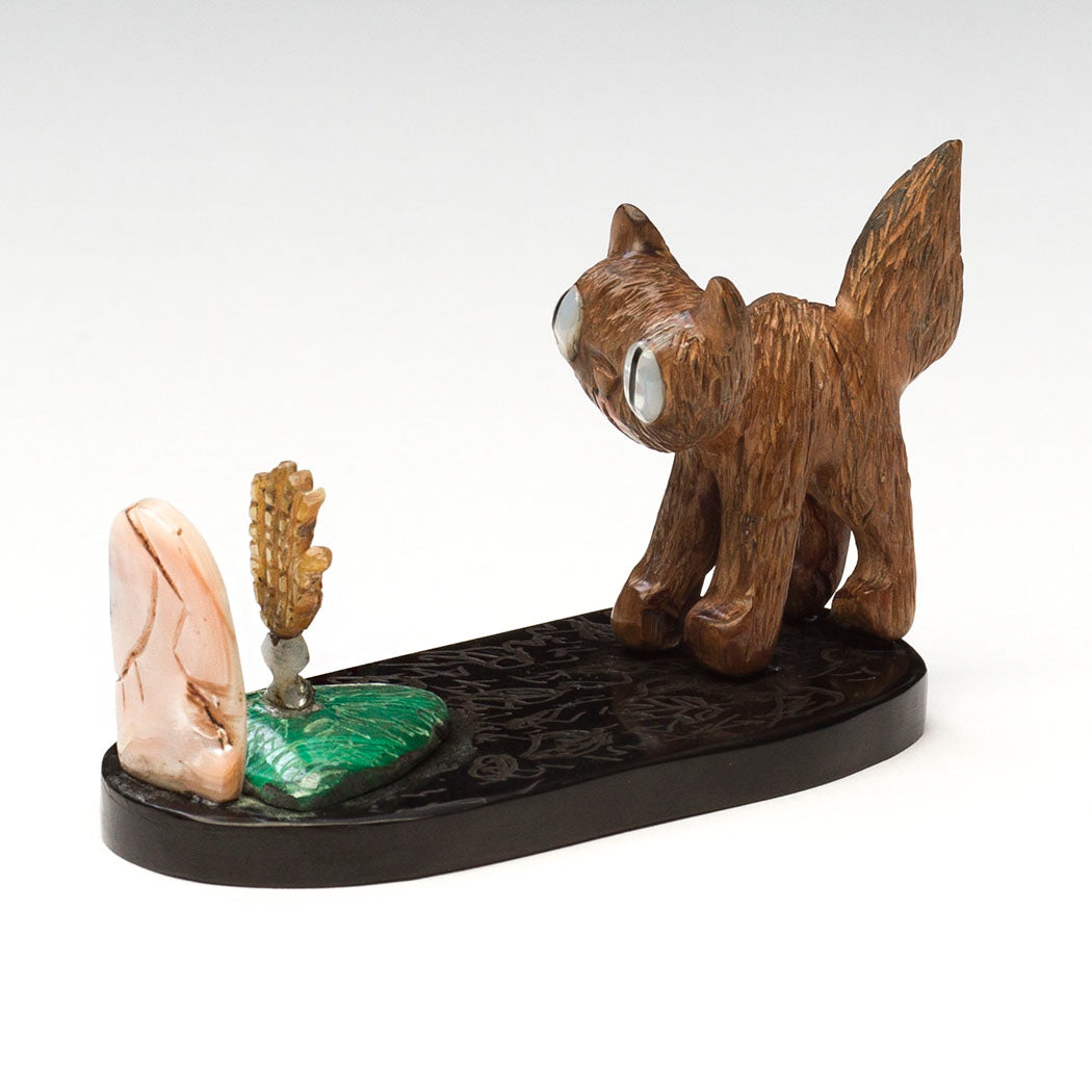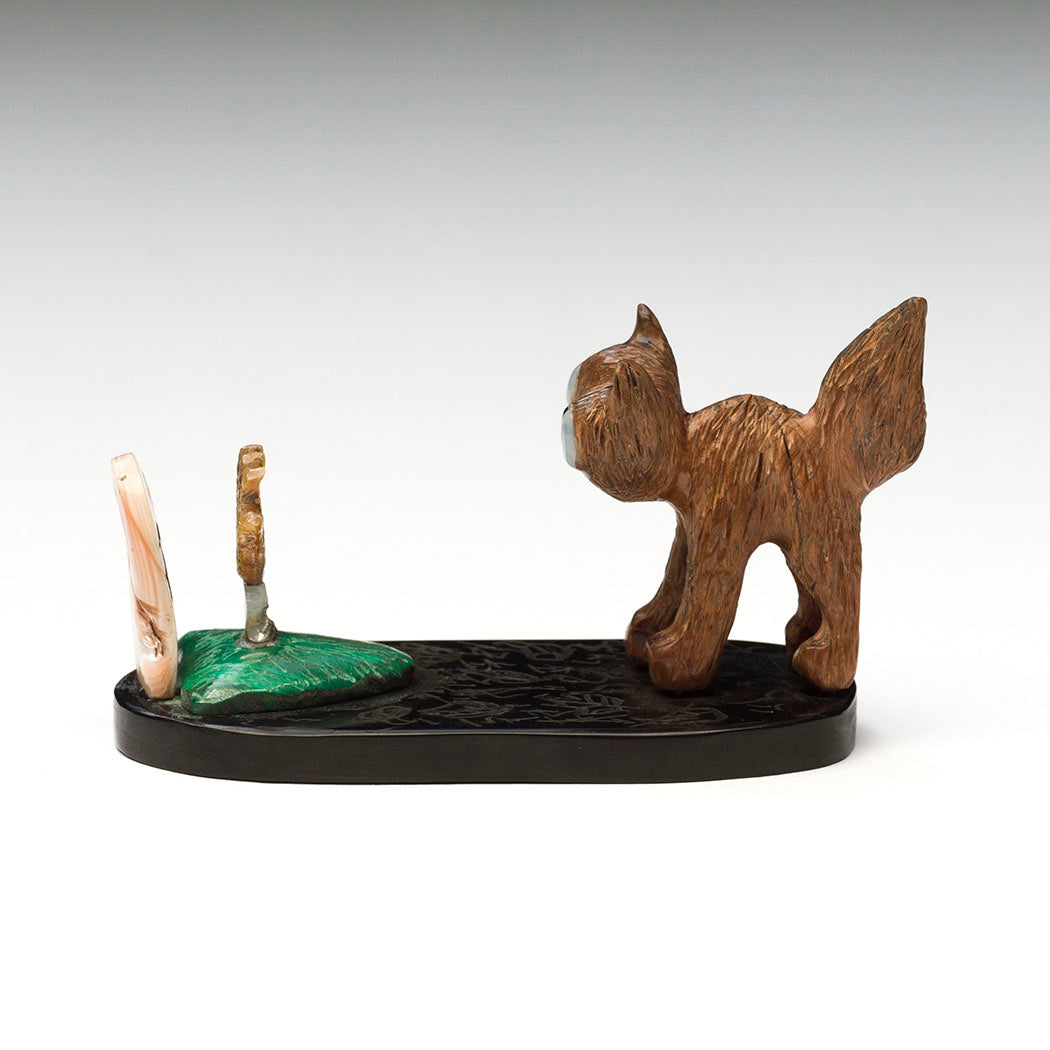 A hand eerily rises from a malachite burial mound spooking a nosy kitty cat who is sculpted from wood in Chad Quandelacy's Halloween-themed scene. The appendage is from etched gold lip shell and mother-of-pearl. The frightened feline has wonderful mother-of-pearl bulging eyes accented with jet, while a mouth is colorfully painted. The incised base is from jet and a pink mussel shell headstone is inscribed RIP. Dimensions of this collectible delight are about 3 1/2" long, 1 3/8" wide and 2 1/8" tall.