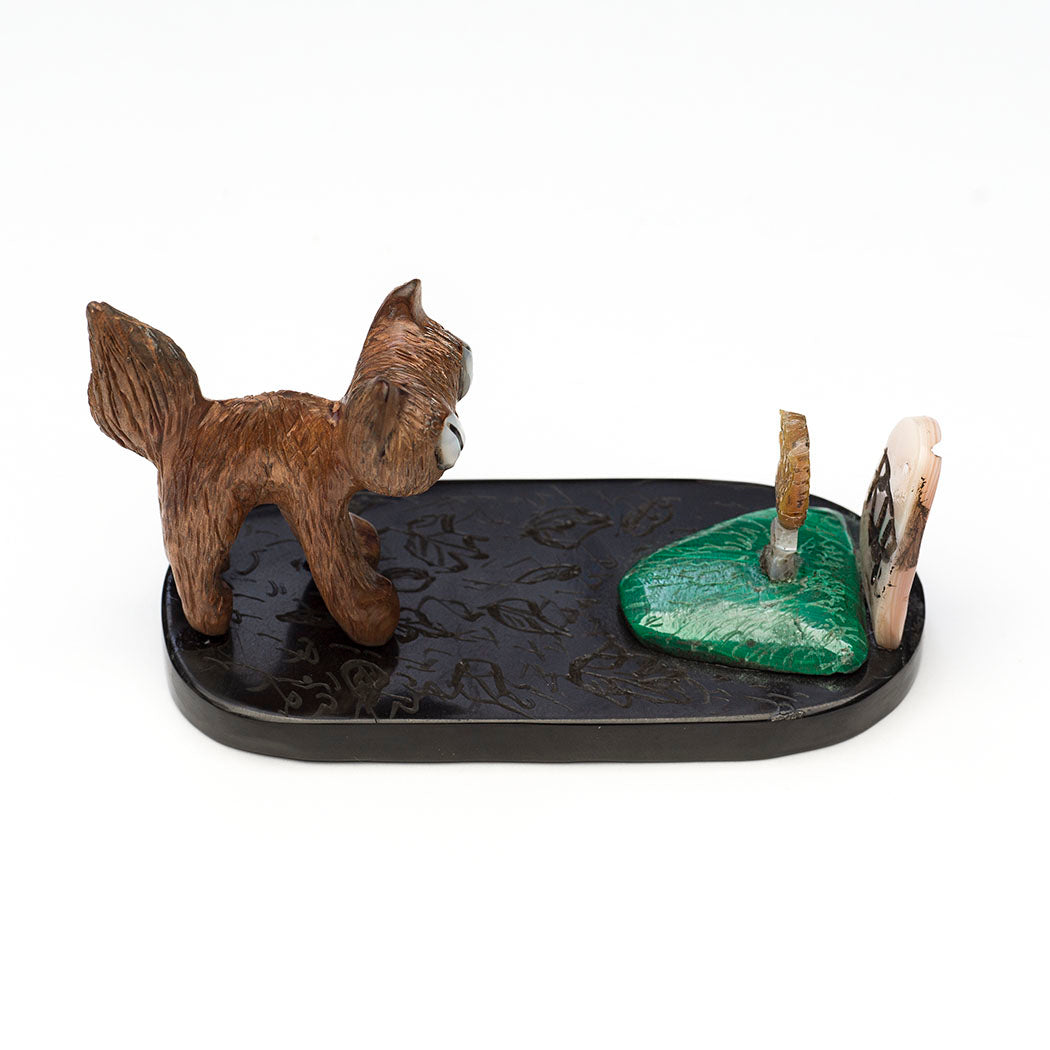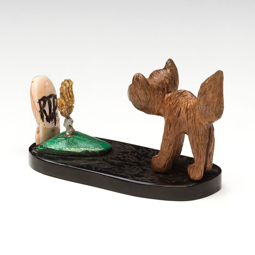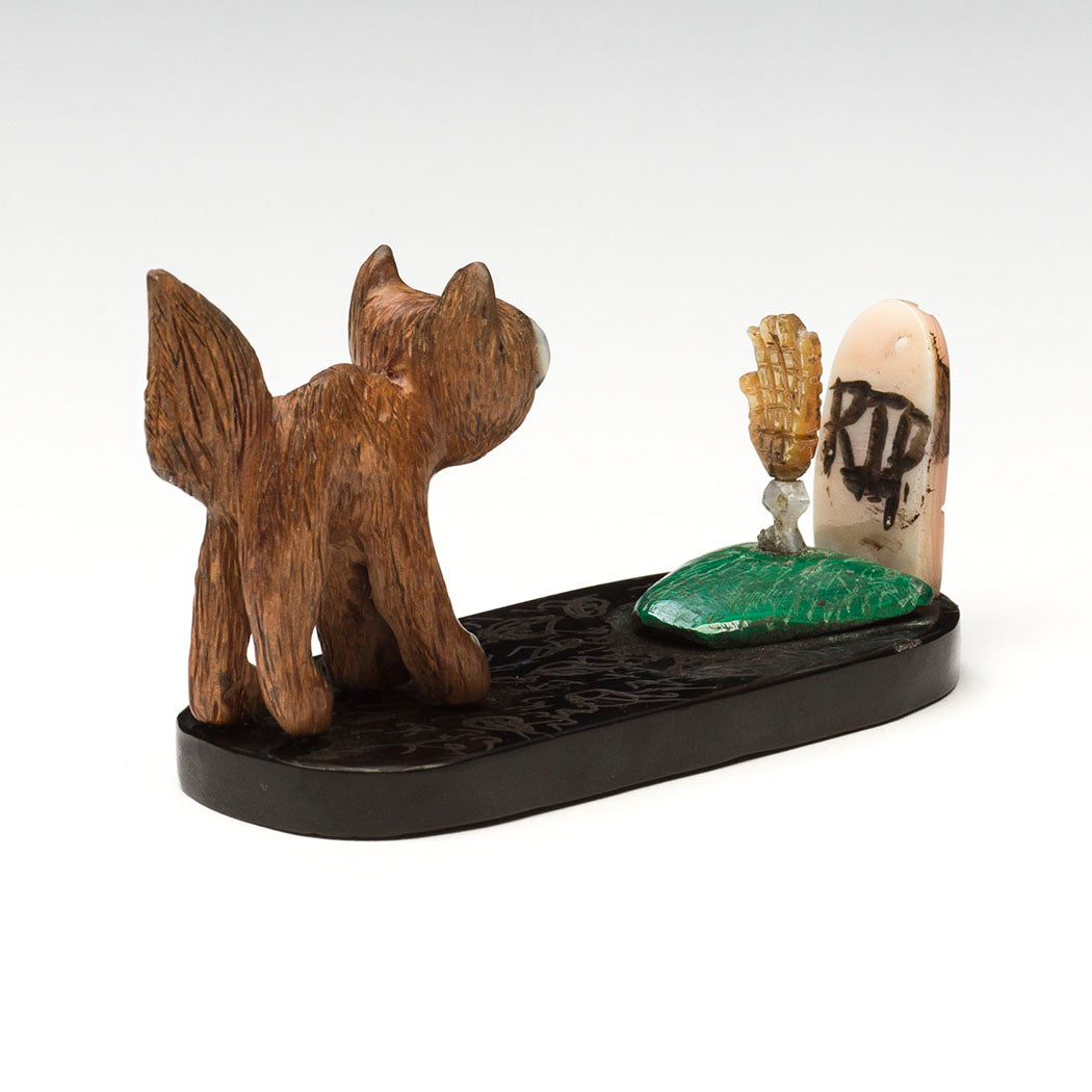 A hand eerily rises from a malachite burial mound spooking a nosy kitty cat who is sculpted from wood in Chad Quandelacy's Halloween-themed scene. The appendage is from etched gold lip shell and mother-of-pearl. The frightened feline has wonderful mother-of-pearl bulging eyes accented with jet, while a mouth is colorfully painted. The incised base is from jet and a pink mussel shell headstone is inscribed RIP. Dimensions of this collectible delight are about 3 1/2" long, 1 3/8" wide and 2 1/8" tall.