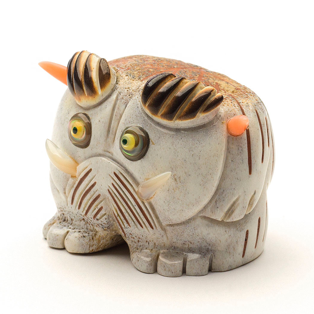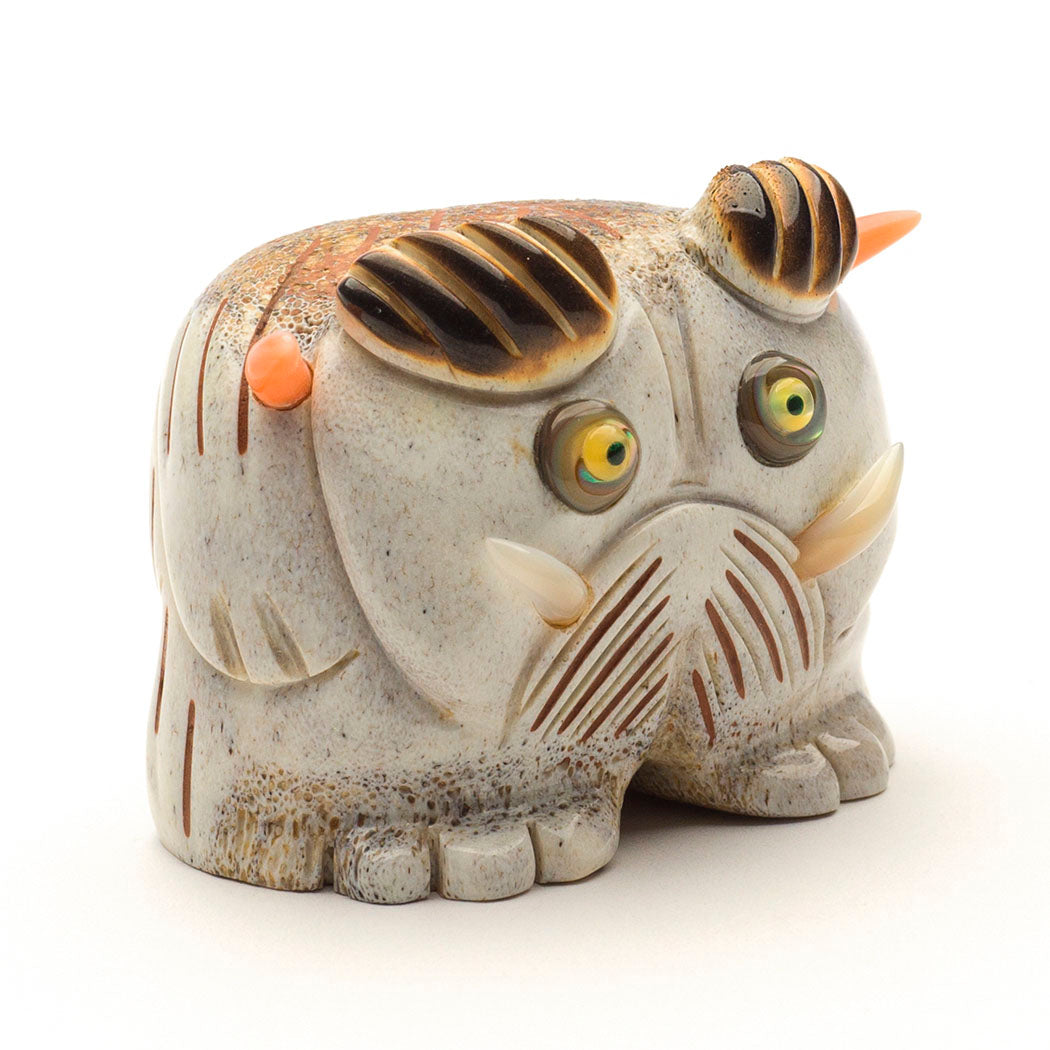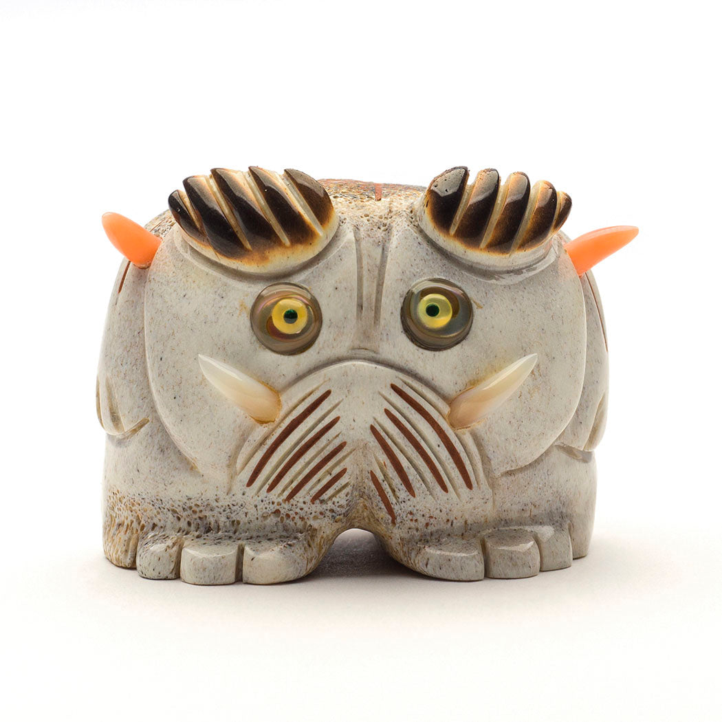A lost monster stops to ask "uh which way to the Halloween party?" We've been thrilled to share carving great Ray Tsalate's latest collection of whimsical beings each exquisitely featured. This sweet ogre has amazing eyes from malachite, gold lip shell and black lip shell inlays. Tufts or eyebrows are burnished, while lovely angel skin coral horns protrude. Upright tusks or cuspids come from iridescent mother-of-pearl. Chin whiskers are from pipestone paste inlays, as is the rest of the stubby furry body. Don't miss this collectible treat that's better than candy! About 1 5/8" tall, 2 1/8" wide and 1 5/8" deep, sculpted from antler.