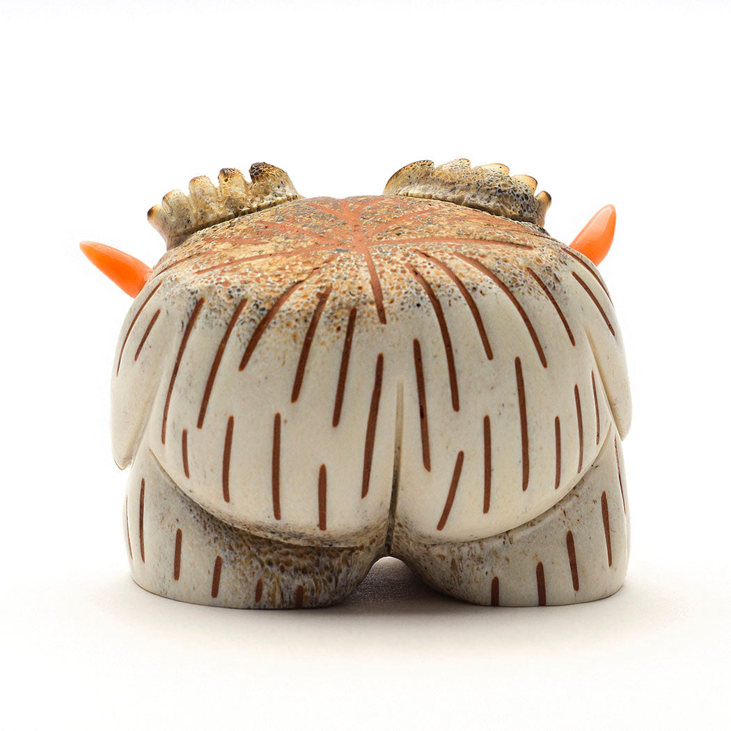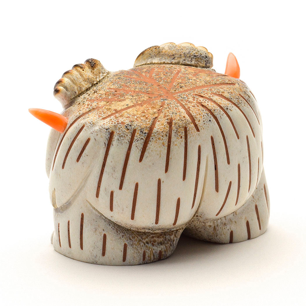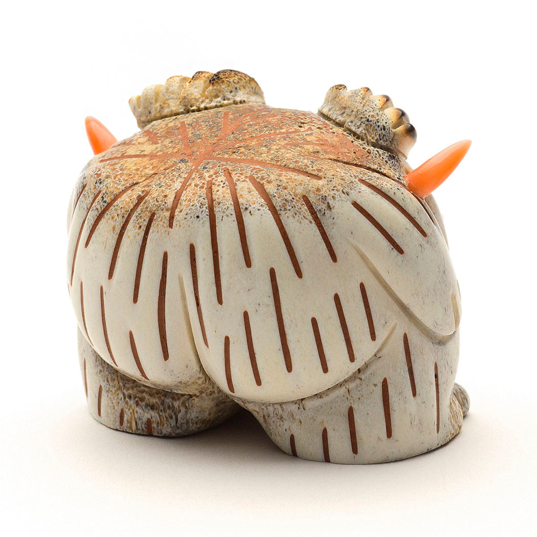 A lost monster stops to ask "uh which way to the Halloween party?" We've been thrilled to share carving great Ray Tsalate's latest collection of whimsical beings each exquisitely featured. This sweet ogre has amazing eyes from malachite, gold lip shell and black lip shell inlays. Tufts or eyebrows are burnished, while lovely angel skin coral horns protrude. Upright tusks or cuspids come from iridescent mother-of-pearl. Chin whiskers are from pipestone paste inlays, as is the rest of the stubby furry body. Don't miss this collectible treat that's better than candy! About 1 5/8" tall, 2 1/8" wide and 1 5/8" deep, sculpted from antler.