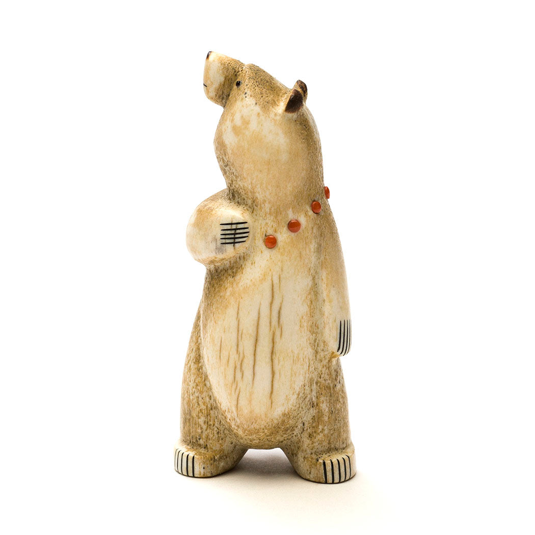 Bear strolls the evergreen forest. Pen shell inlaid eyes look up a tall tree to see the many birds perched there. Carved from antler, dimensions of this leisurely walking friend are approximately 3 1/4" tall, 1 3/8" wide and 1" deep. We love the adorable ears, nose and little tail that are burnished on the creature. A necklace is inlaid from red coral pieces and paw details are from jet. For The A:Shiwi (The People) standing bears are regarded as demonstrating strength.