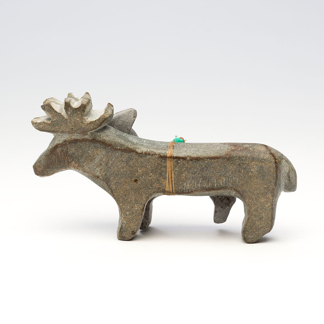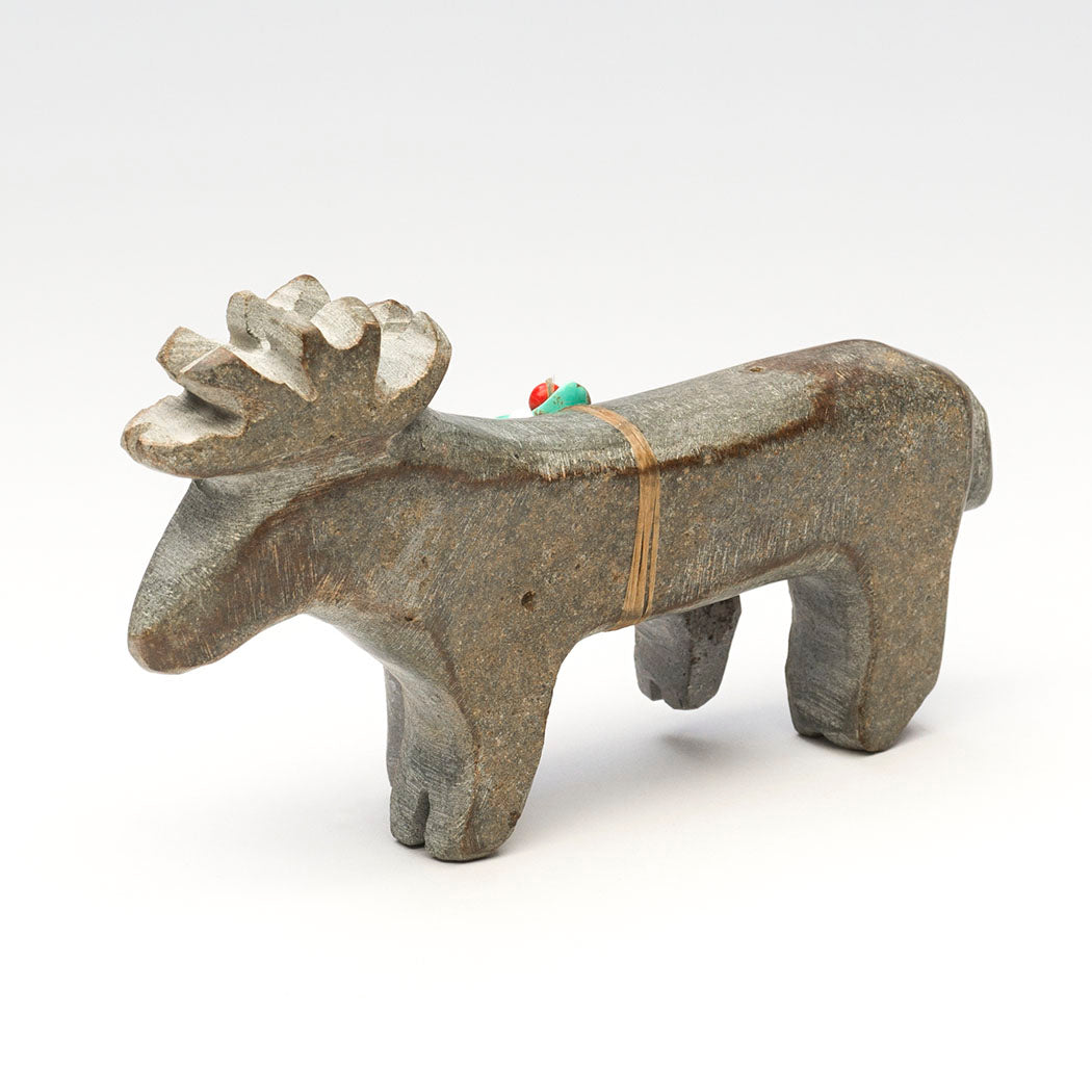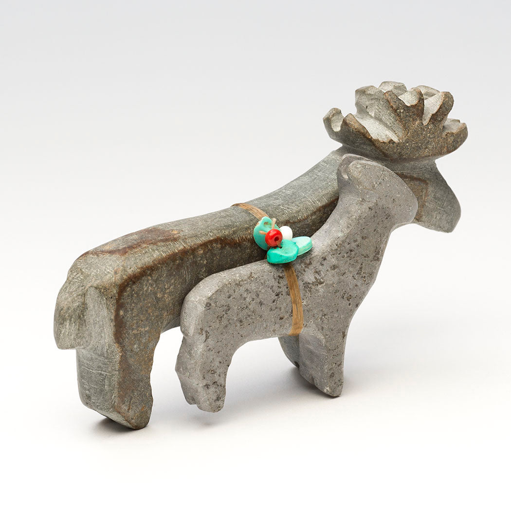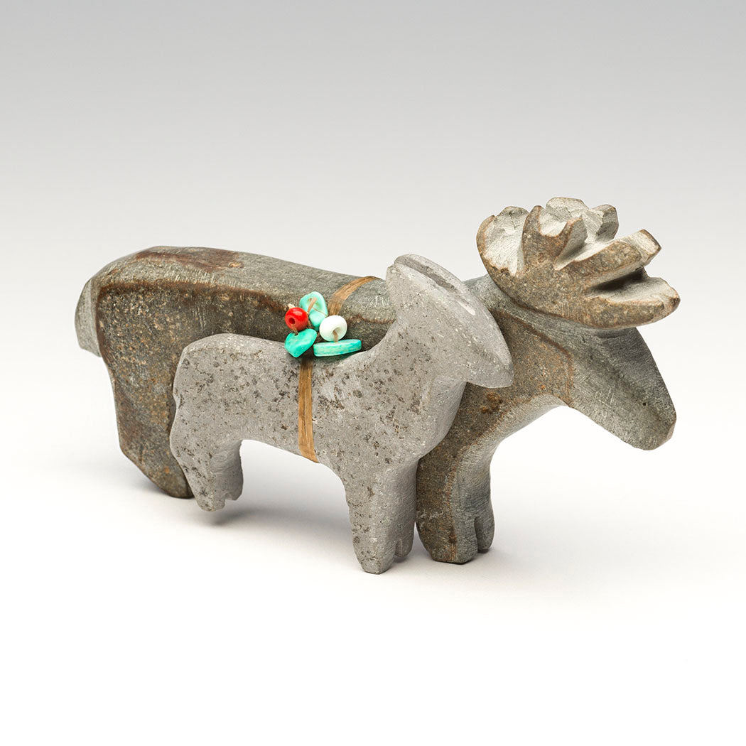 Elk) by Salvador Romero are carved from two separate found stones originating at Cochiti Pueblo. The stag's stone hosts handsome rusty red colors hinting at what the outer surface once looked like. They are bound together with a bright offering bundle from assorted turquoise and coral beads among others.