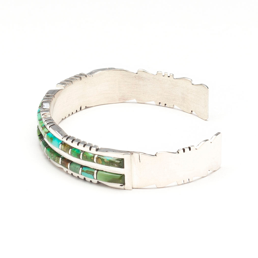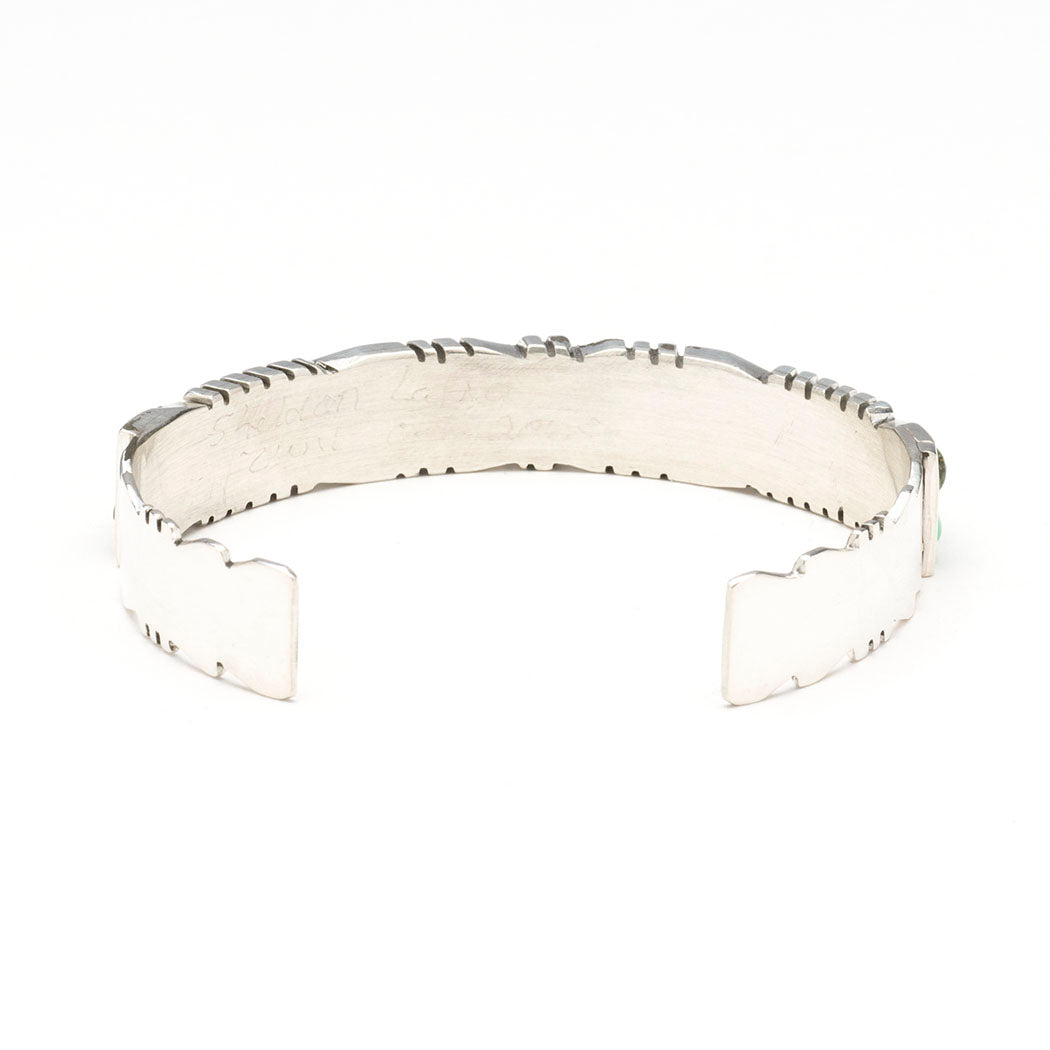 Skillfully created in the channel inlay technique where silver channels rest meticulously between stone or shell, Sheldon Lalio's good-looking sterling silver cuff bracelet features fresh turquoise stones. The lovely bracelet's entire inner circumference is about 6 3/8" which includes the opening of approximately 1 1/4". The bracelet's width is a flattering 3/8". You'll surely receive compliments wearing this wonderful work of art. Signed by the artist. Please click