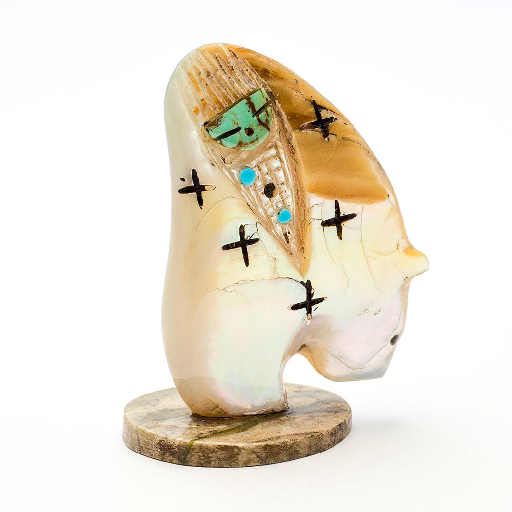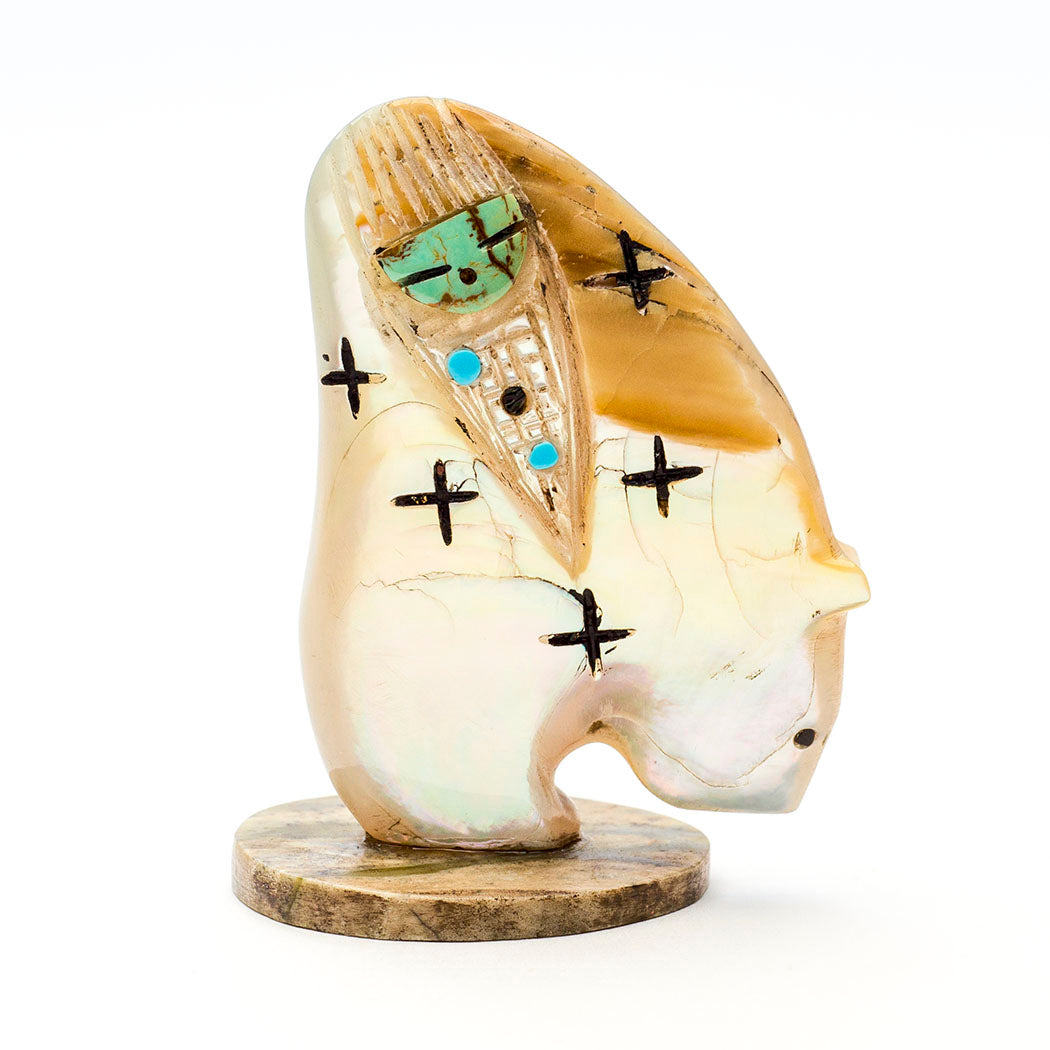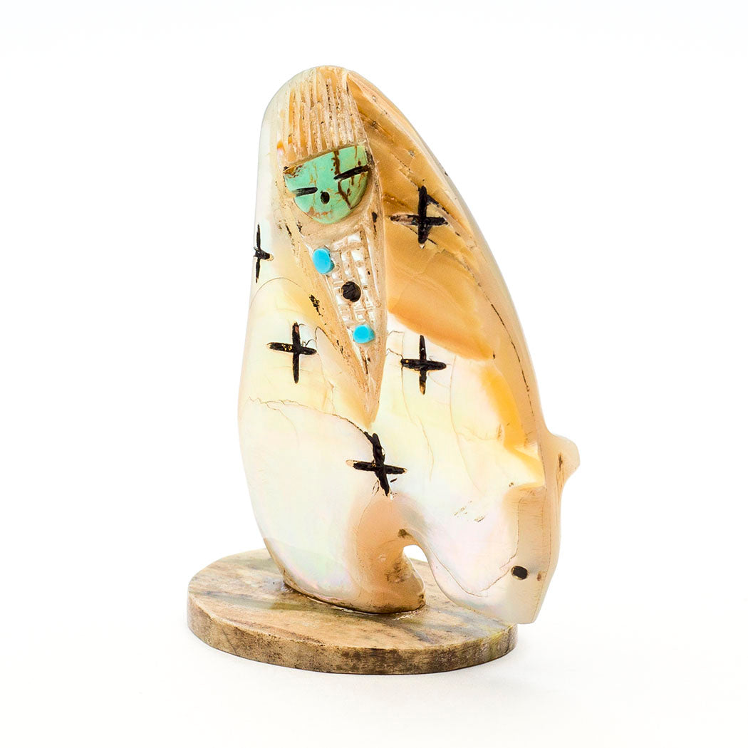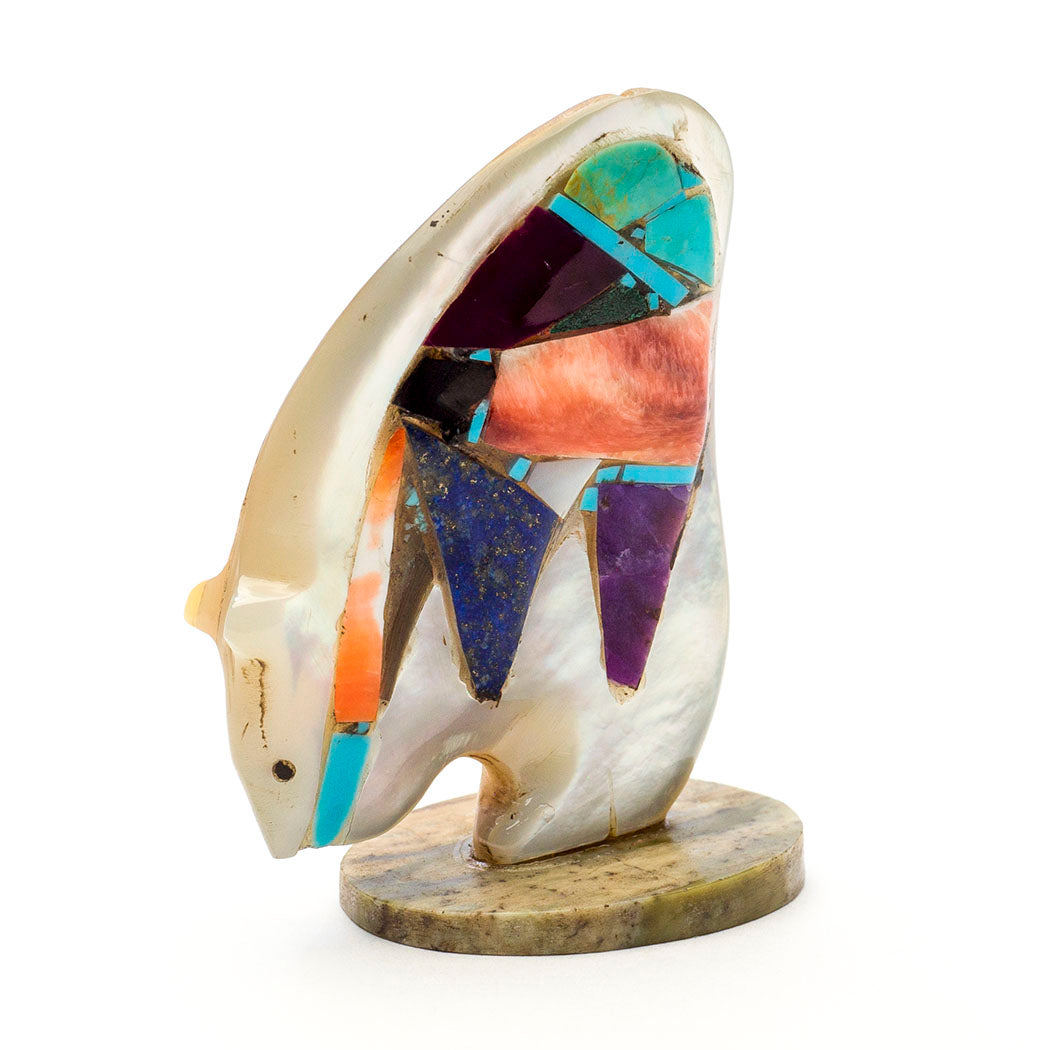 Enjoy two views in Chad Quandelacy's reversible carving from iridescent mother-of-pearl. One side has a stunning mosaic from turquoise, alunite, jet, spiny oyster shell, lapis lazuli, sugilite, mother-of-pearl and pen shell. The reverse holds a Zuni Corn-Maiden with a face from overlaid turquoise. Including the watermelon serpentine base, measurements are about 2 1/4" tall, 1 5/8" wide and 1" deep. The curvy Medicine-Bear has jet eyes.