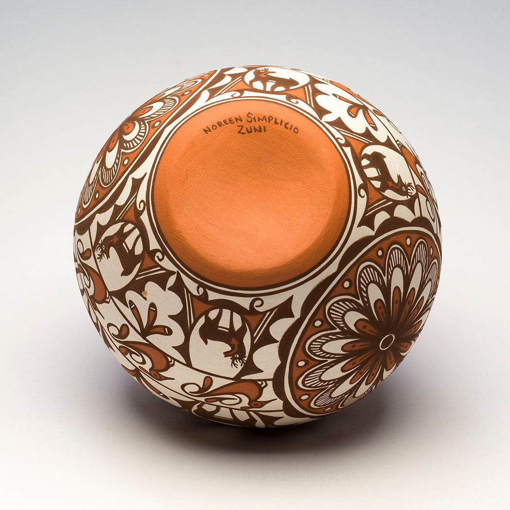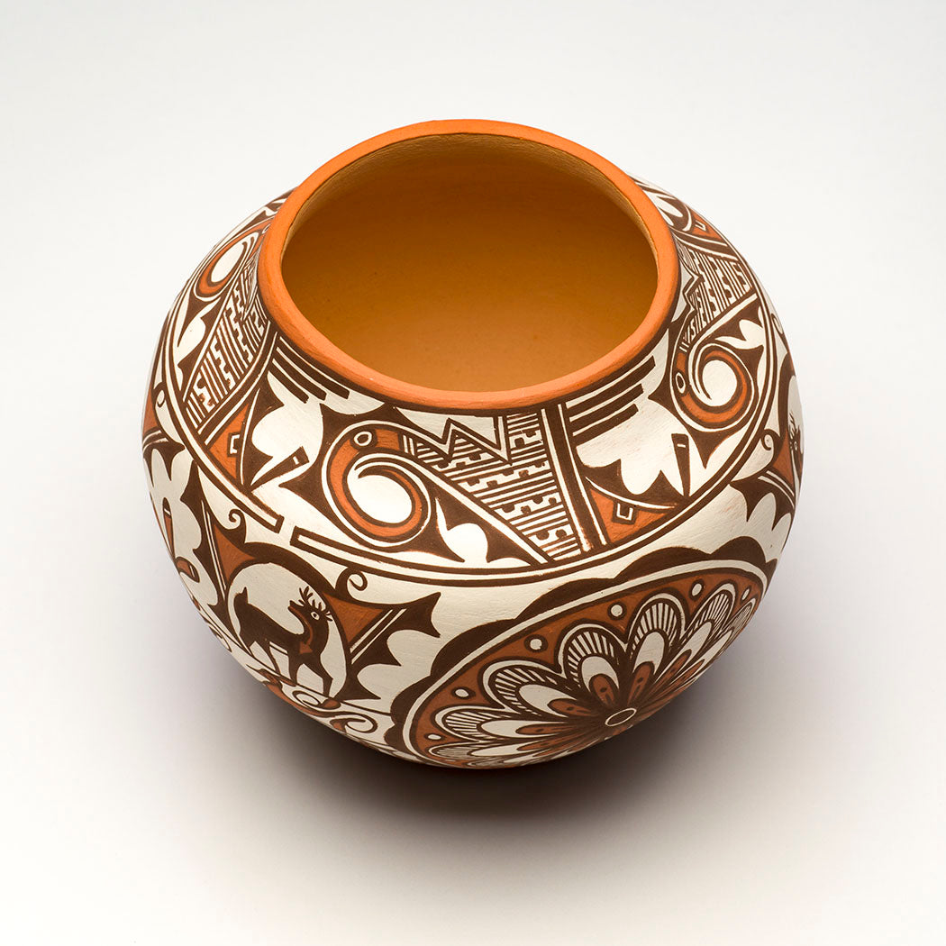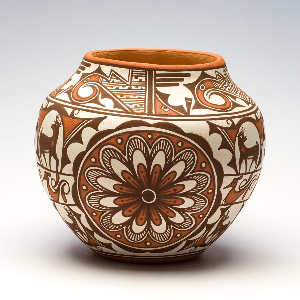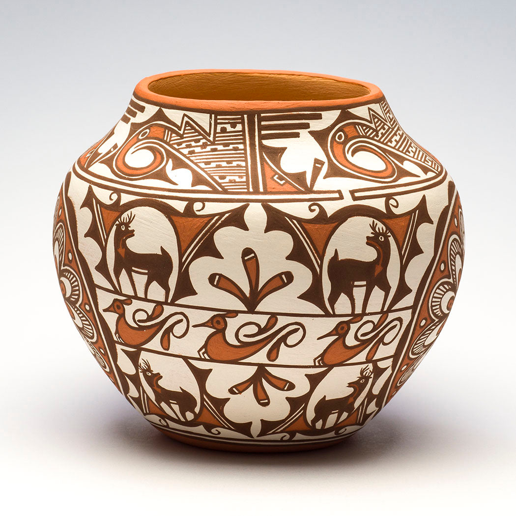 The tradition of Zuni pottery-making is a rich one, having been practiced for more than a thousand years to produce both functional and ceremonial vessels. By the middle of the last century however, this art form was fairly dormant, having given way to jewelry-making, the main support of the Zuni economy. Over the last fifty years, pottery-making has been revived through ceramics classes at Zuni High School and some dedicated and gifted instructors such as Daisy Hooee Nampeyo, Jenny Laate and Josephine Nahohai. In the mid-1980’s, the Zuni Tribal Arts and Crafts Enterprise sent six Zuni potters to the Smithsonian to study older Zuni pottery. They found inspiration in viewing the old anew.