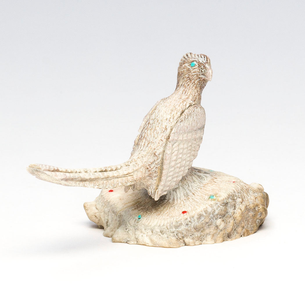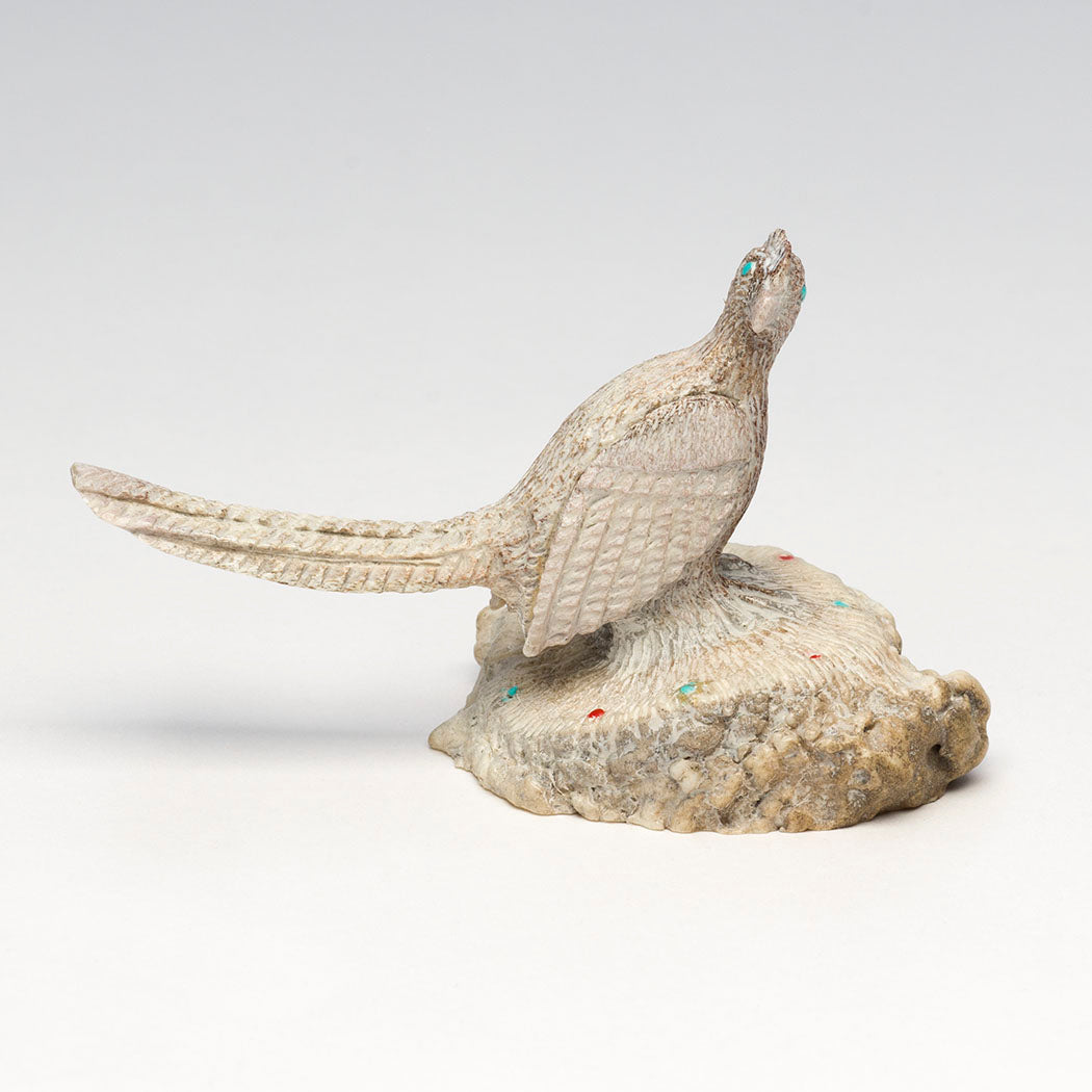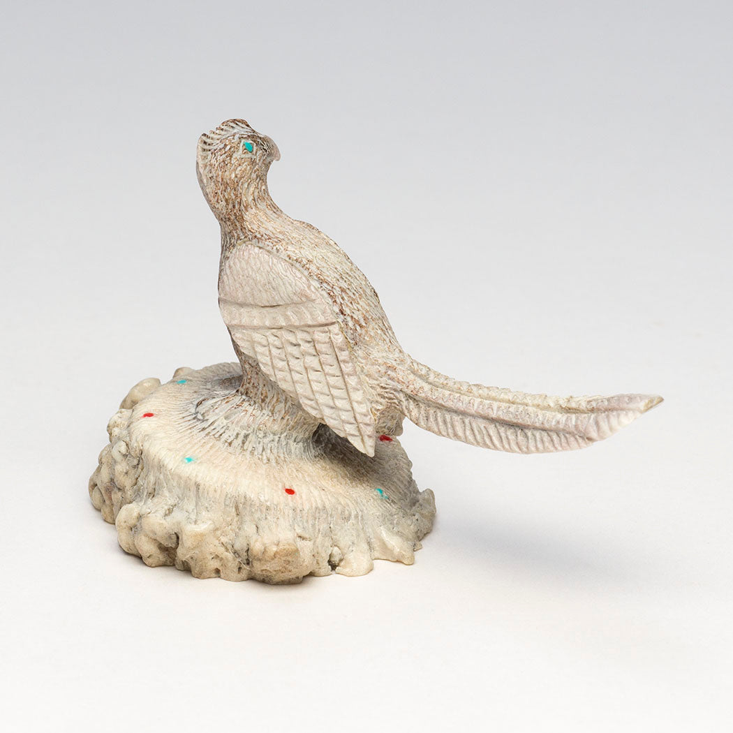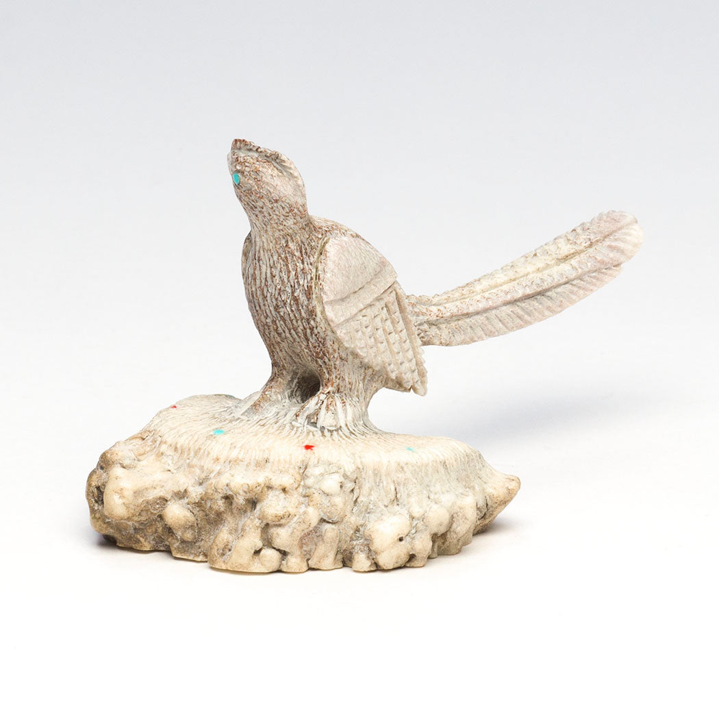 Todd Lowsayatee descends from the greater Hustito and Lowsayatee family of noted Zuni artists. His brother is carver Marlon Lowsayatee. Todd is a master when it comes to carving in antler. His birds reveal complex plumage as seen in a crested roadrunner with turquoise inlaid eyes and sweeping tail feathers. The lovely perched desert bird is sculpted from one portion of antler including burr inlaid with colorful red coral and turquoise accents, a thoughtful touch. Dimensions in their entirety are approximately 3 3/4" long, 2" wide and 2 1/2" tall.