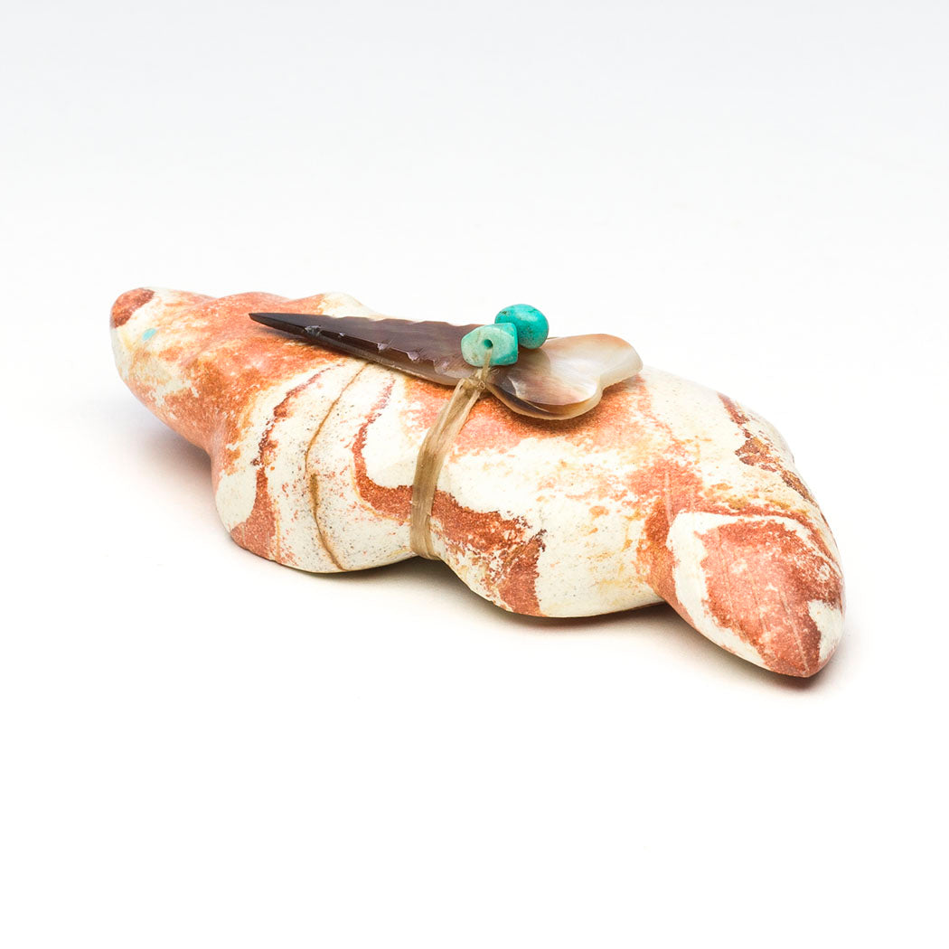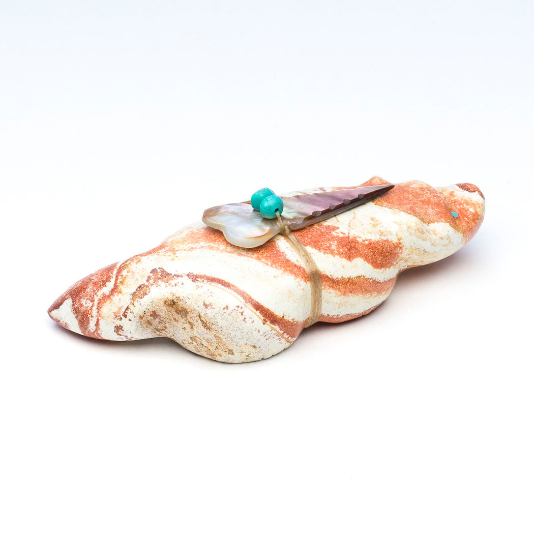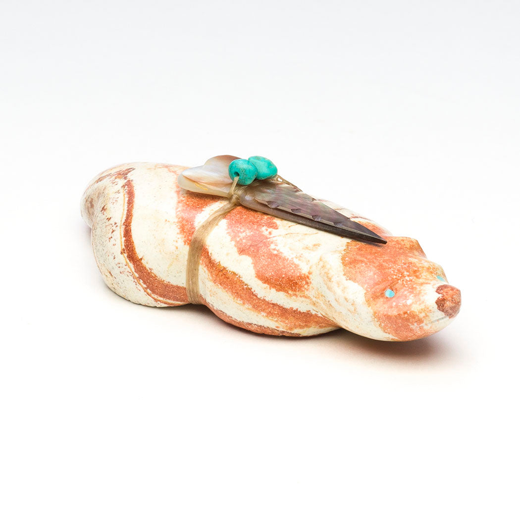 Badgers are strong-willed animals setting a fine example in regards to accomplishing our goals. Pressing on and following through is what they do and so should we. Daphne and Leland Boone's rhyolite beneath the ground badger has focused eyes from turquoise inlays and is approximately 3 7/8" long, 1 5/8" wide and 1 1/8" tall. An iridescent black lip shell point with turquoise beads offering bundle is secured. Rhyolite is a gorgeous volcanic fine-grained rock.