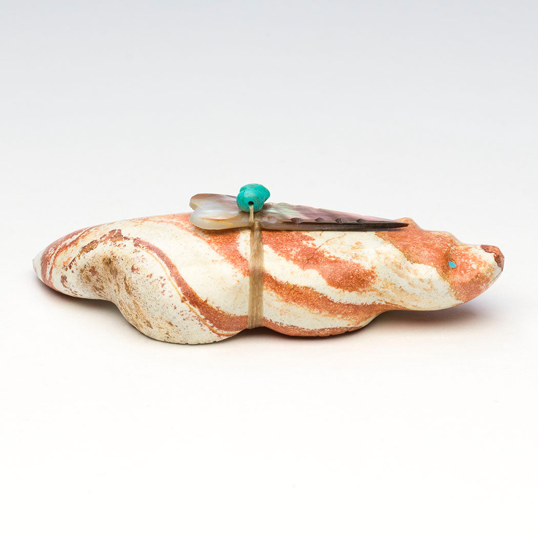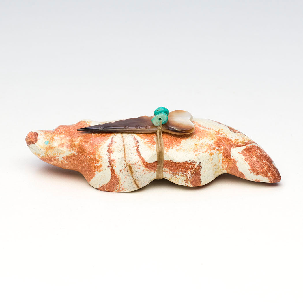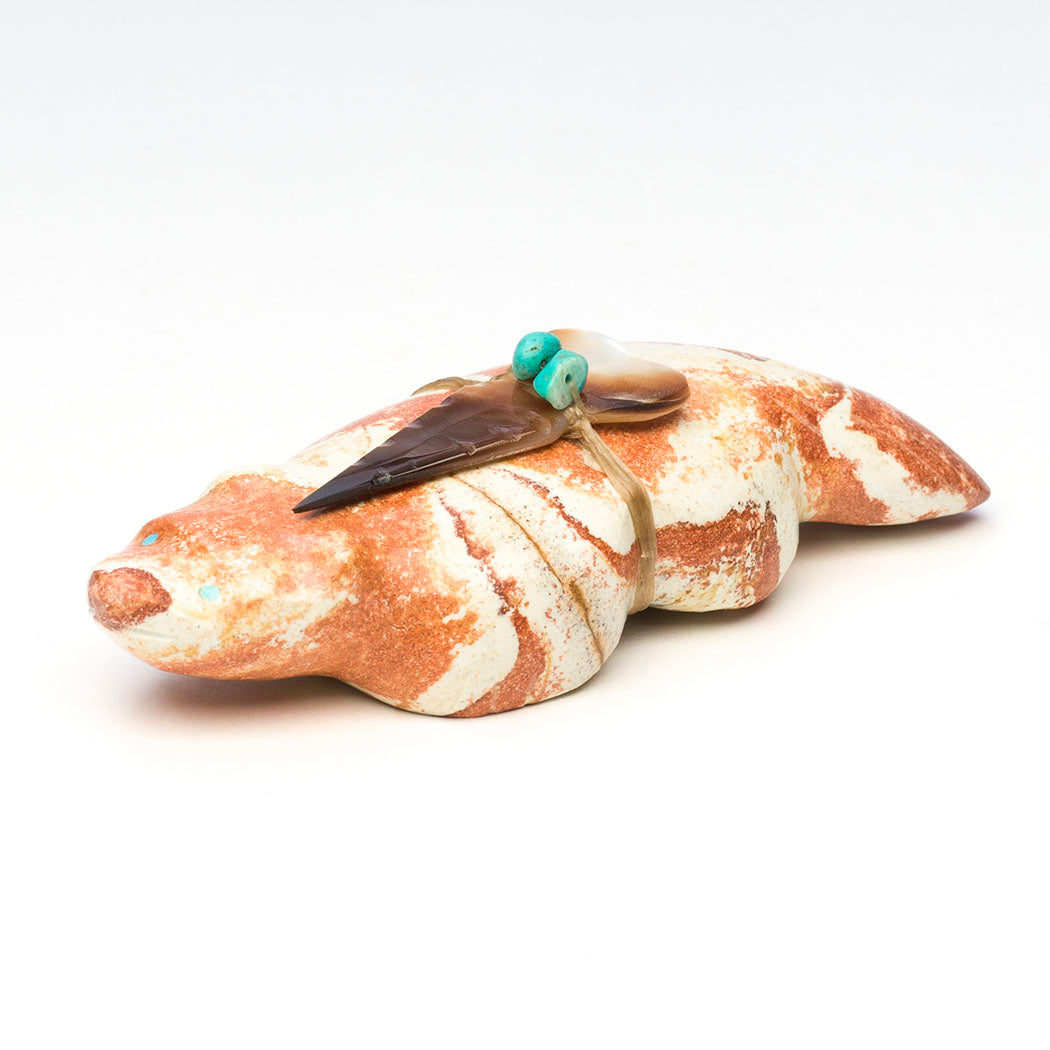 Badgers are strong-willed animals setting a fine example in regards to accomplishing our goals. Pressing on and following through is what they do and so should we. Daphne and Leland Boone's rhyolite beneath the ground badger has focused eyes from turquoise inlays and is approximately 3 7/8" long, 1 5/8" wide and 1 1/8" tall. An iridescent black lip shell point with turquoise beads offering bundle is secured. Rhyolite is a gorgeous volcanic fine-grained rock.