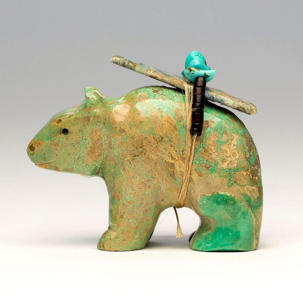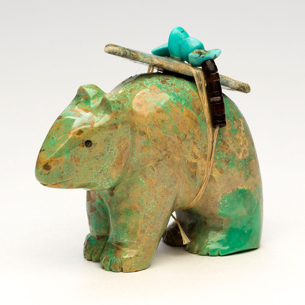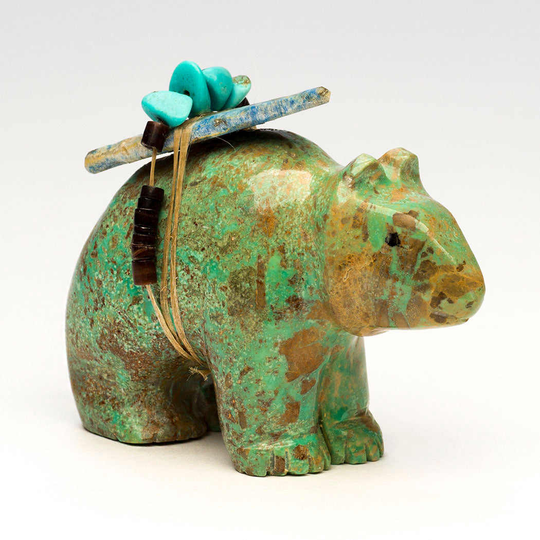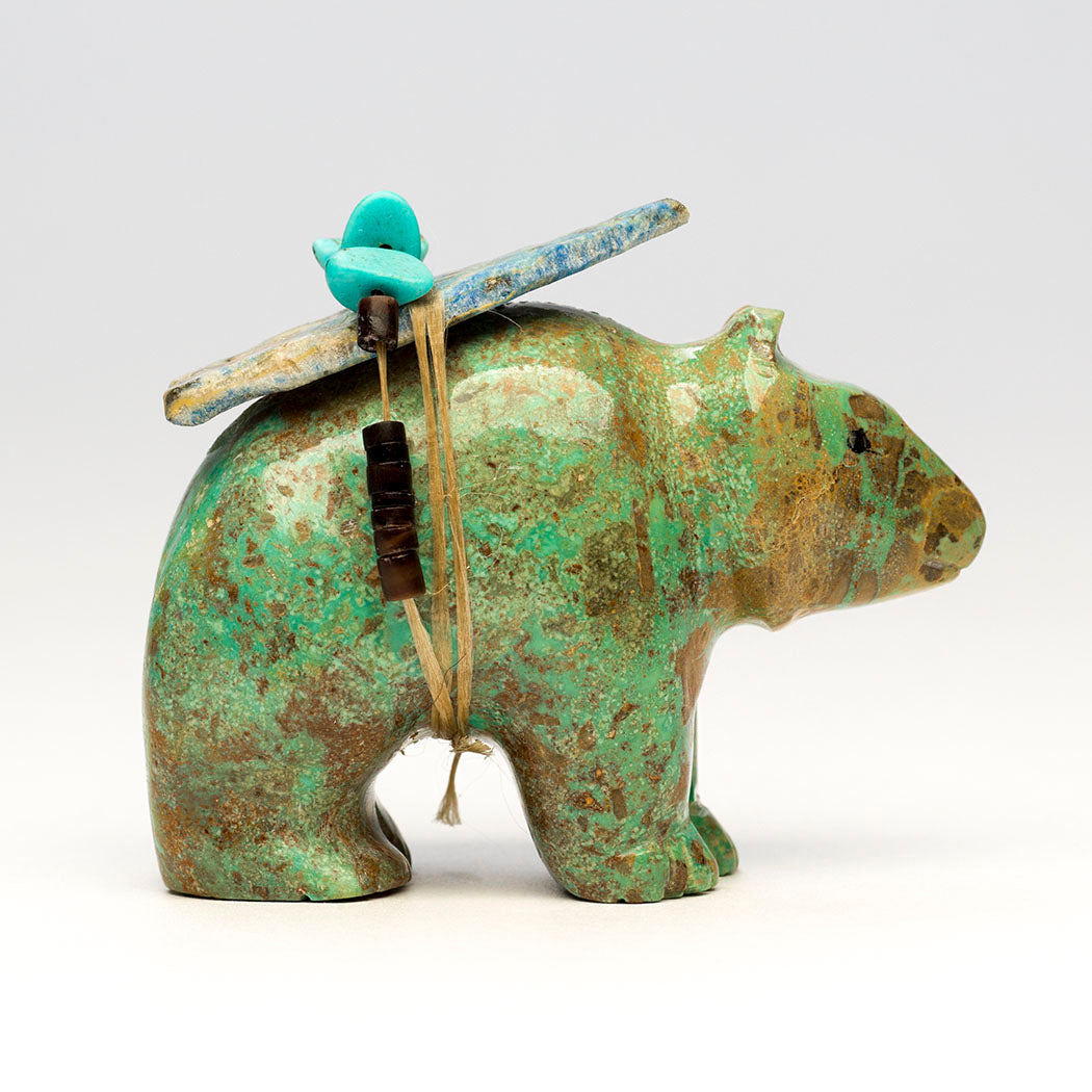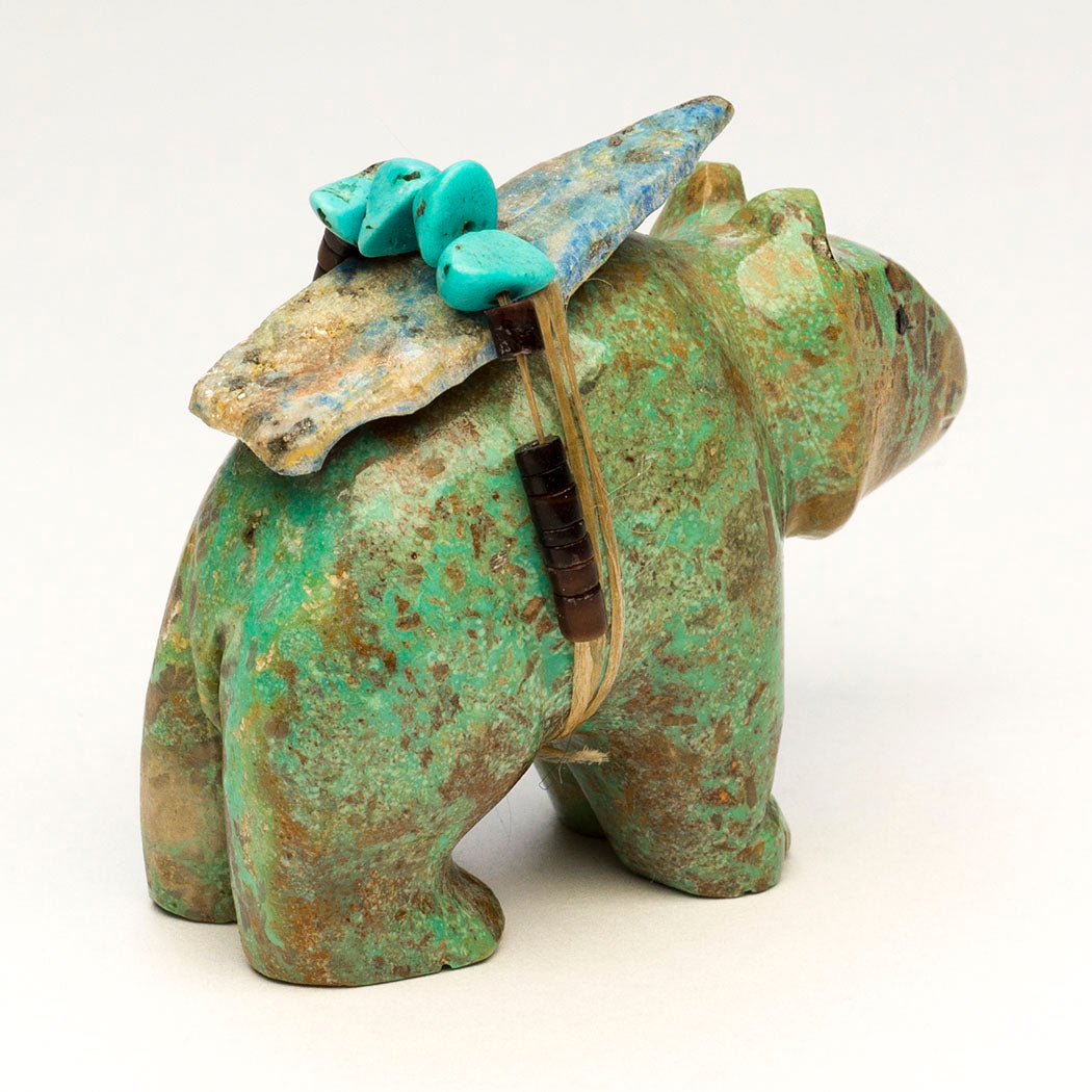 On a foraging trip in the Zuni mountains, Bryston Bowannie's Bear cub follows close behind mother learning how to identify good eats. Smoothly sculpted from a greener variety of turquoise, this pen shell-eyed baby has an extraordinary offering bundle consisting of a denim lapis point with heishe and turquoise beads. About 2 3/8" long, 1 1/8" wide and 2" tall.