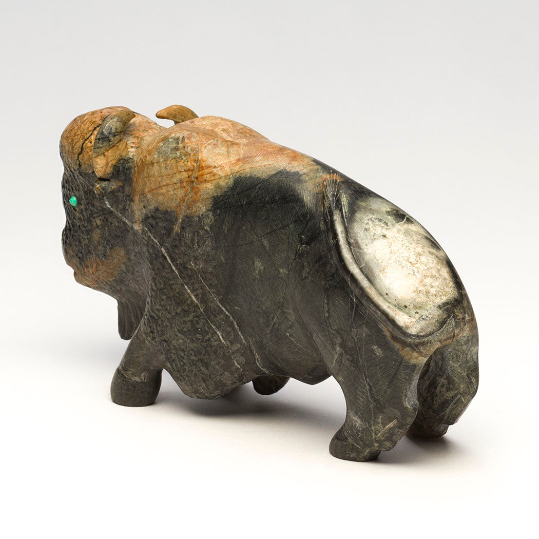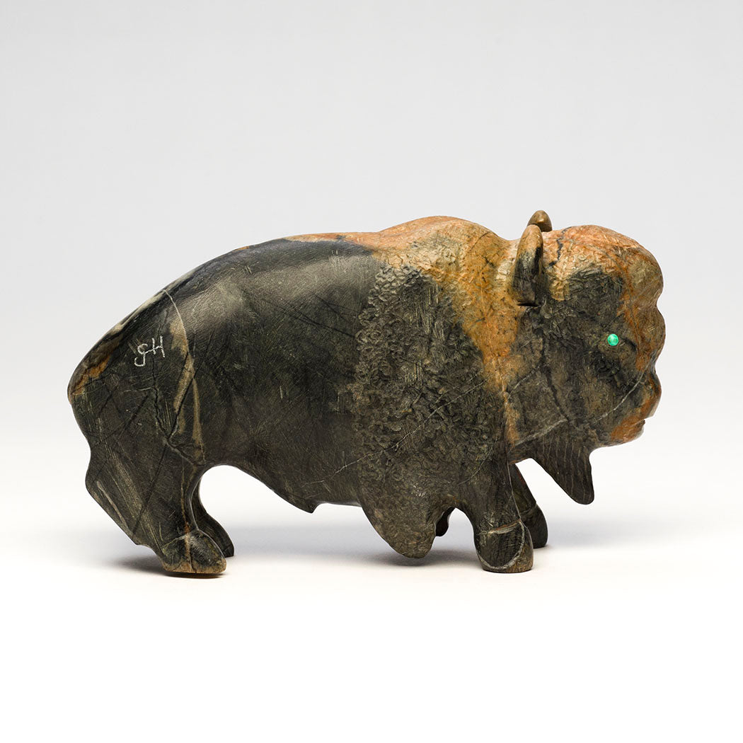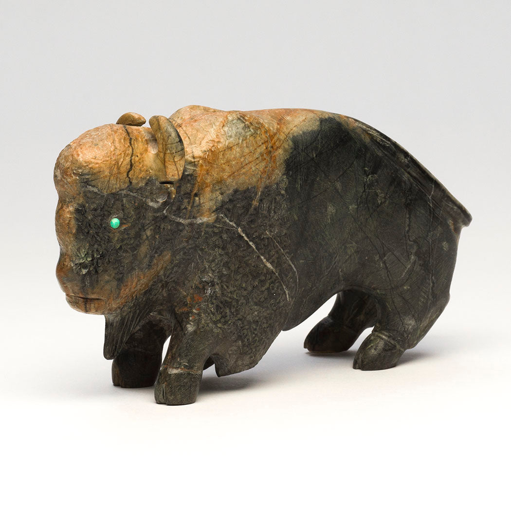 Millions of sacred Bison roamed across North America. They were almost hunted to extinction by European colonizers. These powerful animals are woven into the culture of Indigenous Peoples who relied on them as a major resource for everything from food to fuel. This explains why the animal medicine associated with bison is about abundance and prayers. Clive Hustito's wonderful bison carries much power and reminders to be thankful for another year, carved from Picasso marble to a size of approximately 6" long, 2 1/8" wide and 3 3/8" tall. Bright eyes are from turquoise inlays. His incised initials appear on the hip region.
