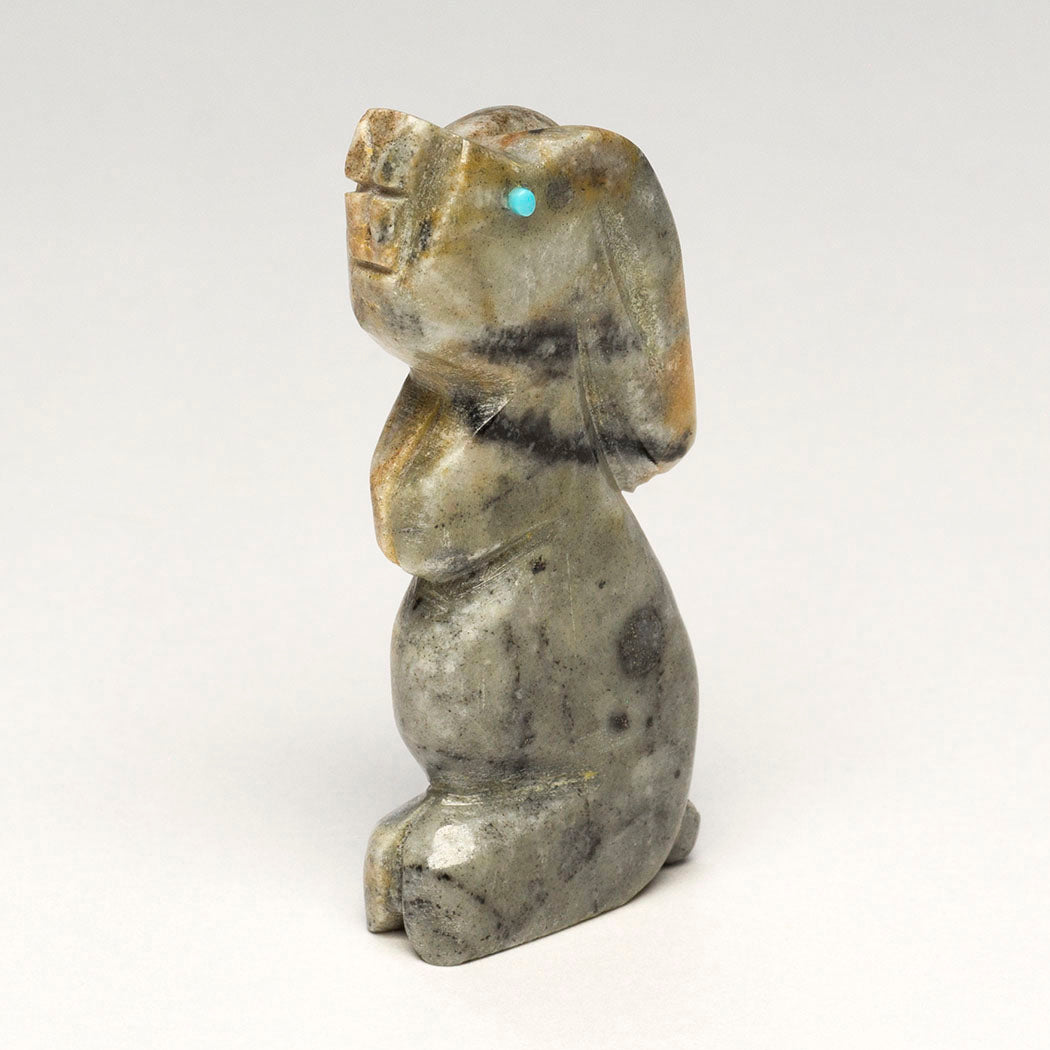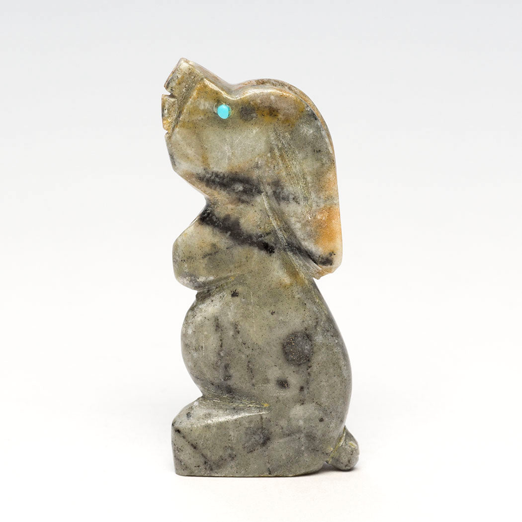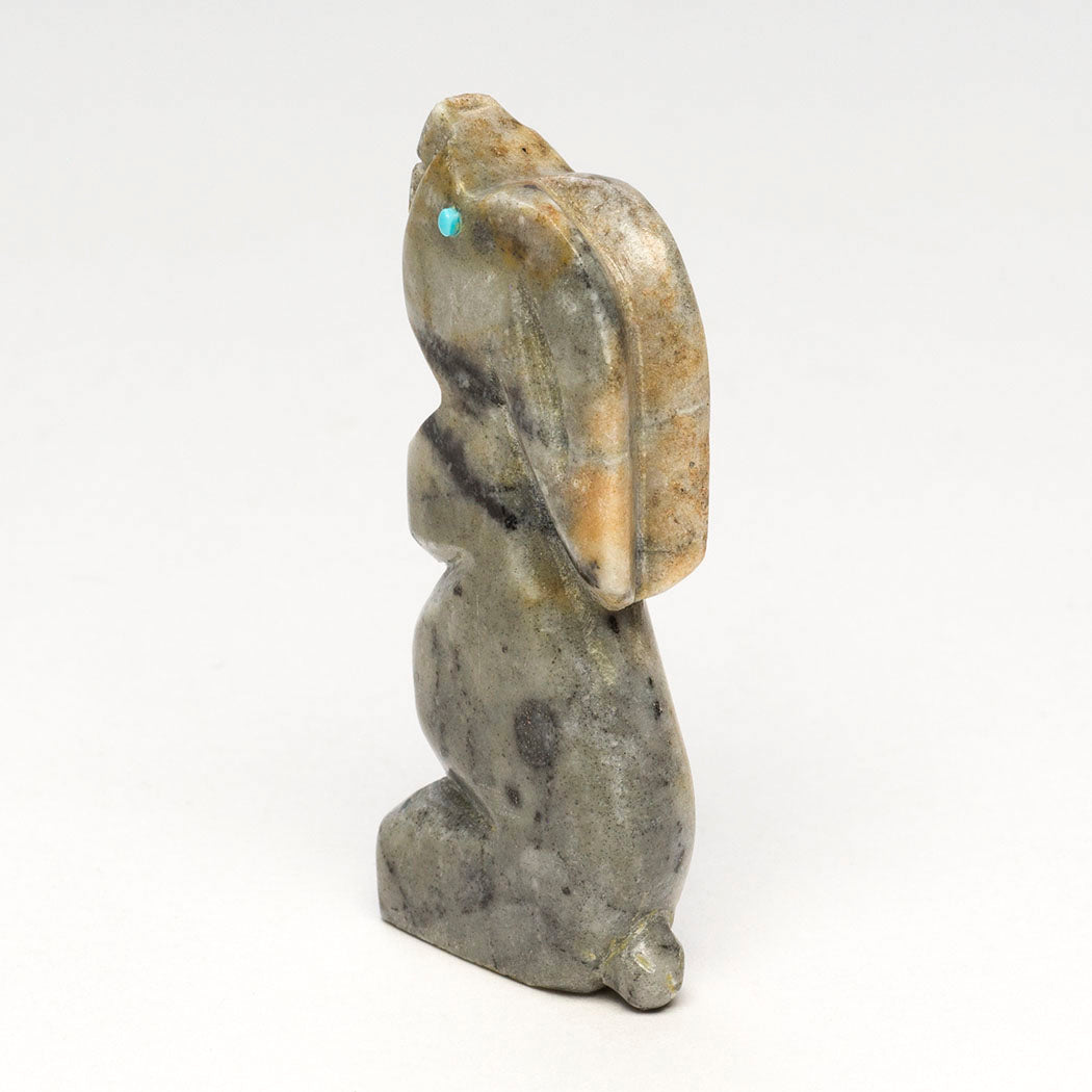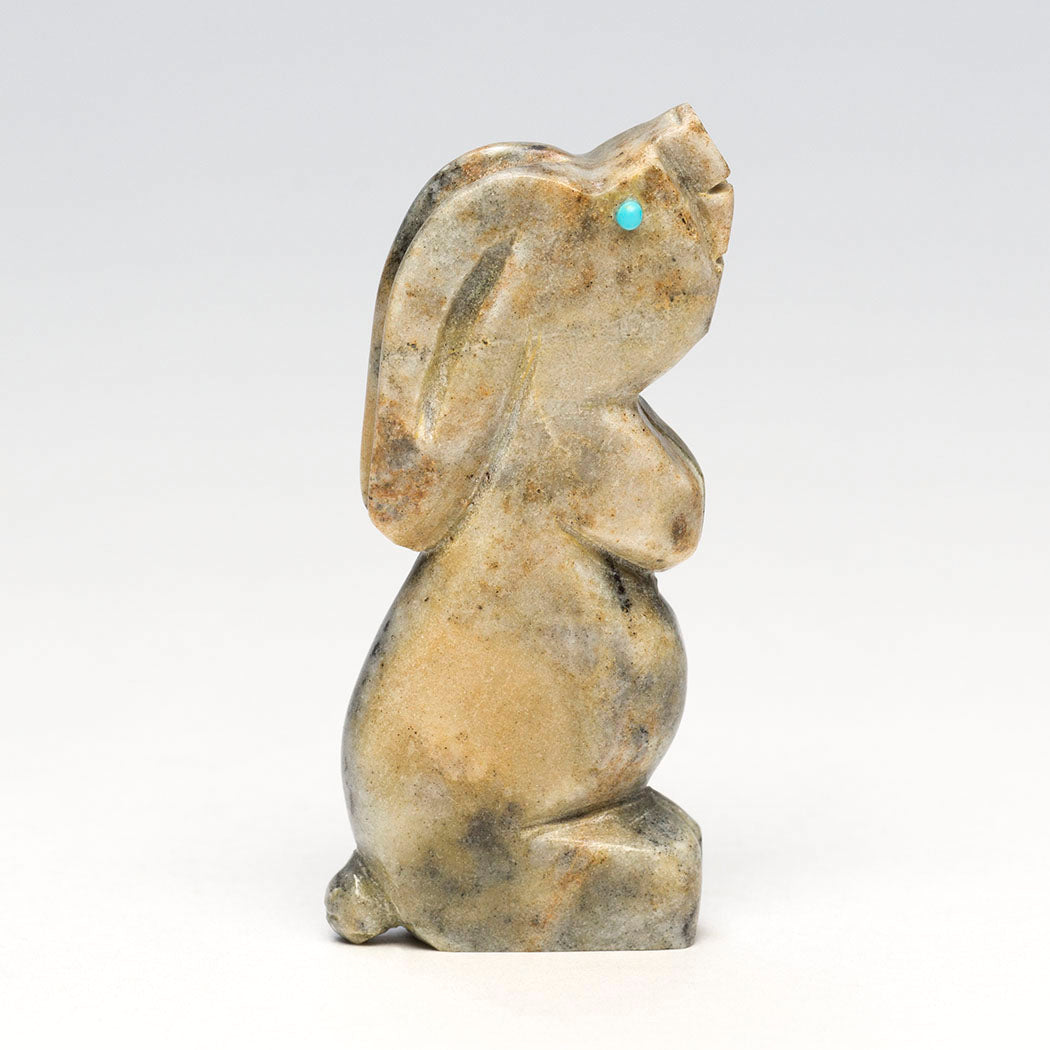 bunny knows a raptor circles overhead. It'll retreat to the safety of a brush pile nearby. A rabbit's animal medicine or example in nature teaches us to face our fears so they don't impair us. We can build resilience by feeling the fear without running away. Sweetly carved from Picasso marble, this turquoise-eyed cottontail is about 2 3/8" tall, 3/8" wide and 1" deep by Cody Chavez.