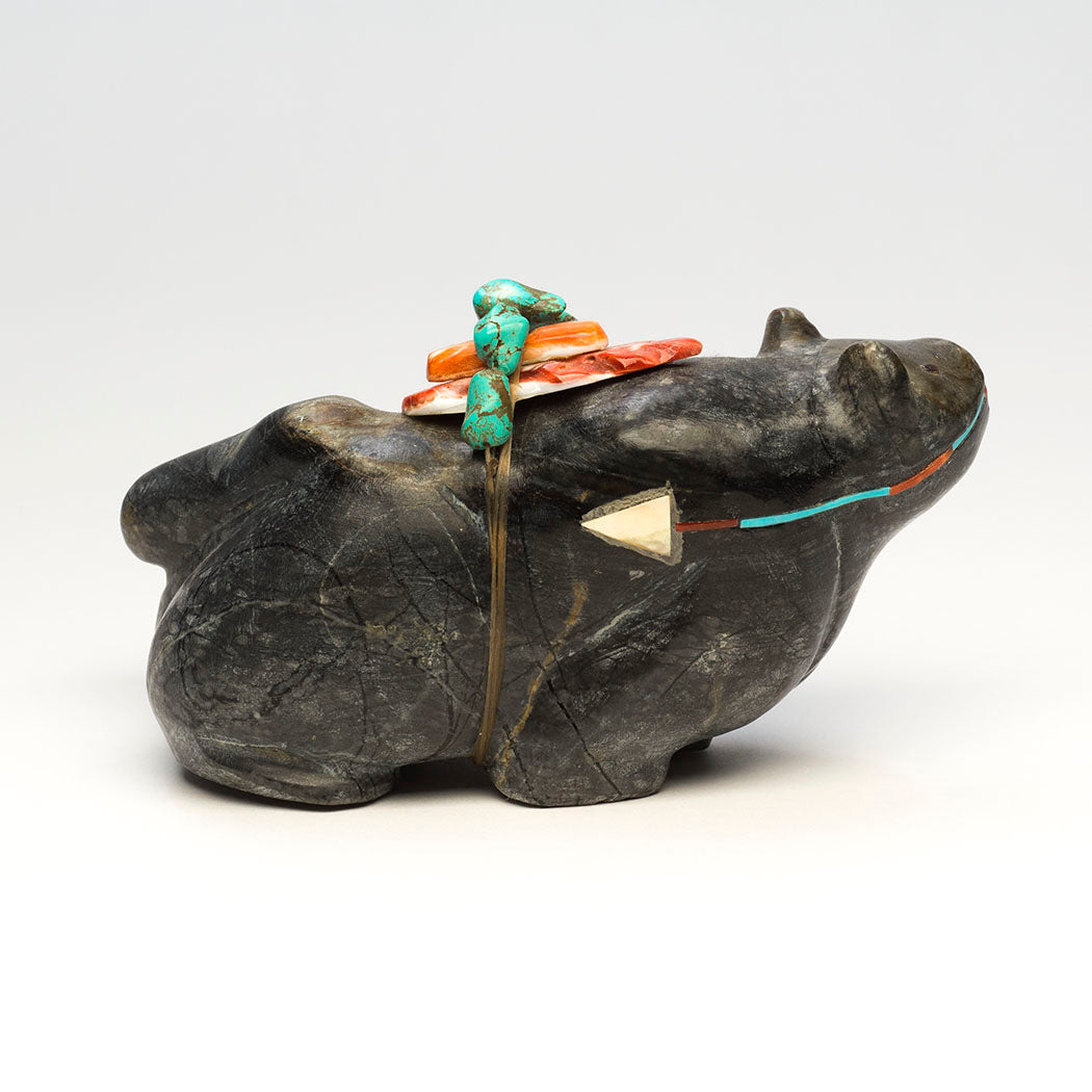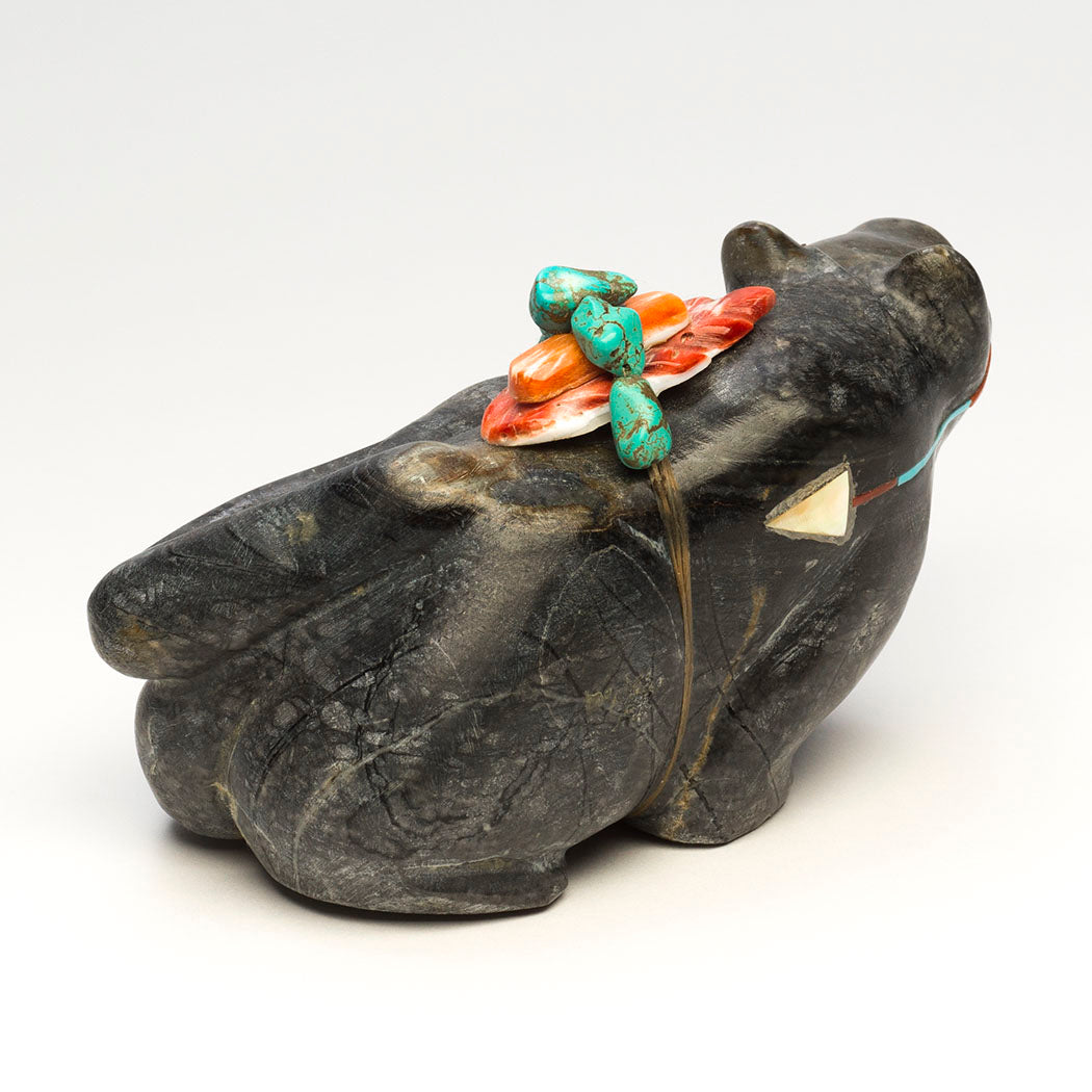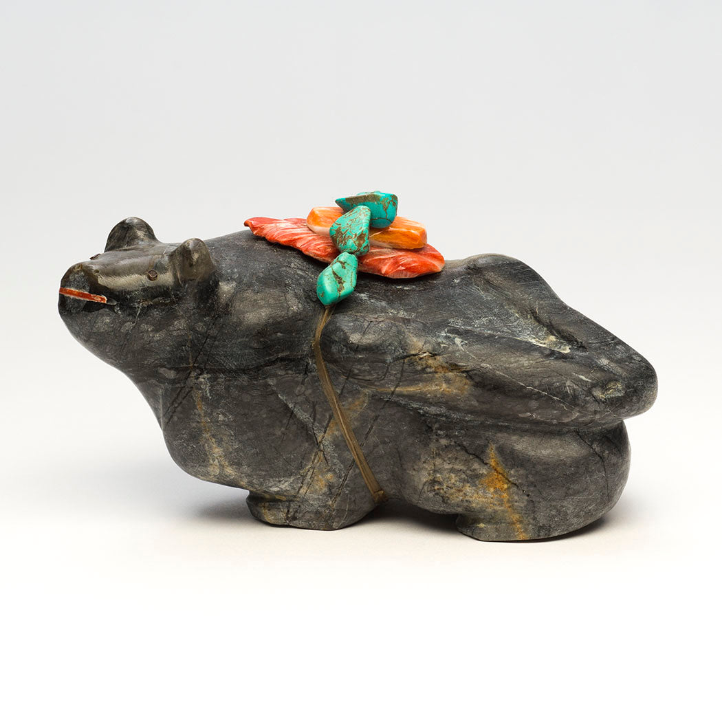 We must be brave like a Mountain-lion (puma, panther or cougar) who establishes and maintains home-range boundaries. They inspire us to create safe spaces for ourselves. Hayes Leekya carved this approximately 5 1/2" long, 2 5/8" wide and 3 1/4" tall wonderful cat from a richly-imbued Picasso marble. Sweet eyes are from pen shell inlays and a handsome heartline or breath path is from alternating pieces of coral, turquoise and iridescent gold lip shell. An offering bundle has turquoise nugget beads with two points from orange and red spiny oyster shells. We must mention the gorgeous tail on this feline, it's amazing.