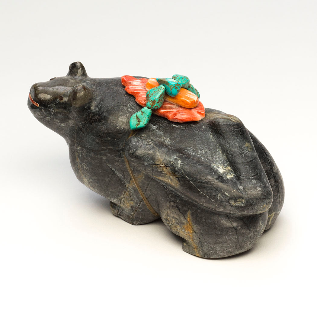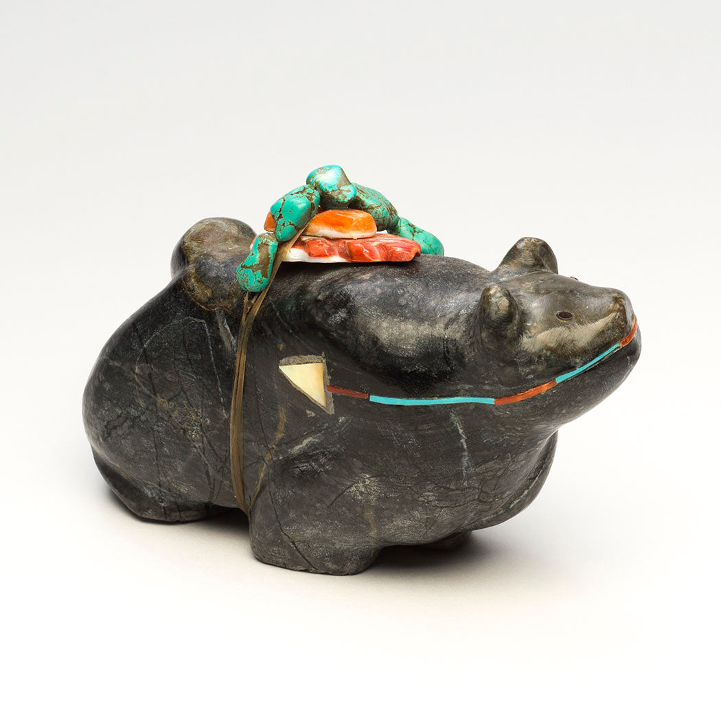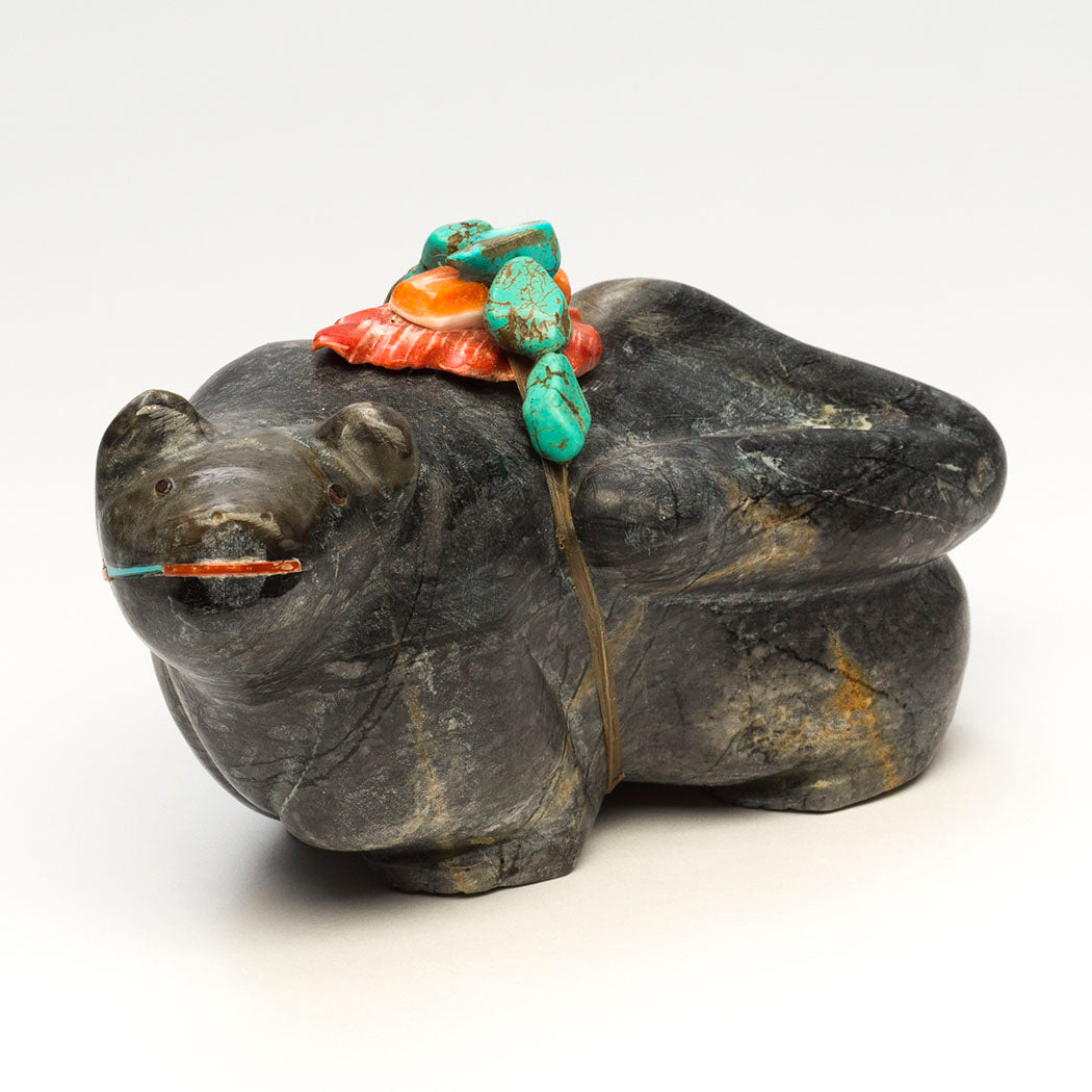 We must be brave like a Mountain-lion (puma, panther or cougar) who establishes and maintains home-range boundaries. They inspire us to create safe spaces for ourselves. Hayes Leekya carved this approximately 5 1/2" long, 2 5/8" wide and 3 1/4" tall wonderful cat from a richly-imbued Picasso marble. Sweet eyes are from pen shell inlays and a handsome heartline or breath path is from alternating pieces of coral, turquoise and iridescent gold lip shell. An offering bundle has turquoise nugget beads with two points from orange and red spiny oyster shells. We must mention the gorgeous tail on this feline, it's amazing.